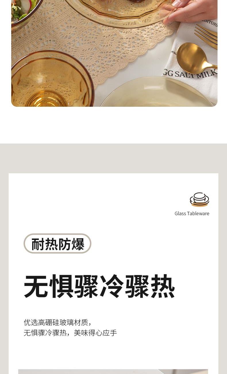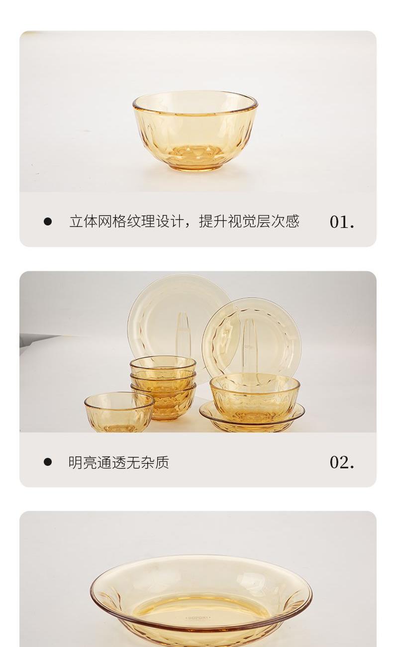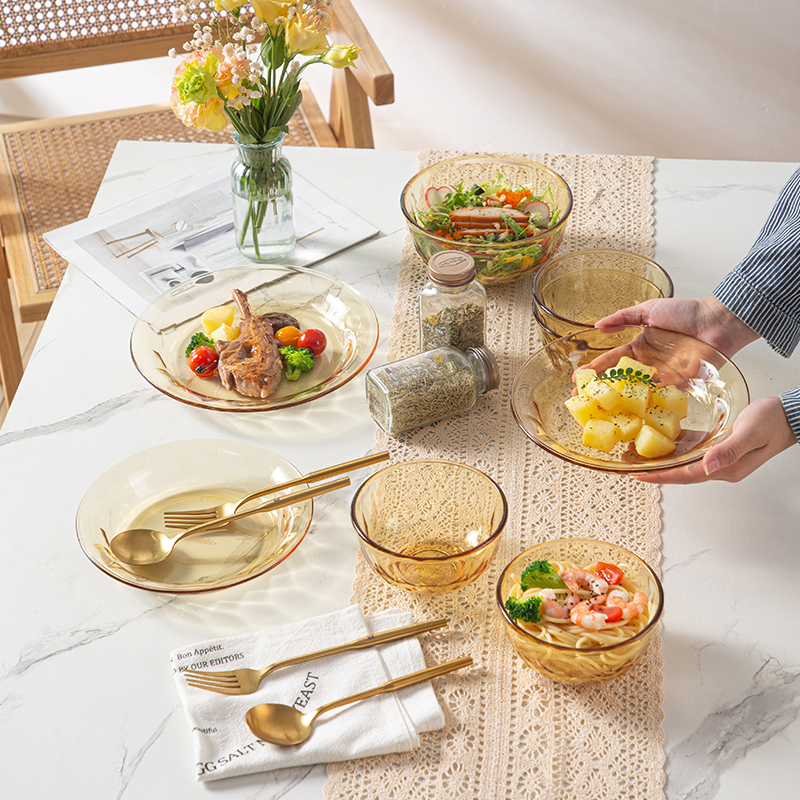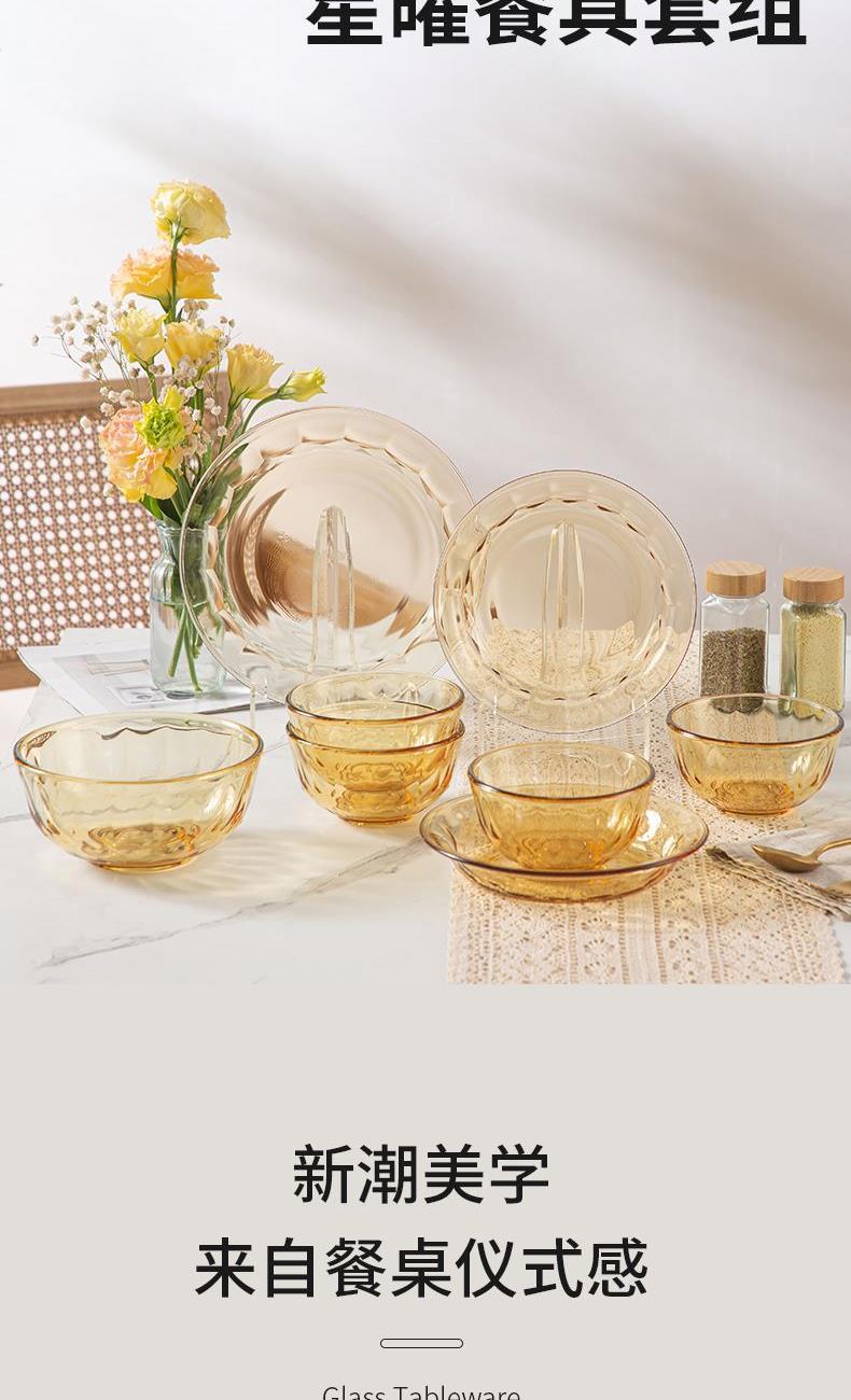 配 置:小碗*4 小盘*2 大盘*1 面碗*1 参 数:小碗12.3x12.3x6.7cm,容量450ml 大碗16.7x16.7x7.3cm,容量1000ml 小盘19.7x19.7x3.3cm 大盘23x23x3cm 颜 色:琥珀色 材 质:玻璃 1:可在微波炉,烤箱中置物使用,耐温差-2~400℃; 2:玻璃表面,容易清洗,不易藏污纳垢,不需要用钢丝球类清洁用品清洗产品; 3:高硼硅材质,天然矿砂 1700 度高温烧制去除杂质后形成琥珀色,不用担心掉色,食品安全无忧。 4:玻璃餐具的耐用性较强,正常使用情况下,其使用寿命相对较长。与一些一次性餐具或容易损坏的餐具相比,玻璃餐具能够减少因频繁更换餐具而产生的资源浪费和垃圾产生,是一种更加环保、经济的选择。