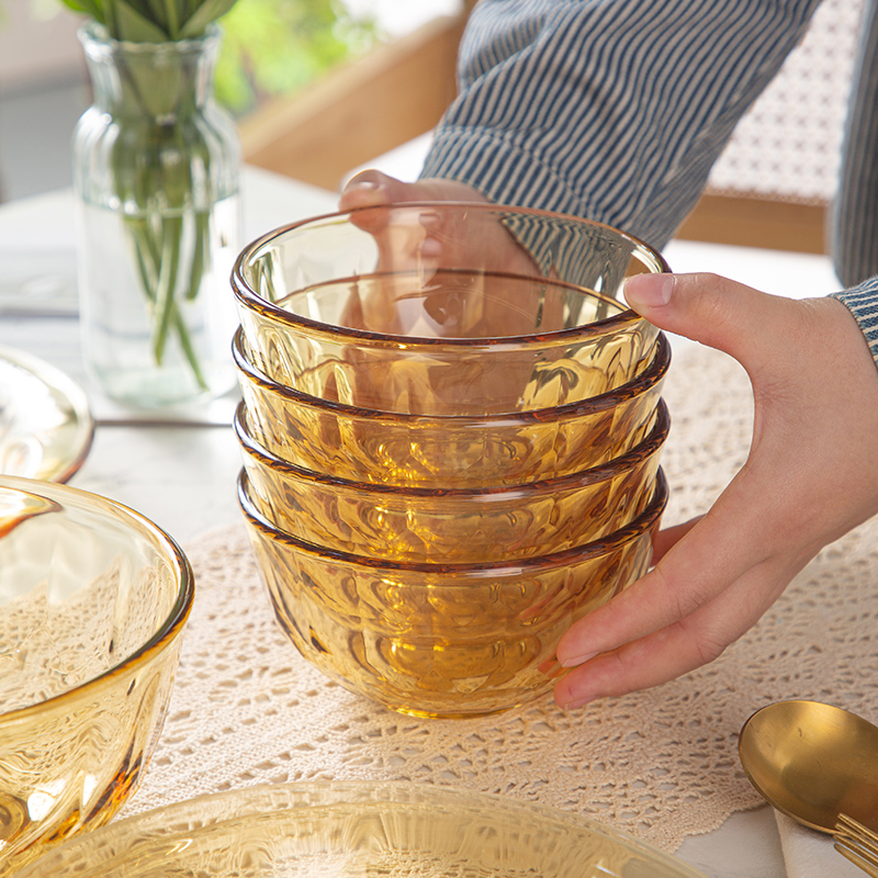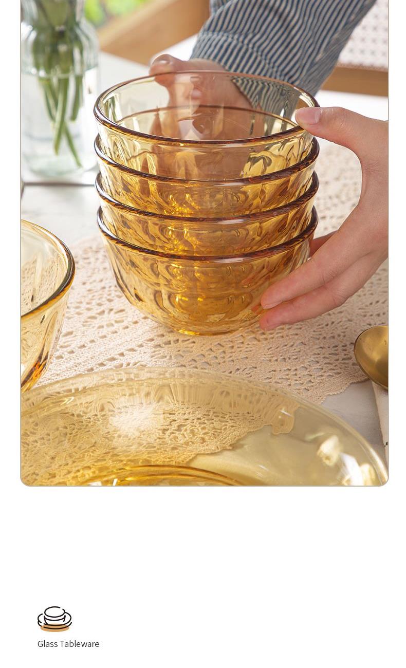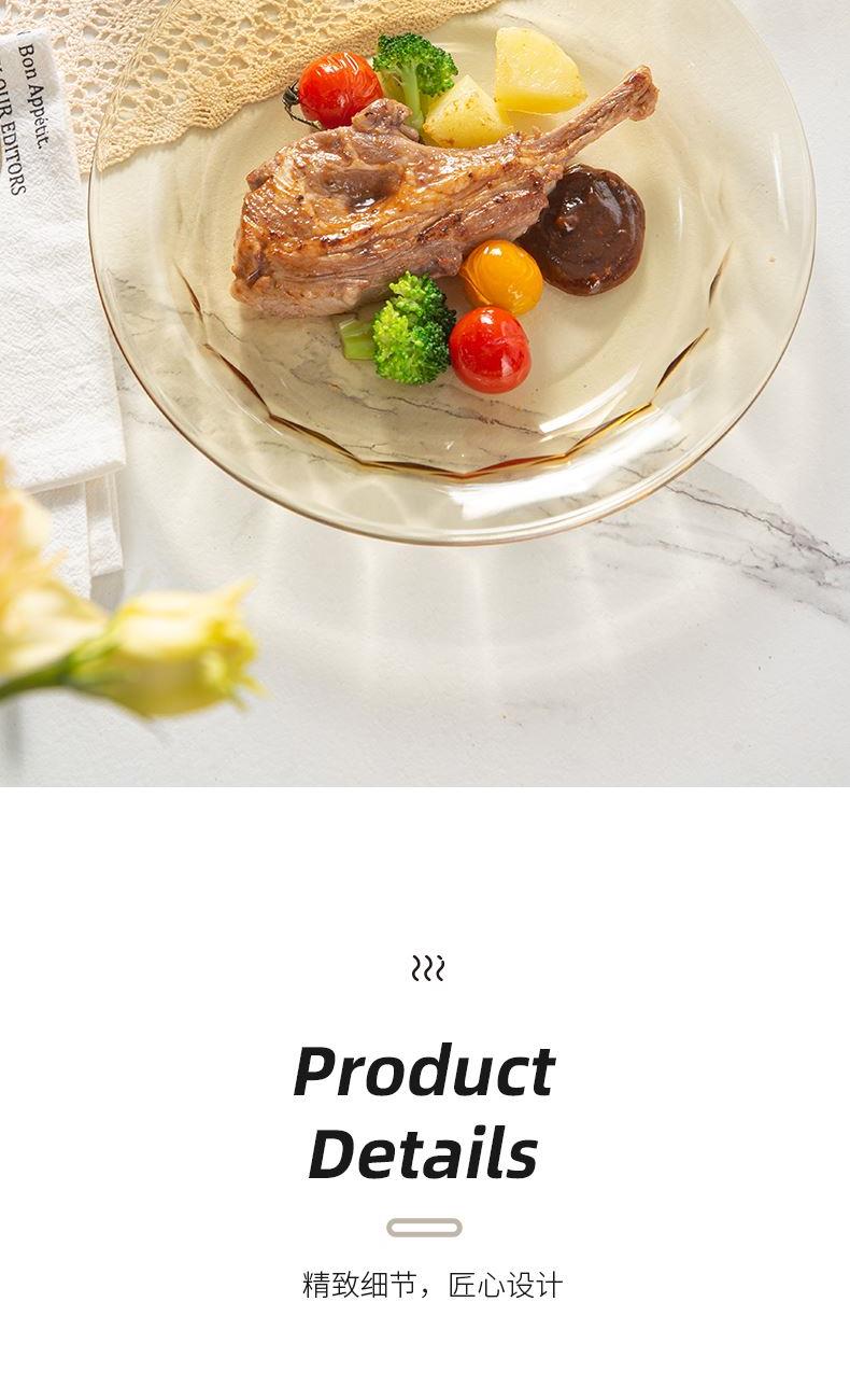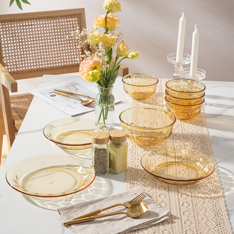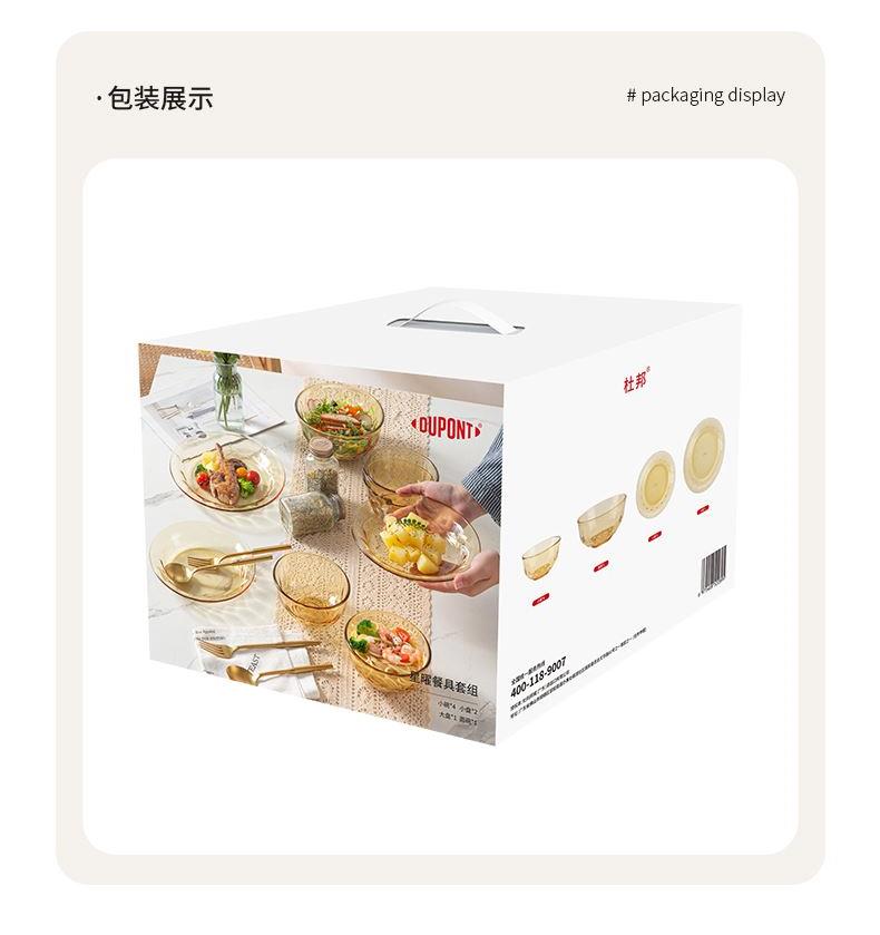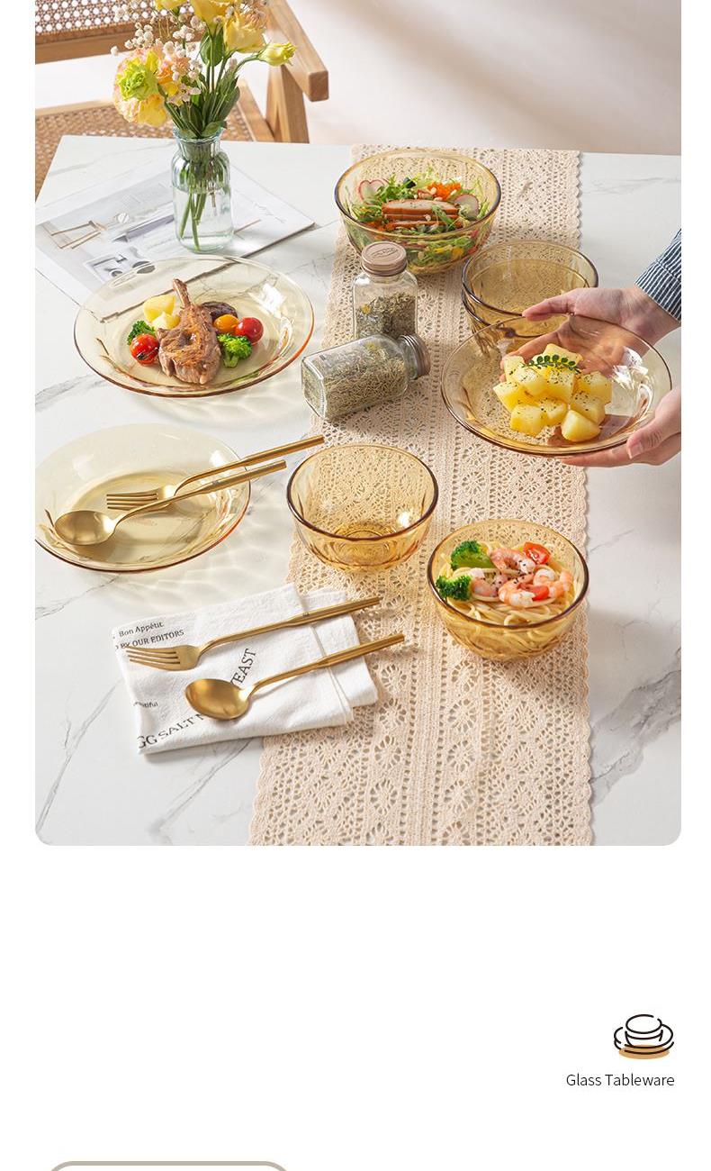 配 置:小碗*4 小盘*2 大盘*1 面碗*1 参 数:小碗12.3x12.3x6.7cm,容量450ml 大碗16.7x16.7x7.3cm,容量1000ml 小盘19.7x19.7x3.3cm 大盘23x23x3cm 颜 色:琥珀色 材 质:玻璃 1:可在微波炉,烤箱中置物使用,耐温差-2~400℃; 2:玻璃表面,容易清洗,不易藏污纳垢,不需要用钢丝球类清洁用品清洗产品; 3:高硼硅材质,天然矿砂 1700 度高温烧制去除杂质后形成琥珀色,不用担心掉色,食品安全无忧。 4:玻璃餐具的耐用性较强,正常使用情况下,其使用寿命相对较长。与一些一次性餐具或容易损坏的餐具相比,玻璃餐具能够减少因频繁更换餐具而产生的资源浪费和垃圾产生,是一种更加环保、经济的选择。