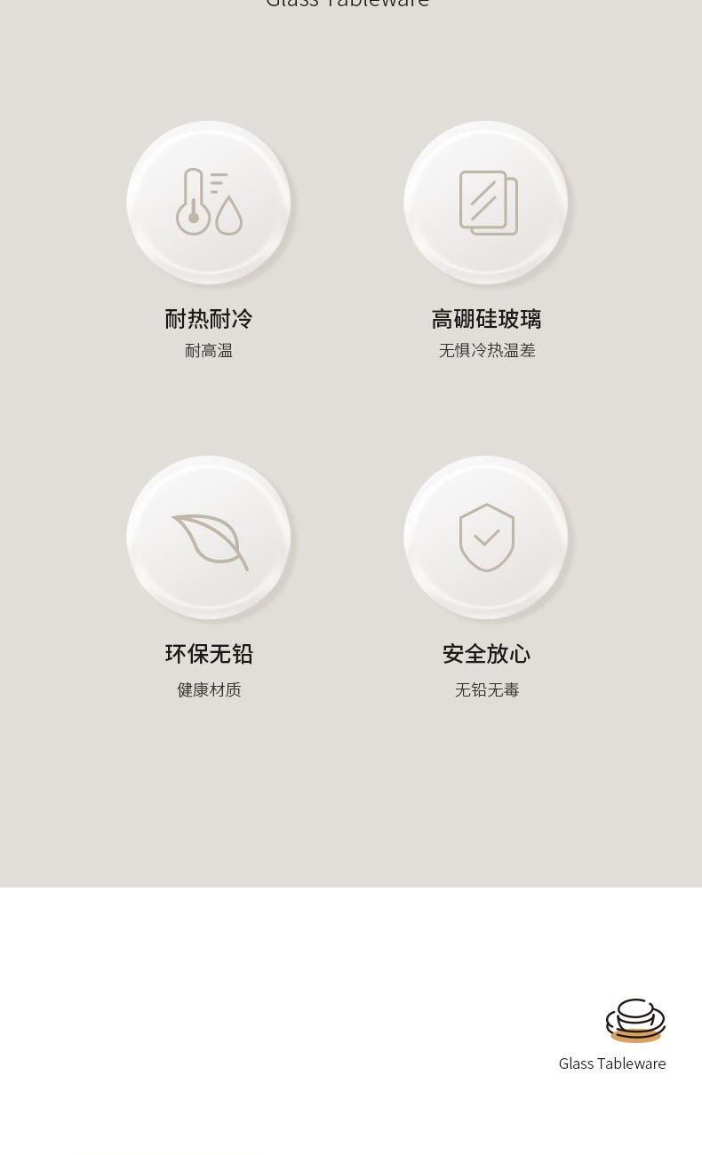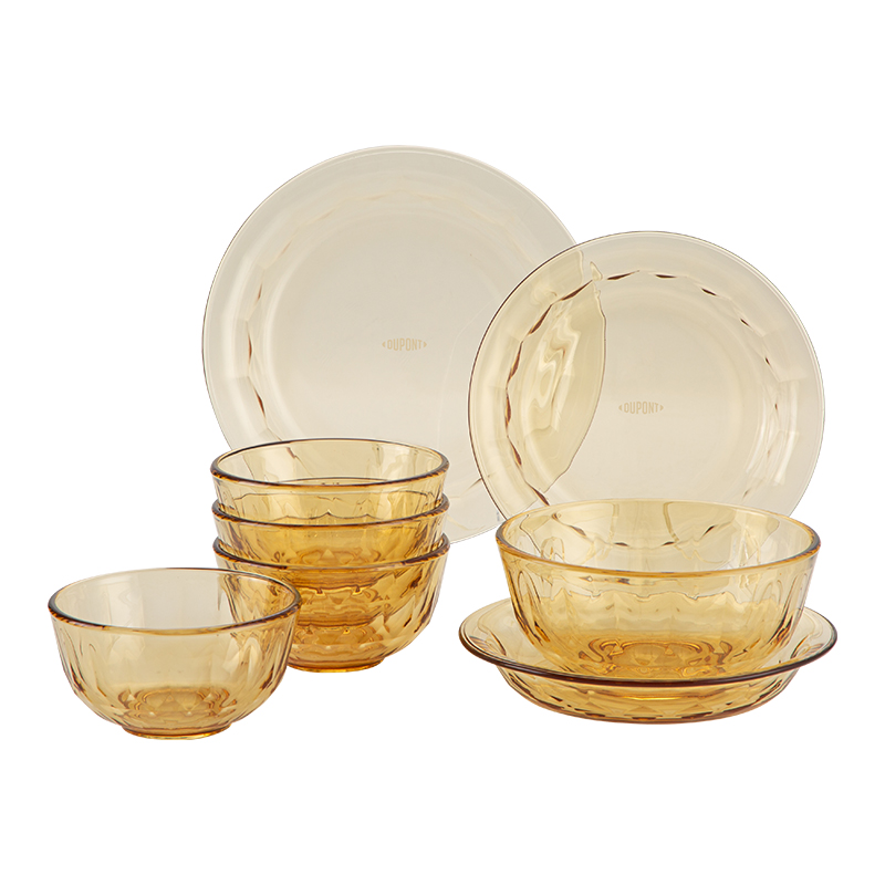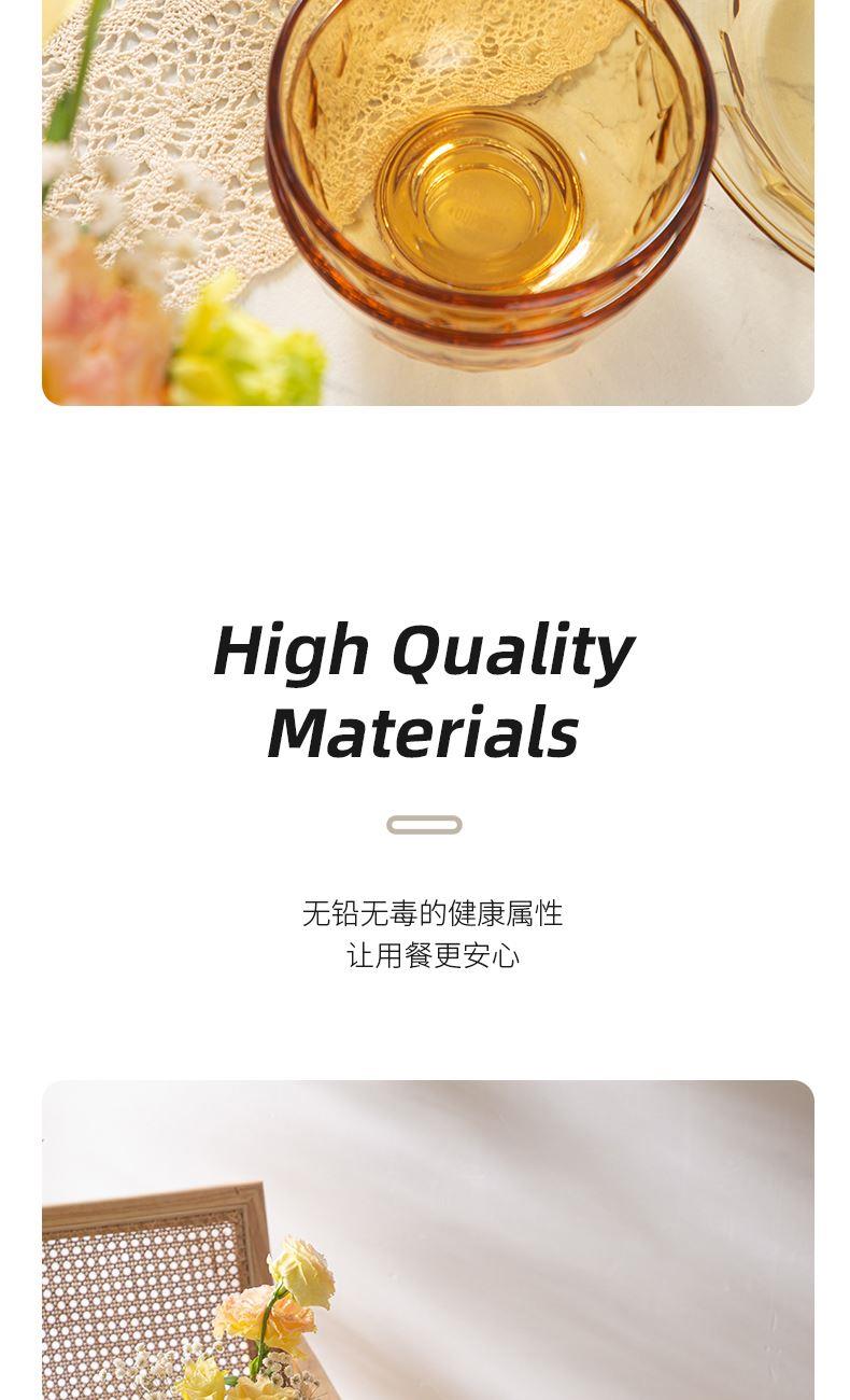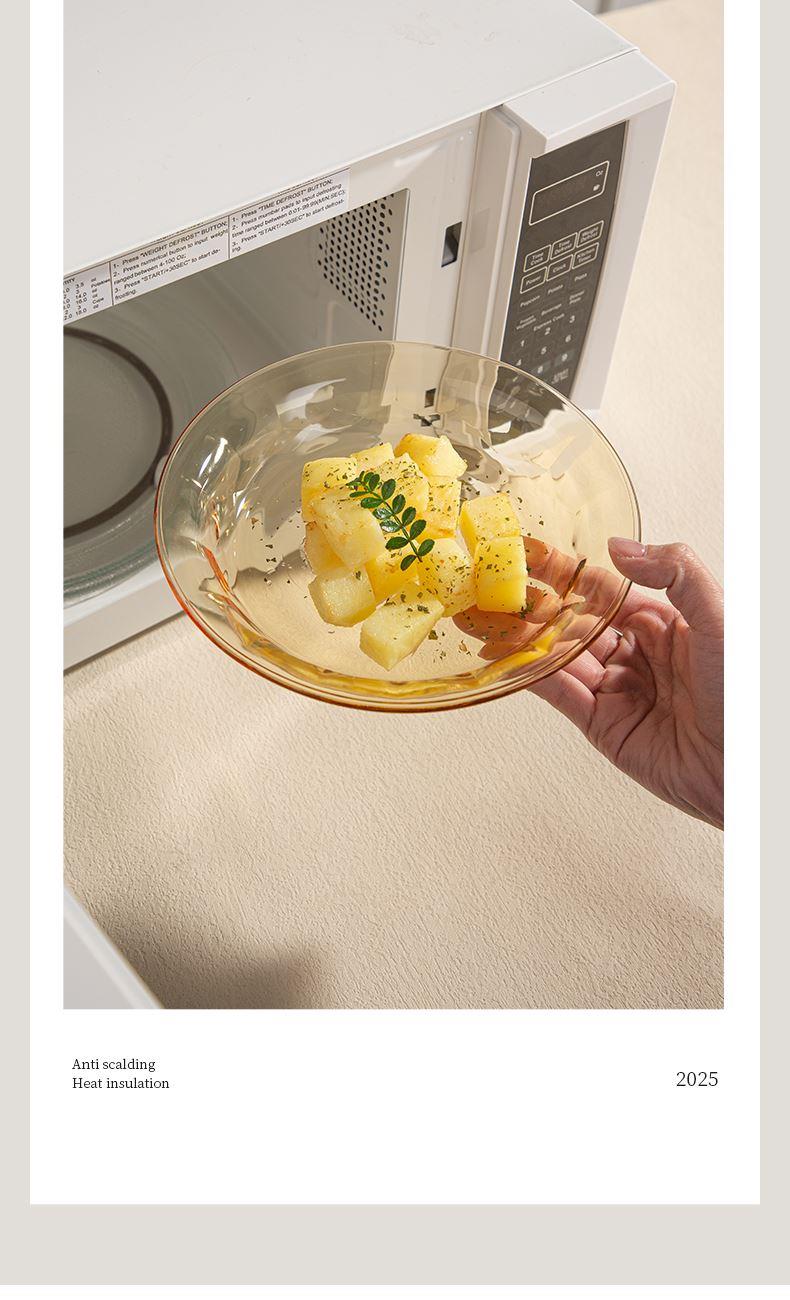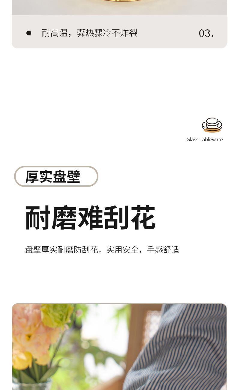 配 置:小碗*4 小盘*2 大盘*1 面碗*1 参 数:小碗12.3x12.3x6.7cm,容量450ml 大碗16.7x16.7x7.3cm,容量1000ml 小盘19.7x19.7x3.3cm 大盘23x23x3cm 颜 色:琥珀色 材 质:玻璃 1:可在微波炉,烤箱中置物使用,耐温差-2~400℃; 2:玻璃表面,容易清洗,不易藏污纳垢,不需要用钢丝球类清洁用品清洗产品; 3:高硼硅材质,天然矿砂 1700 度高温烧制去除杂质后形成琥珀色,不用担心掉色,食品安全无忧。 4:玻璃餐具的耐用性较强,正常使用情况下,其使用寿命相对较长。与一些一次性餐具或容易损坏的餐具相比,玻璃餐具能够减少因频繁更换餐具而产生的资源浪费和垃圾产生,是一种更加环保、经济的选择。