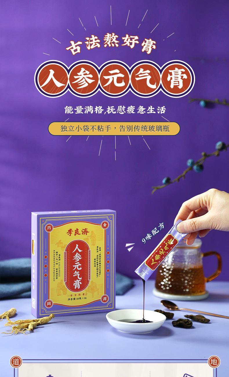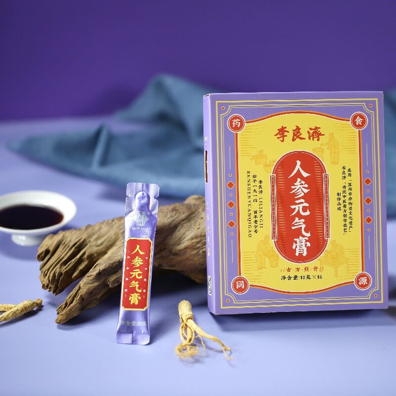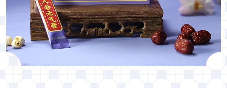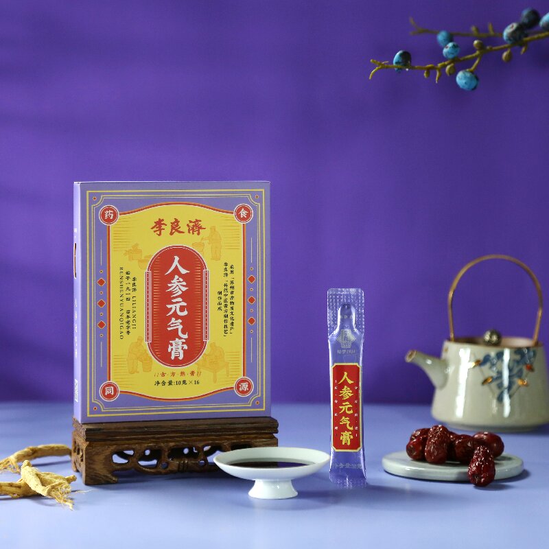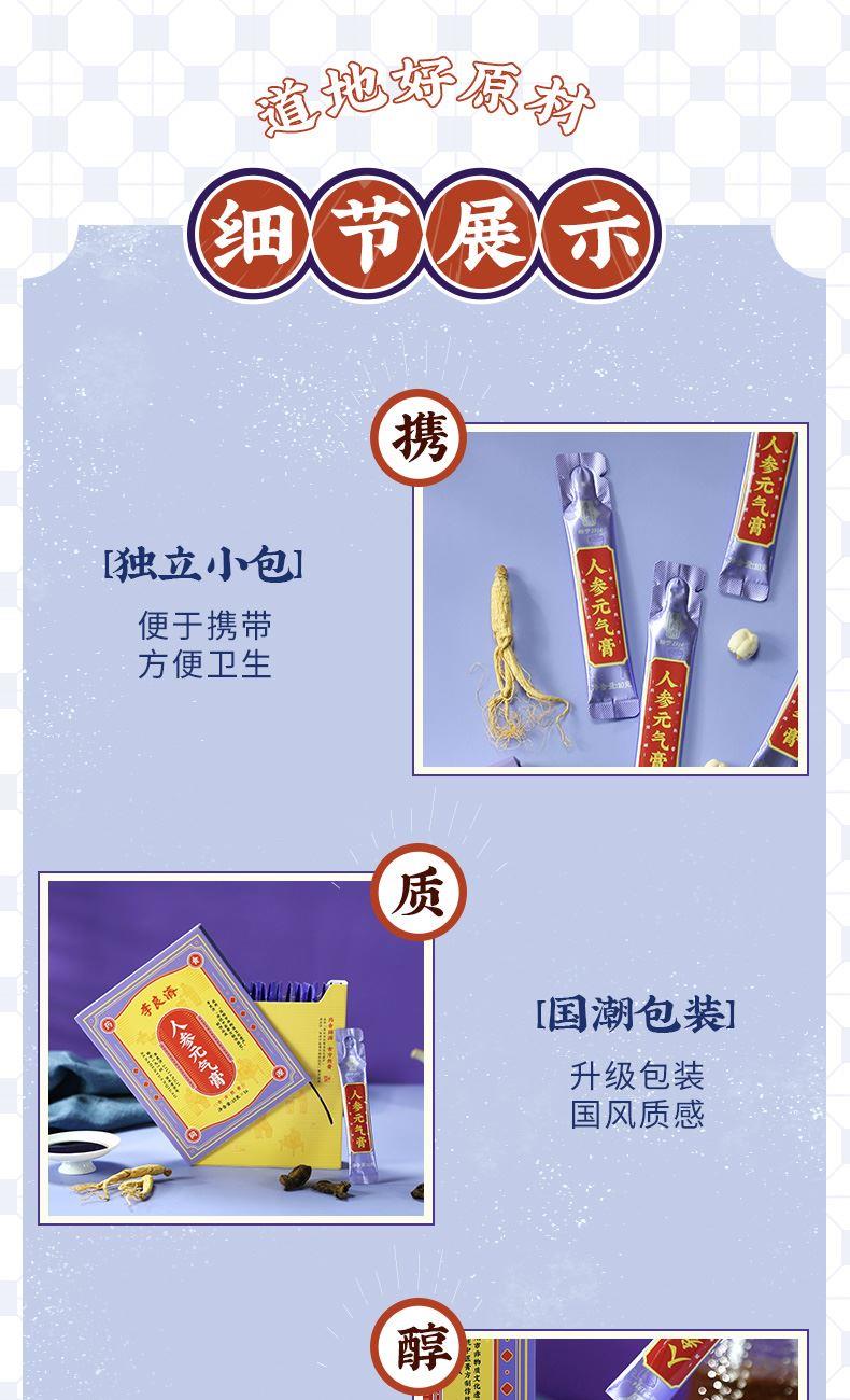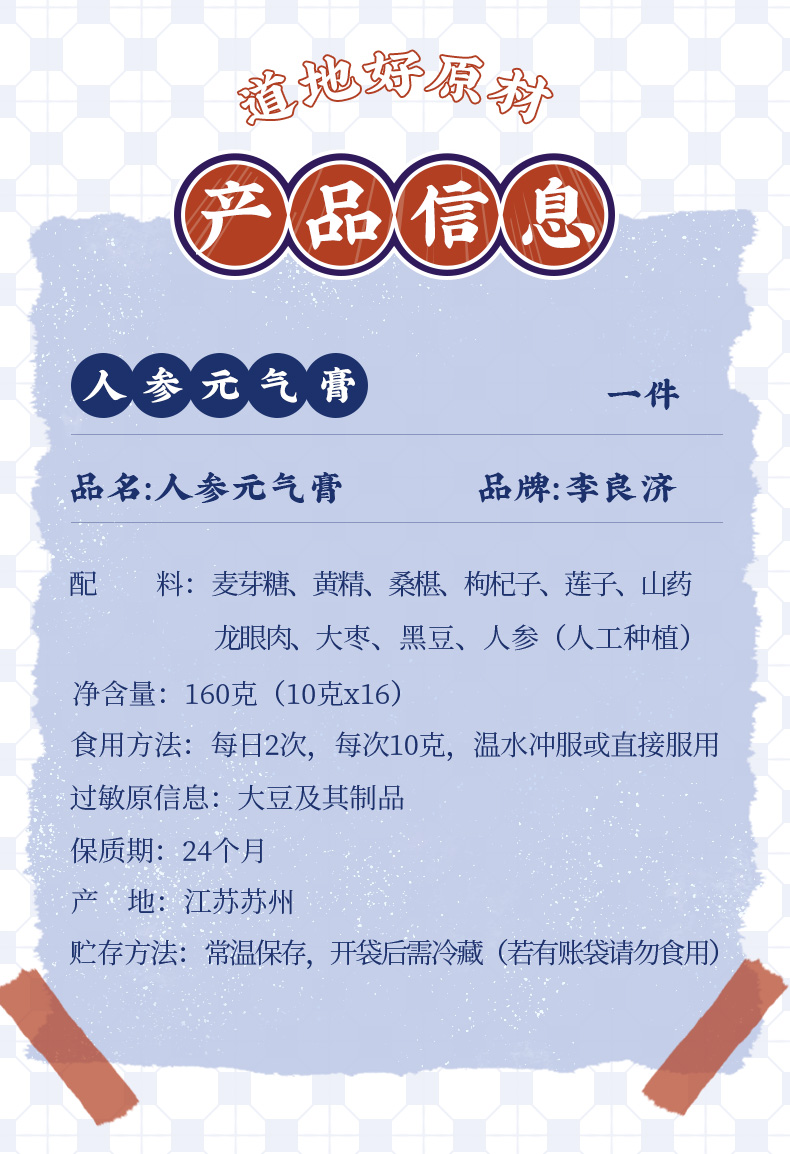 产品:人参元气膏 规格:净含量160克(10g*16条) 配料:人参、枸杞、黄精、龙眼肉等 保质量:24个月 贮藏方法:阴凉干燥通风处存放,防潮,防异味 道地原材,质量上乘,送礼佳选