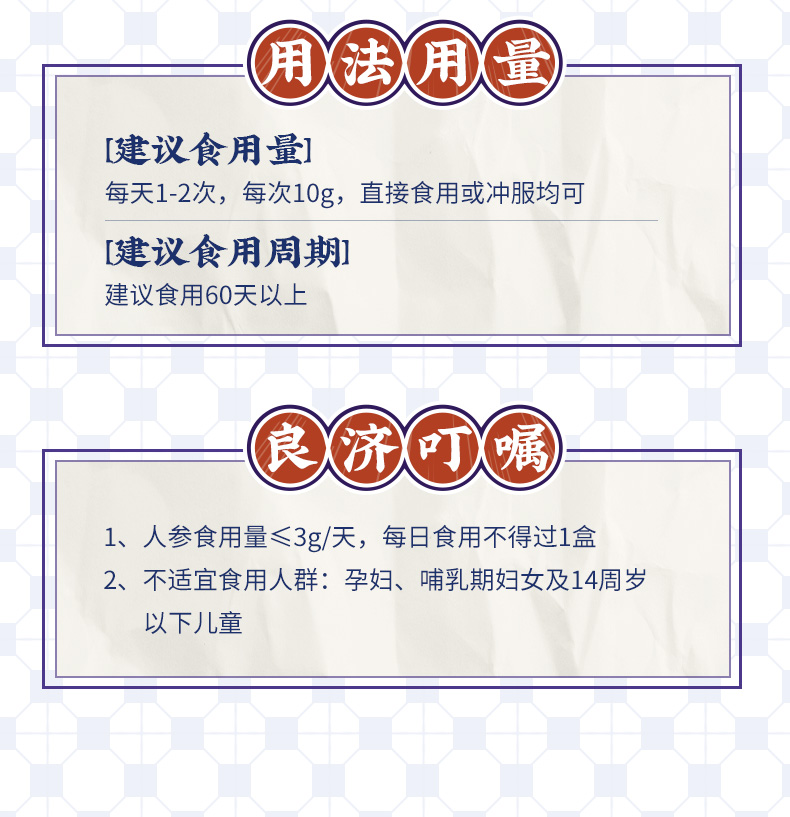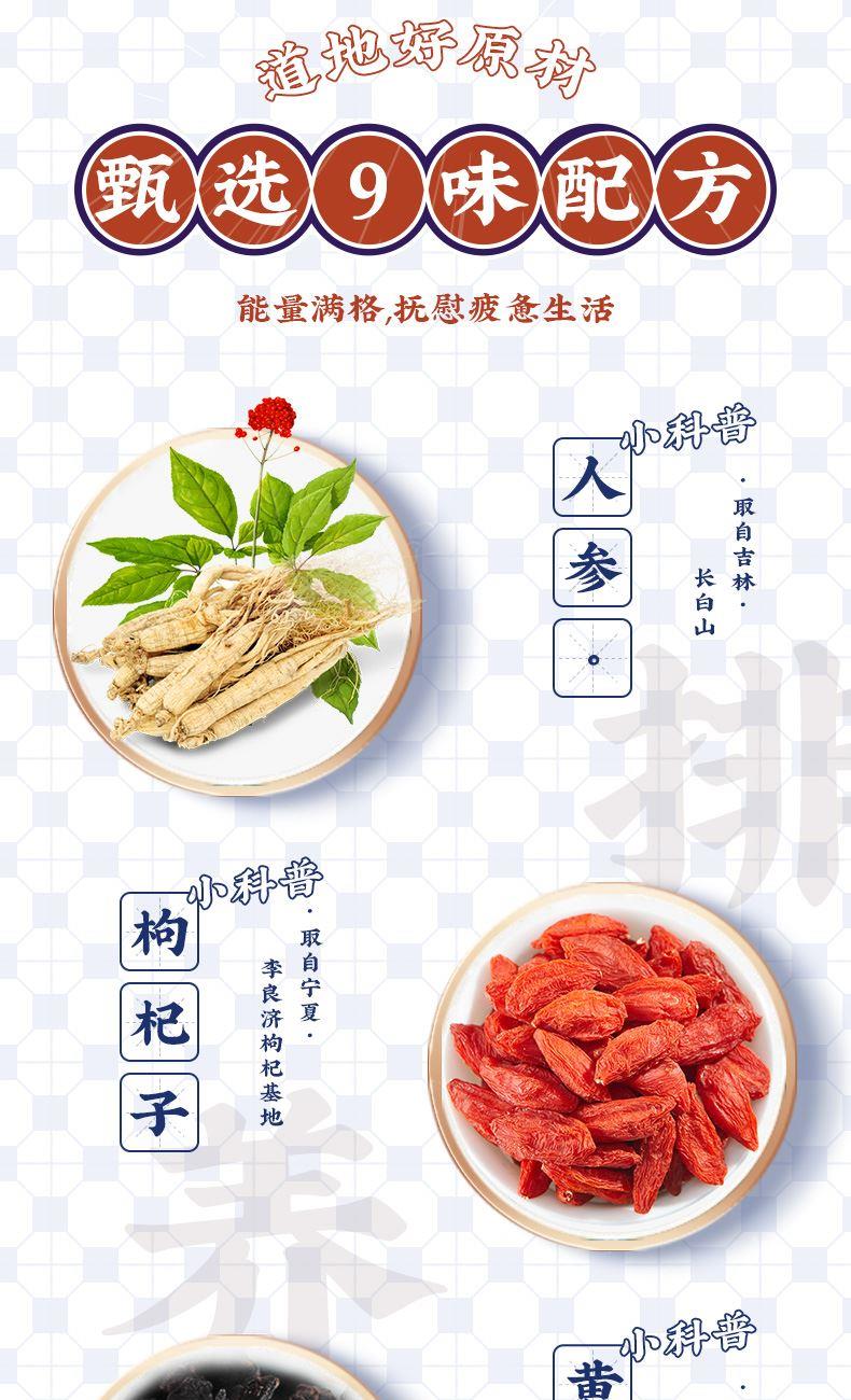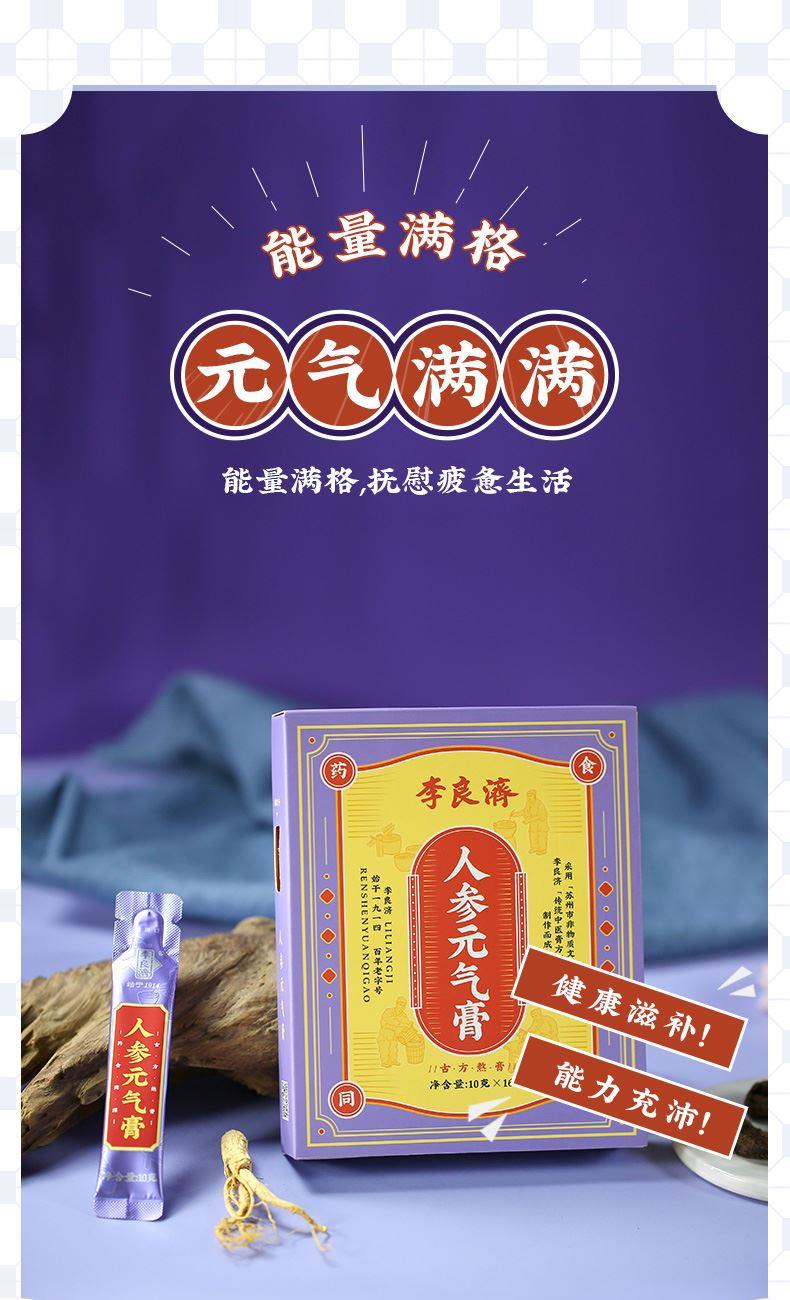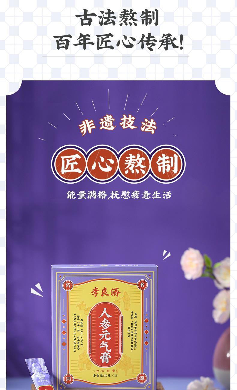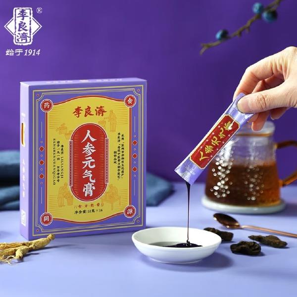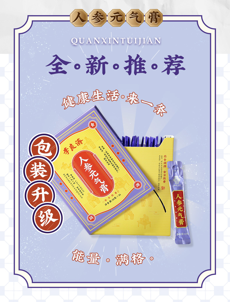 产品:人参元气膏 规格:净含量160克(10g*16条) 配料:人参、枸杞、黄精、龙眼肉等 保质量:24个月 贮藏方法:阴凉干燥通风处存放,防潮,防异味 道地原材,质量上乘,送礼佳选
