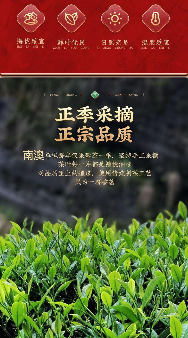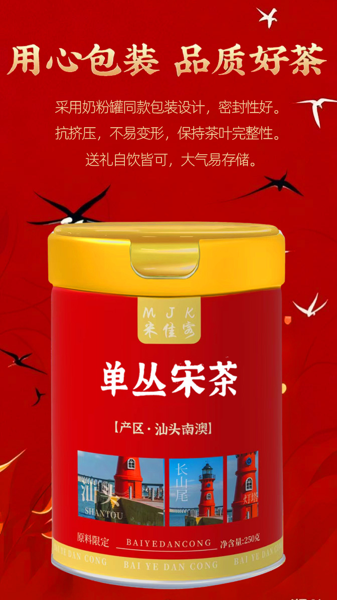 【茶名】:单丛(宋茶) 【型号】:MY250318 【重量】:500g 【配件】:铁罐+礼盒+手提袋 【口味】:清香型 【产地】:广东·南澳 南澳宋茶外形粗壮匀整、乌润有光,细闻干茶香气有农村的自然花香味。冲泡后,香气馥郁、汤色金黄、口感览滑、回甘强、高气长、鲜醇爽口,让人忍不住想品尝。南澳后花园宋茶叶底秀美,柔软有弹性,回甘耐泡,多次冲泡后仍然甘醇,适当延迟下出汤时间,茶香依然持续。