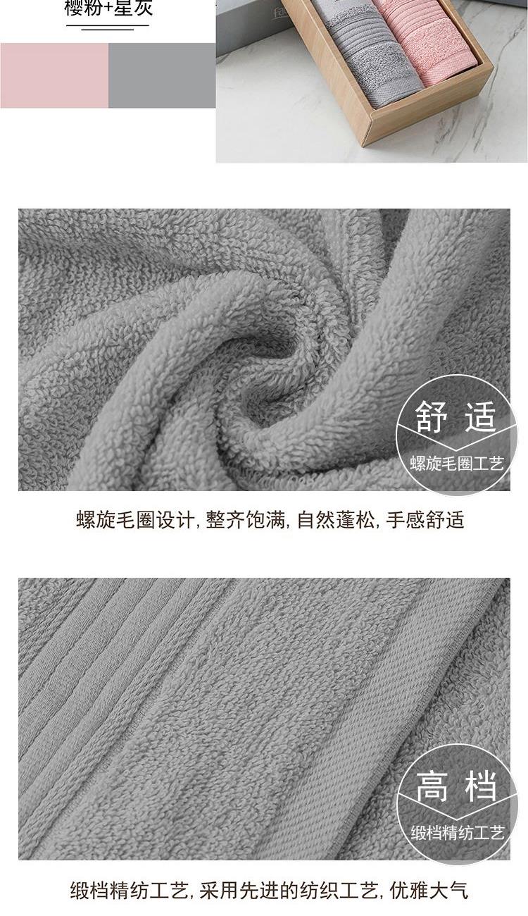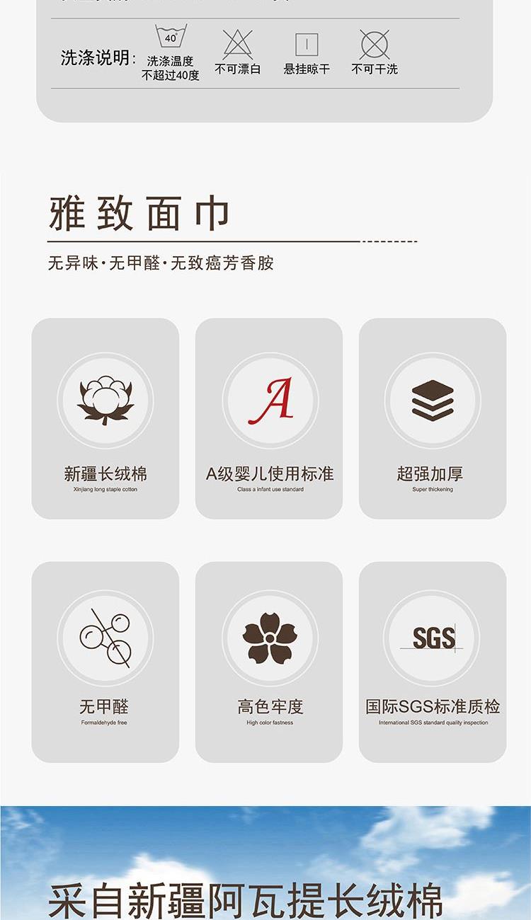 【面巾】×2 面巾克重:95g 面巾规格:75*35 cm (±2cm) 【材 质】新疆长绒棉 1.选用新疆长绒棉,质地柔软,手感舒适,不易掉毛 2.螺旋毛圈设计,整齐饱满,自然蓬松 3.缎档精纺工艺,采用先进的纺织工艺,优雅大气 4.加宽加厚锁边设计,更加整洁美观,结石耐用