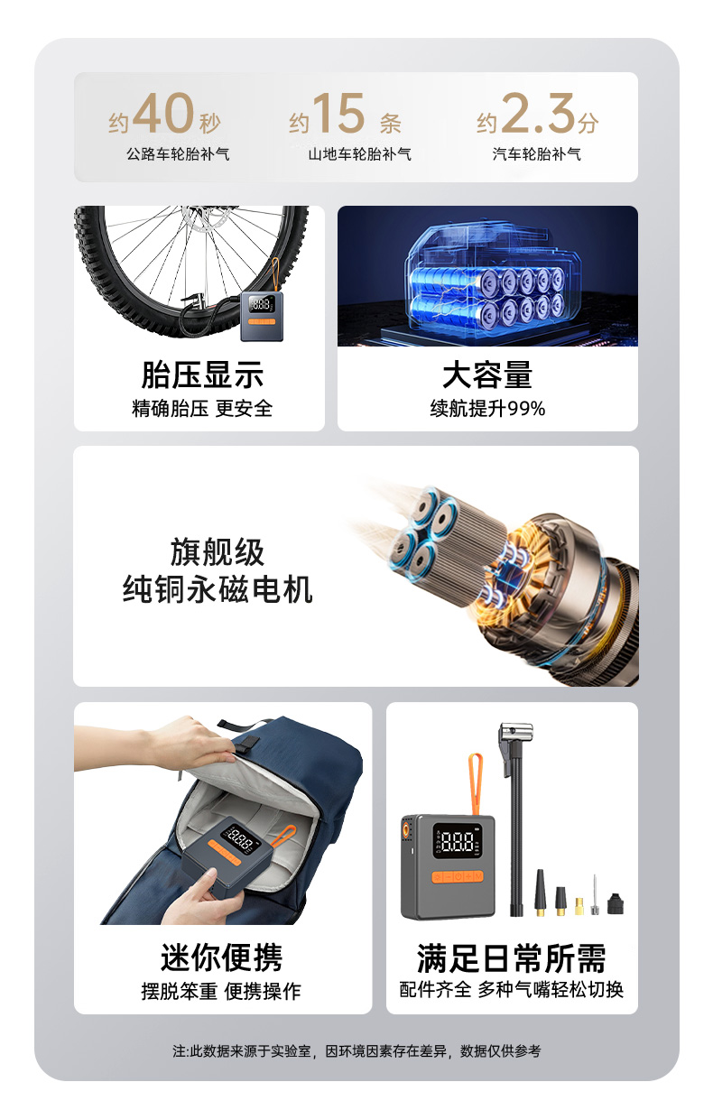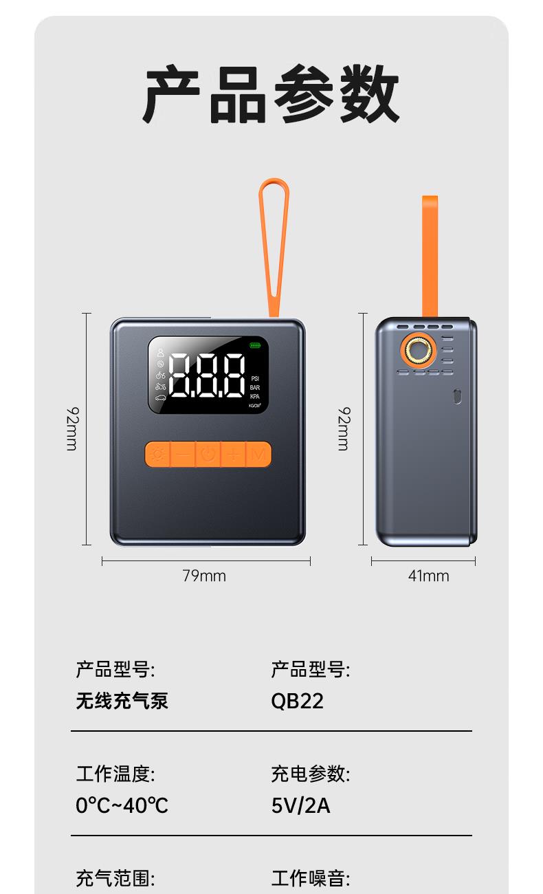 产品颜色:灰色 类型:无线款 材质:ABS +PC 充电时长:2-3小时 电池容量:600mAh*3 工作时长:15-30分钟 产品配件:充气泵(内置电池)× 1;气管×1;USB-A转Type-C数据线 × 1 ;产品说明书 × 1 ;配件包 × 1 适用:汽车/电动车/球类/自行车可用,2.5个压或以下的轮胎适用 产品尺寸:80*42*91mm 包装尺寸:140*52*132mm 整箱数量:20 单品重量:290克