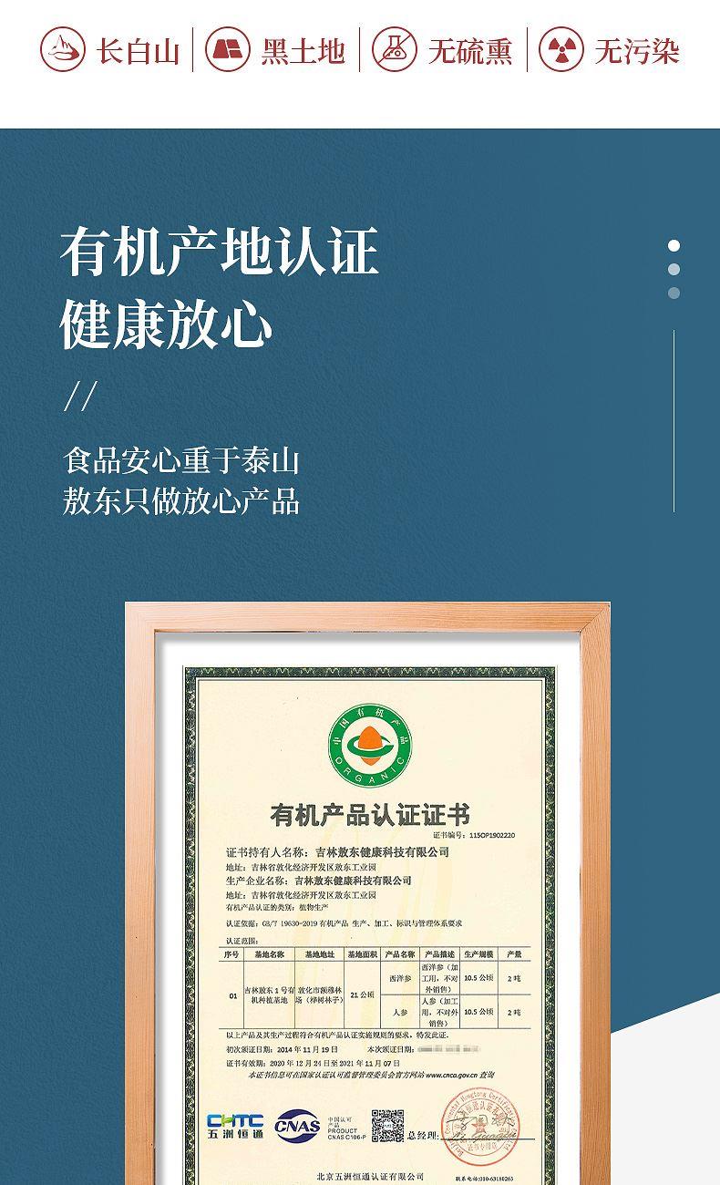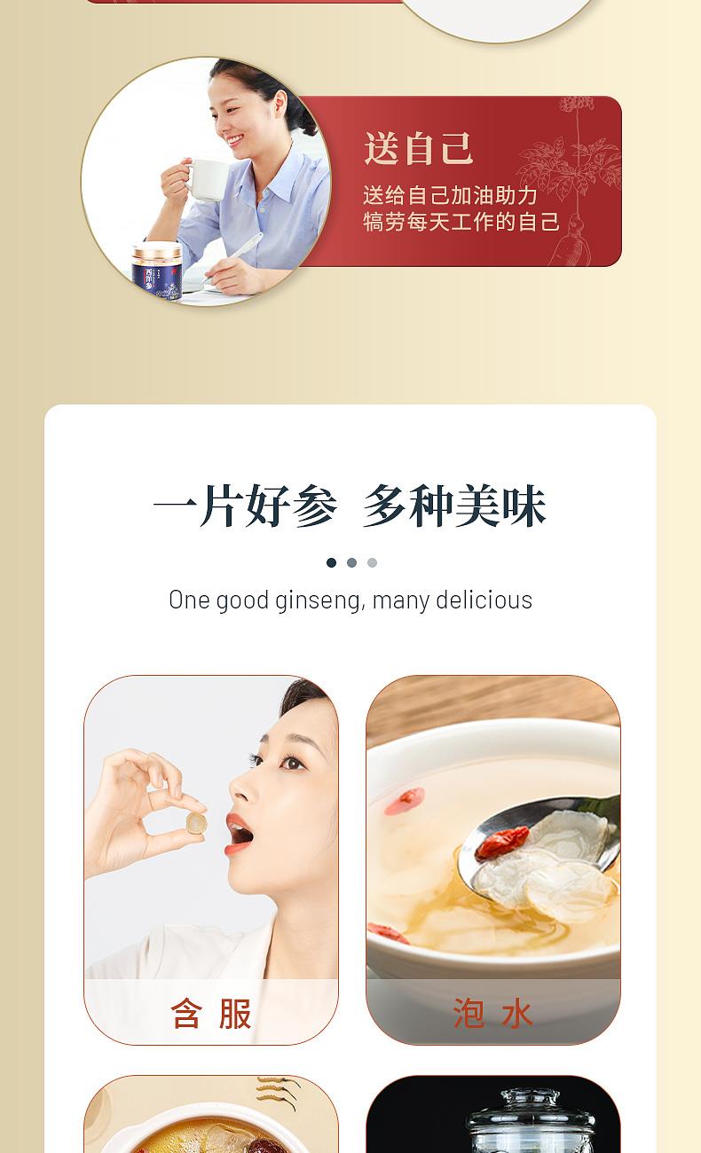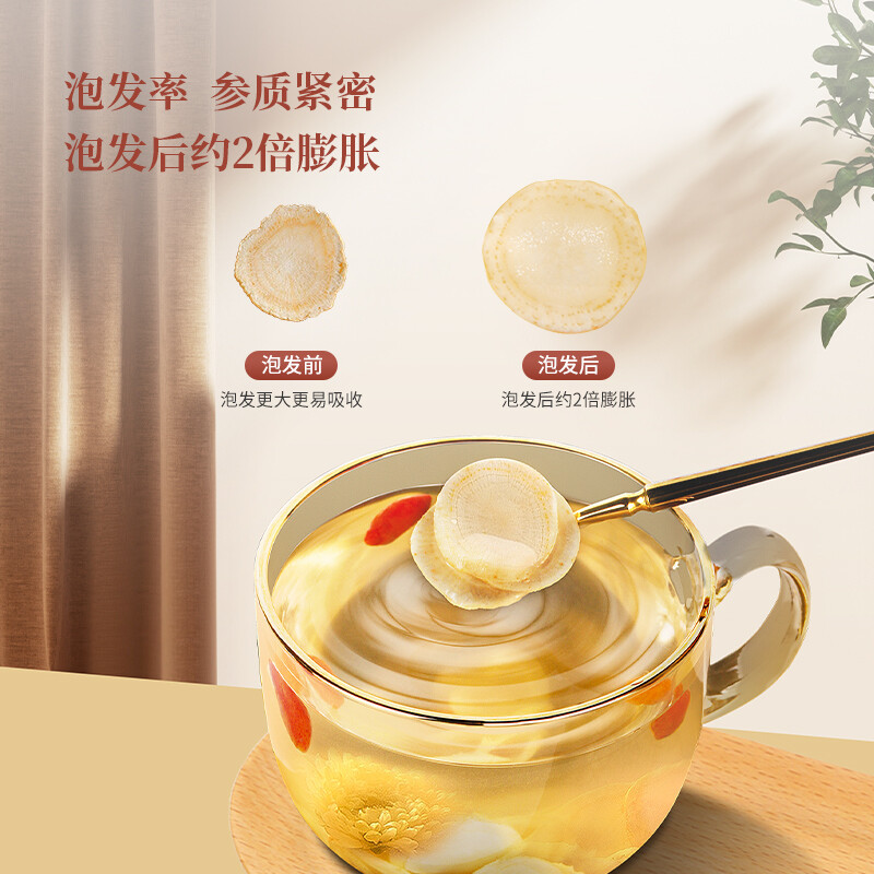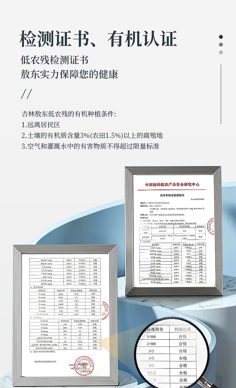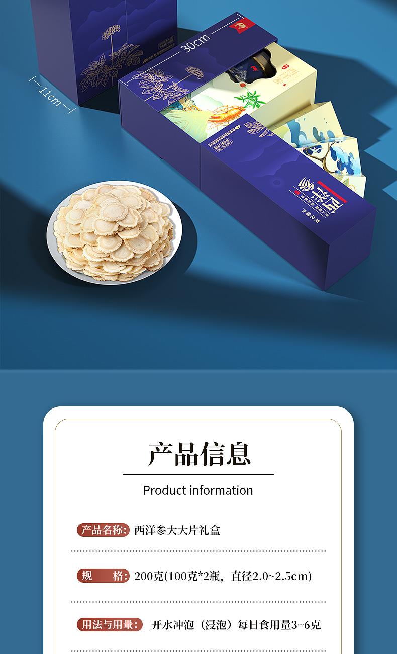 产品:西洋参大大片礼盒 规格:200克(100克*2瓶) 片直径:2.0-2.5CM 包装盒尺寸:22*30*11CM 用法与用量:开水冲泡,每日食用量3-6克 贮藏方法:置阴凉干燥处,密封,防蛀 上市企业产品; 有机产地认证,健康放心; 软质切片工艺,主根切片.