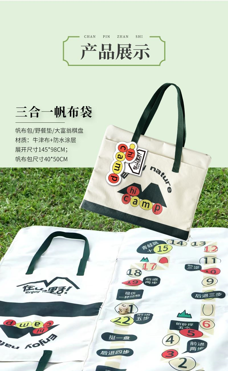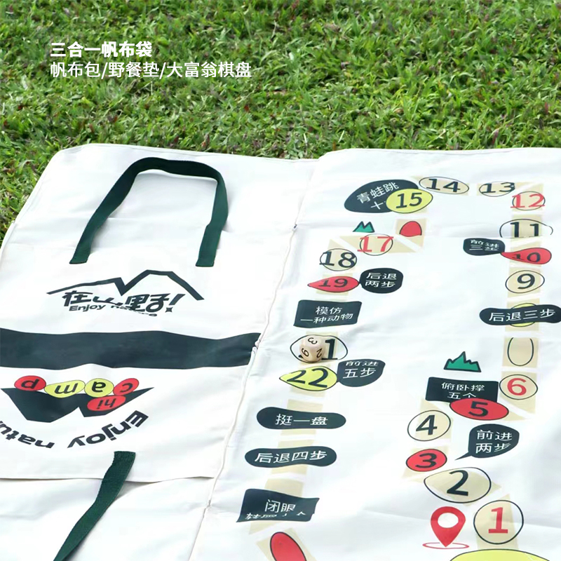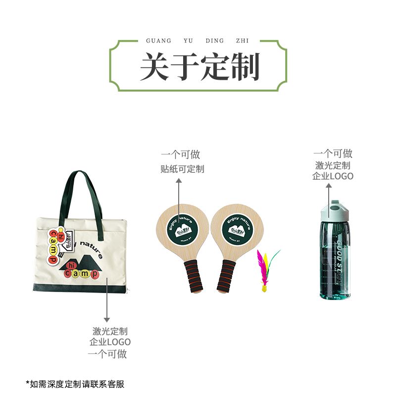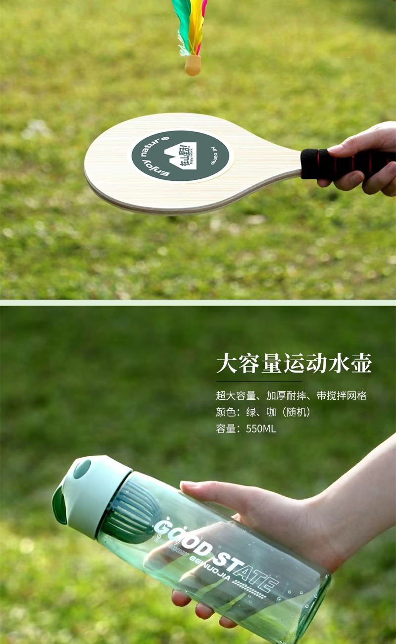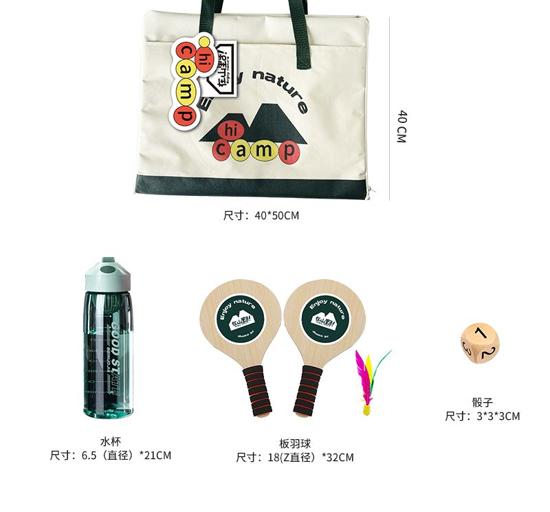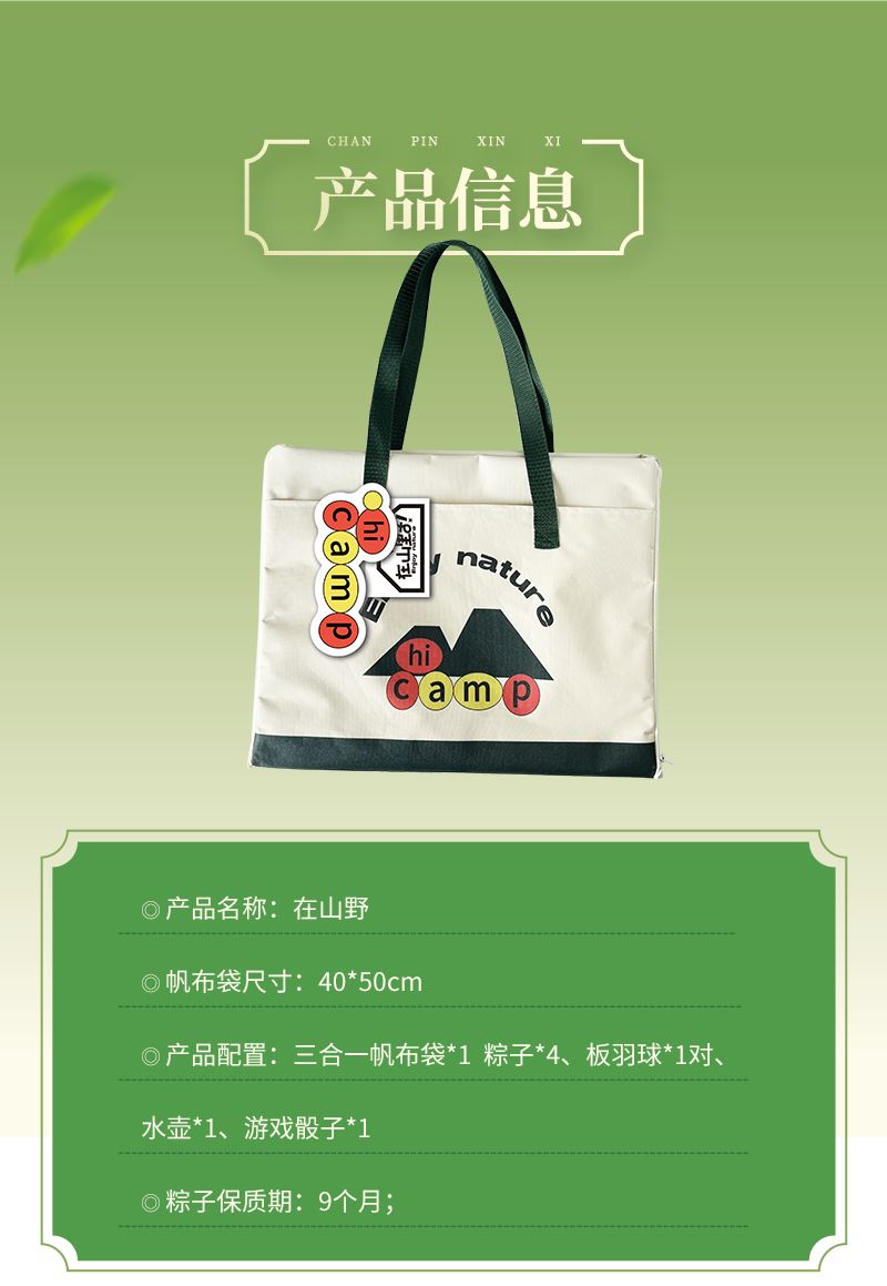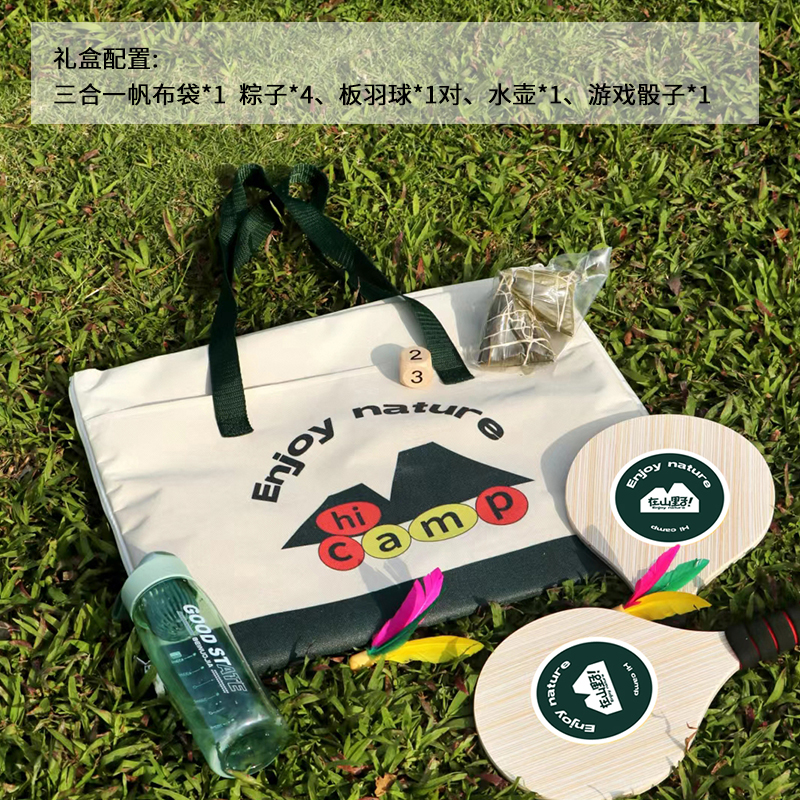 礼盒参数: 帆布袋尺寸:40*50cm 套装重量:1670g/套 外箱尺寸:45*36*40cm 详细介绍: 1.游戏骰子 尺寸:3*3cm 材质:实木 2.三合一帆布袋 帆布包/野餐垫/大富翁棋盘 材质:牛津布+防水涂层 展开尺寸145*98cm;帆布包尺寸40*50cm 3. 大容量运动水壶 超大容量、加厚耐摔、 带搅拌网格 颜色:绿、咖(随机) 杯体:食品级塑料 容量:550ML 4.板羽球 材质:实心木板 5.粽子4枚 ◆ 100克鲜肉粽 2个/袋 ◆ 100克红枣粽 2个/袋
