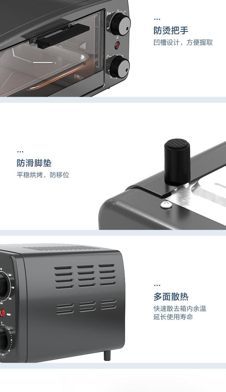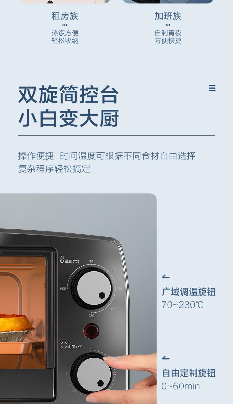 加热方式:上下管加热 控制方式:机械式 内胆材质:其它材料 操作方式:其他 开门方式:下拉门 显示屏:无 额定电压(V):220 热风功率/烧烤功率:800 功能:上下烧烤 容积(L):10L 1.黄金容量:10L黄金容量,小巧尺寸,一本杂志大小,可上桌分享 2.双控旋钮:70~230℃宽域调温,上下匀火恒温
