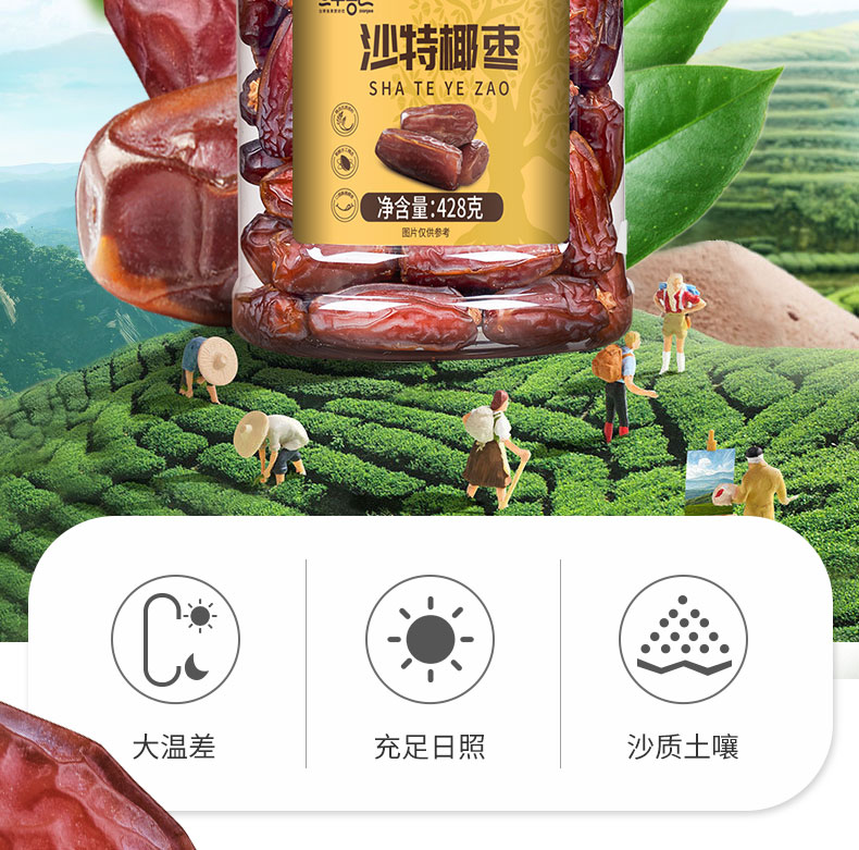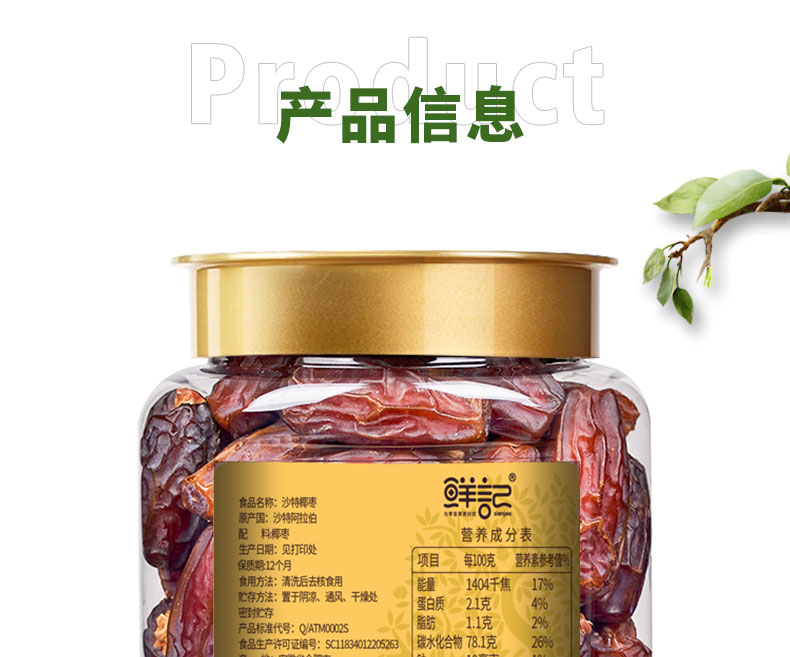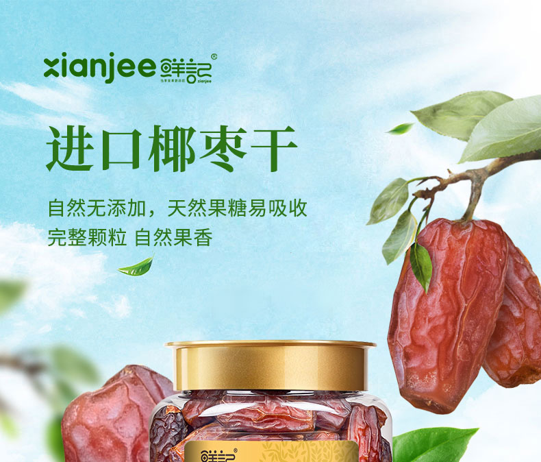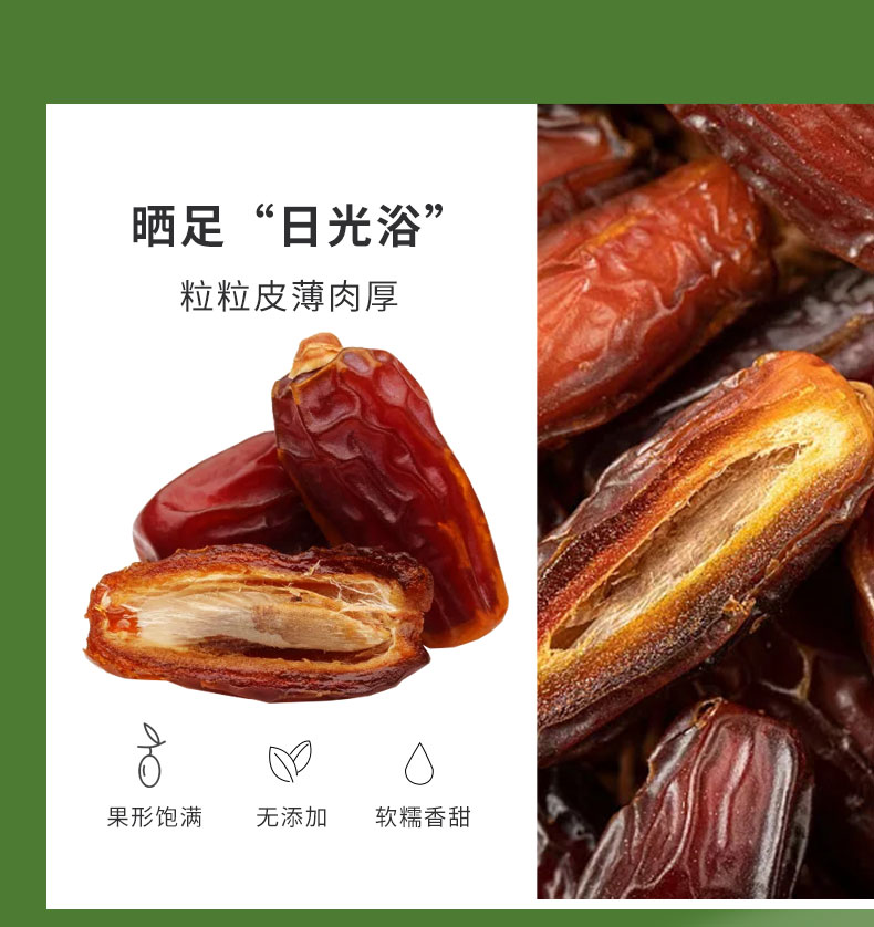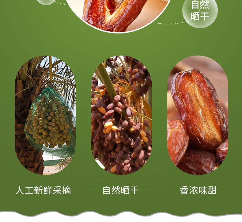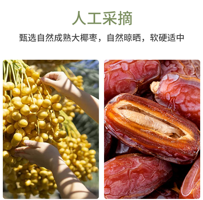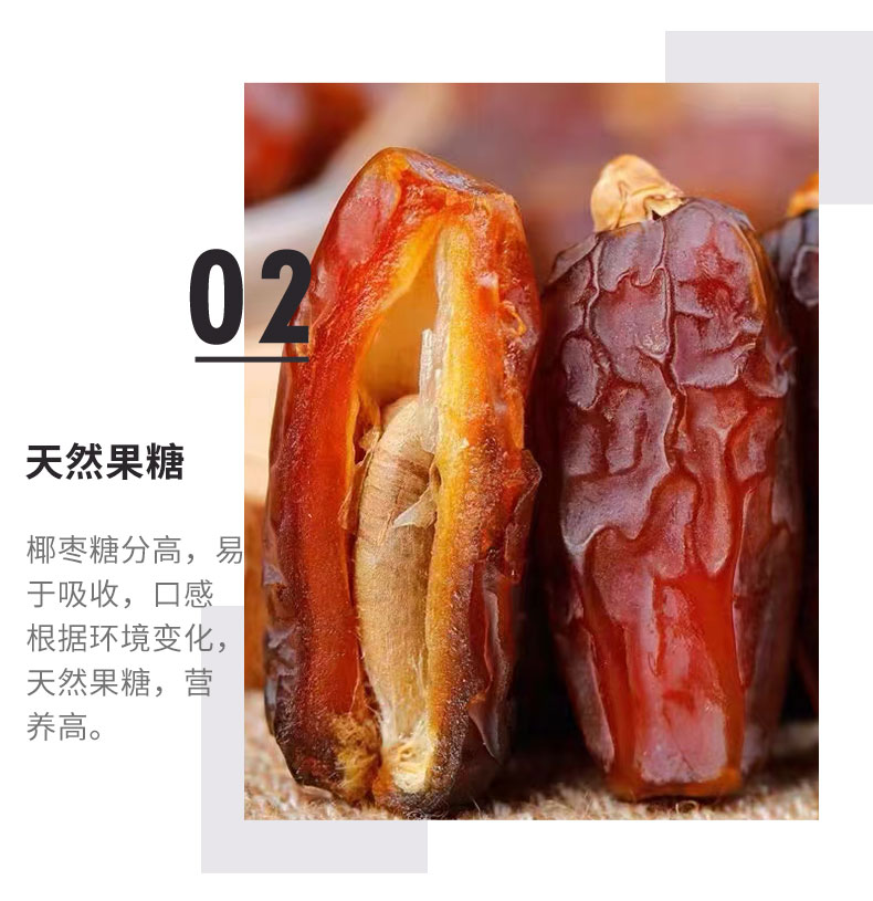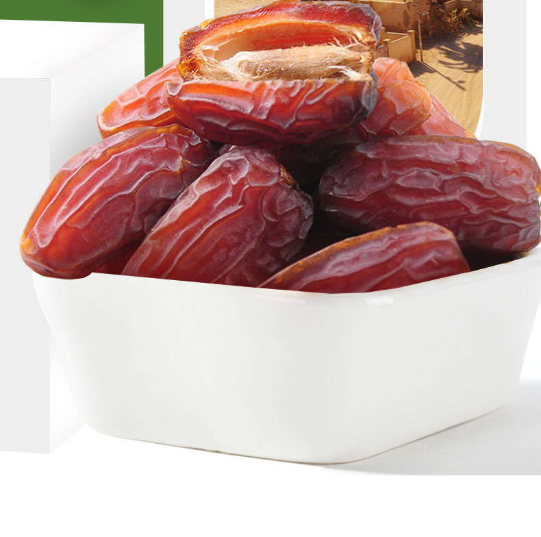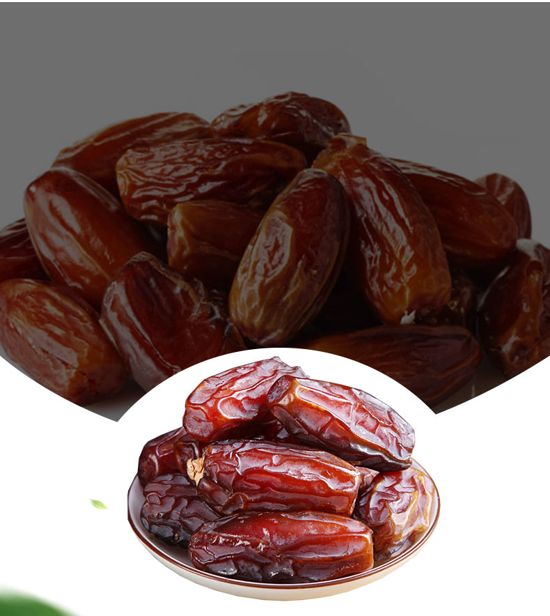进口椰枣干,自然无添加,天然果糖易吸收; 完整颗粒,自然果香。
