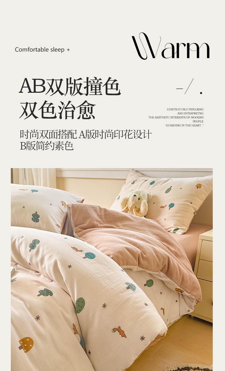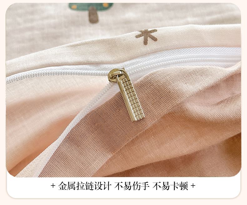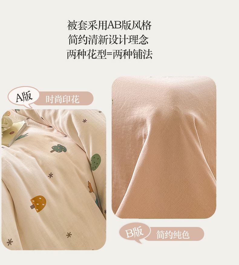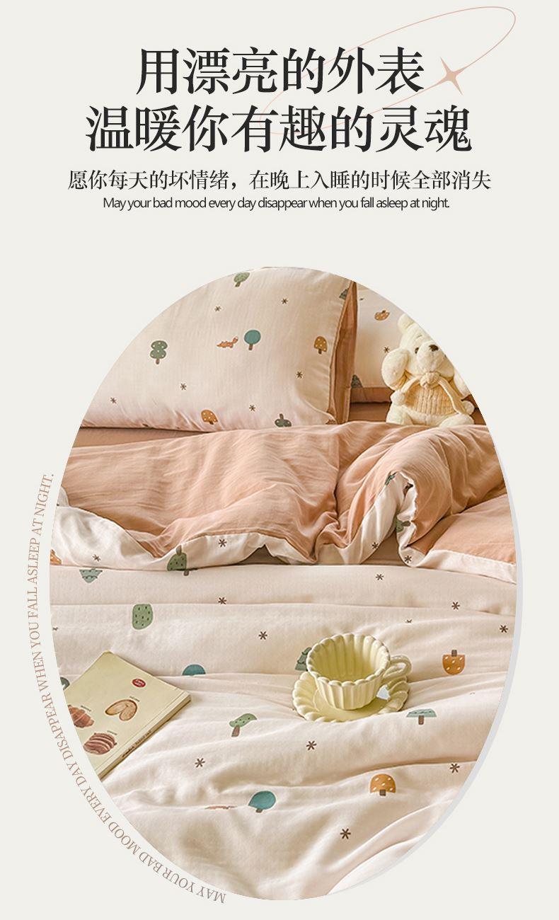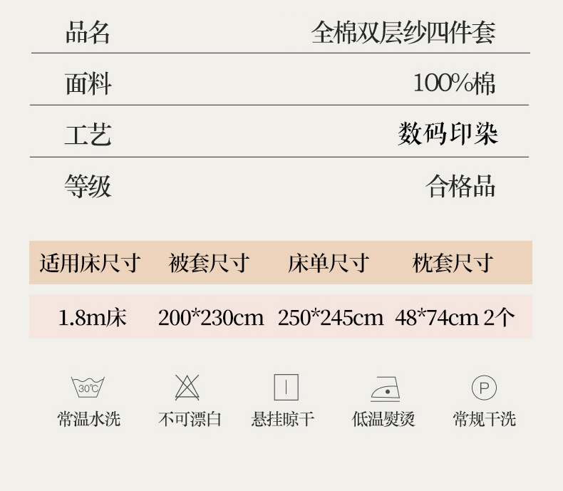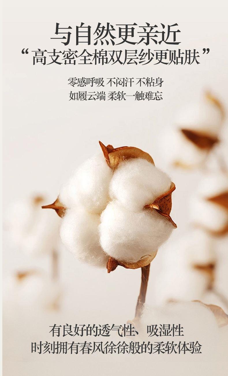 被套:200×230cm 床单:245×245cm 枕套:48×74cm 适用:1.5M-1.8M床 面料:双层纱(棉) 棉双层纱面料 邂逅高密全棉双层纱面料制作亲肤舒适兼具触觉与视觉享受,有良好的透气性、吸湿性时刻拥有春风徐徐般的柔软体验。