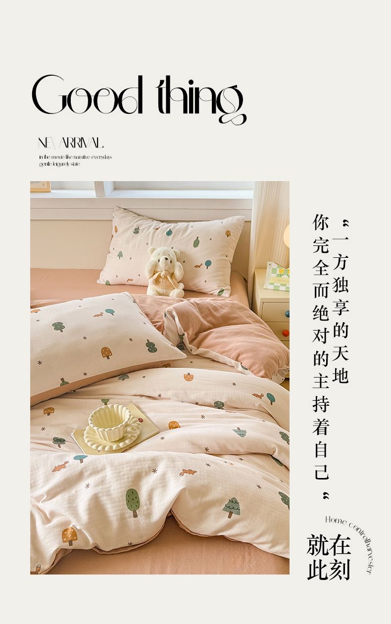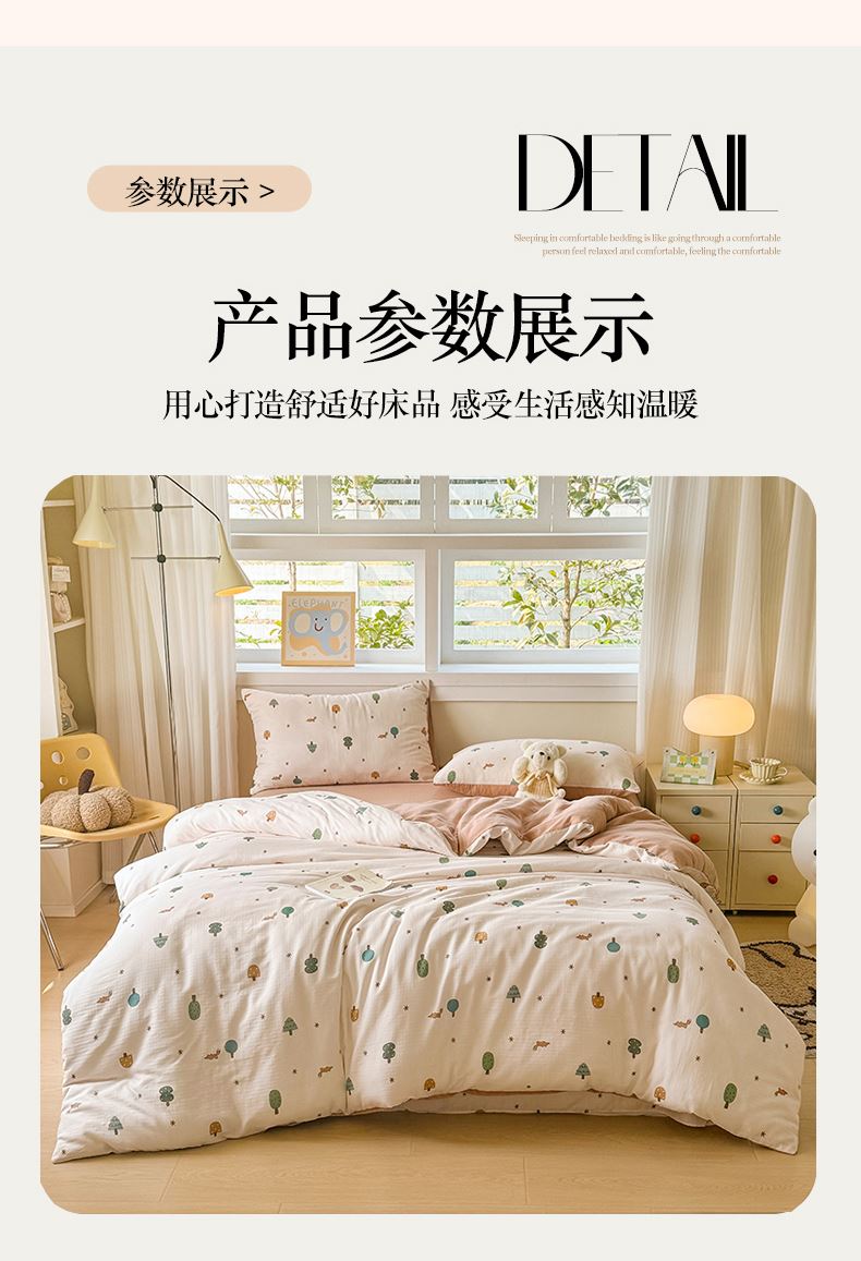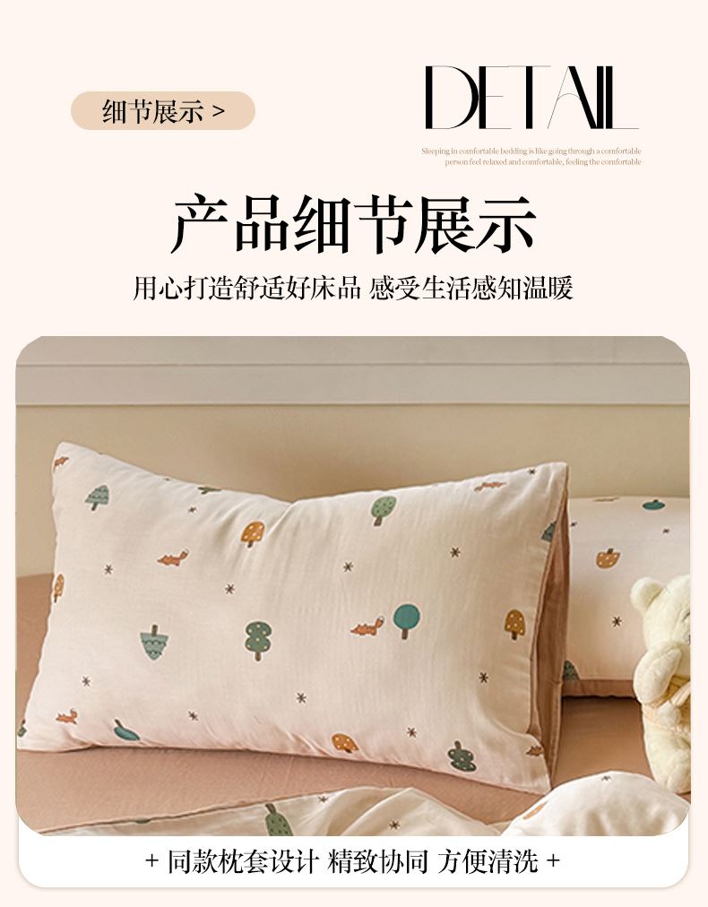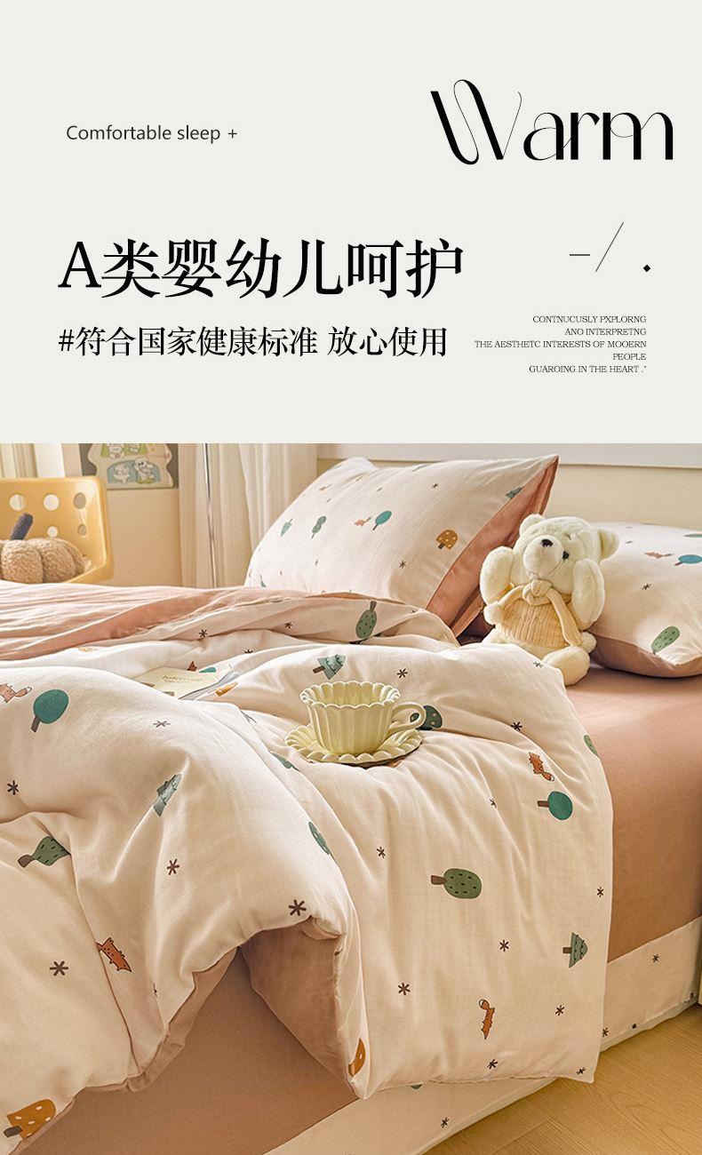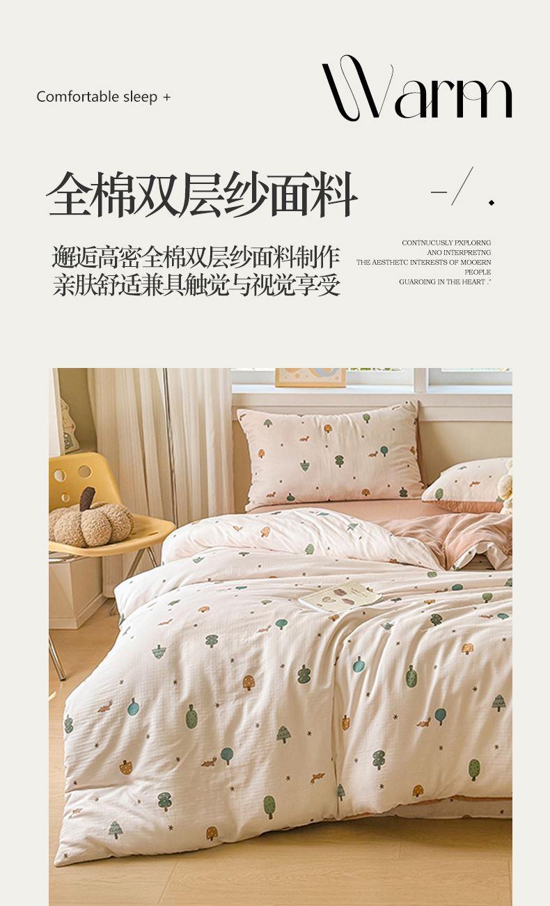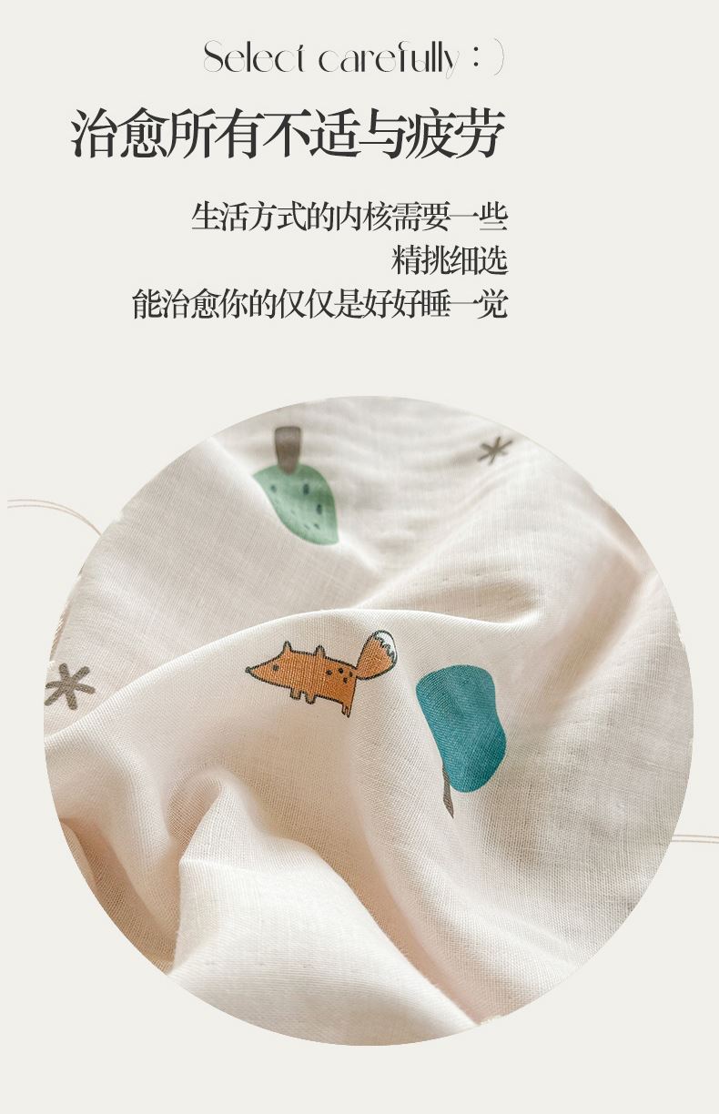 被套:200×230cm 床单:245×245cm 枕套:48×74cm 适用:1.5M-1.8M床 面料:双层纱(棉) 棉双层纱面料 邂逅高密全棉双层纱面料制作亲肤舒适兼具触觉与视觉享受,有良好的透气性、吸湿性时刻拥有春风徐徐般的柔软体验。