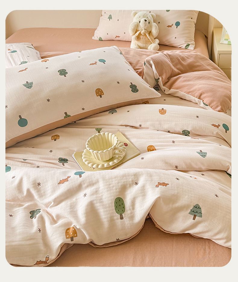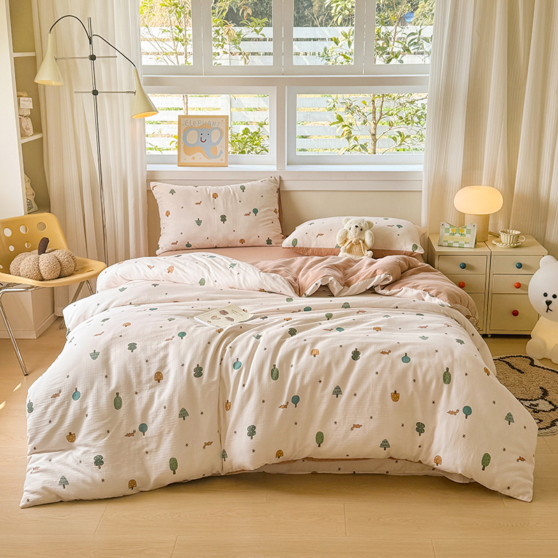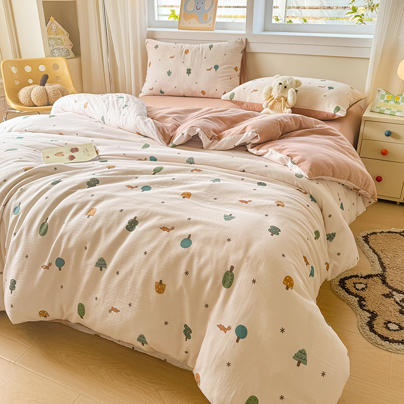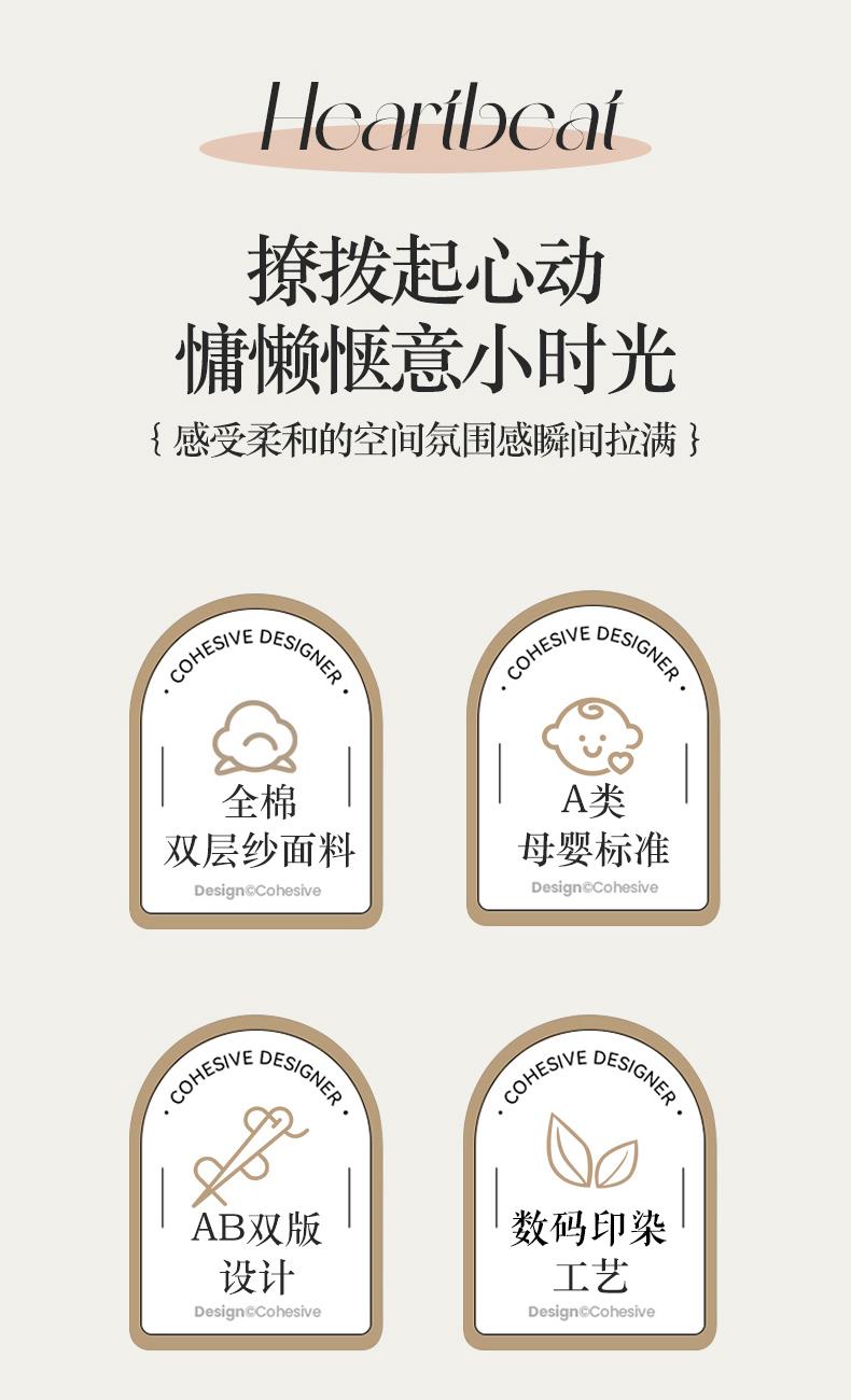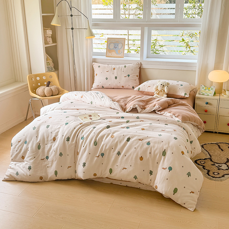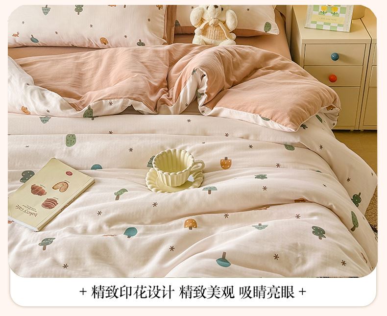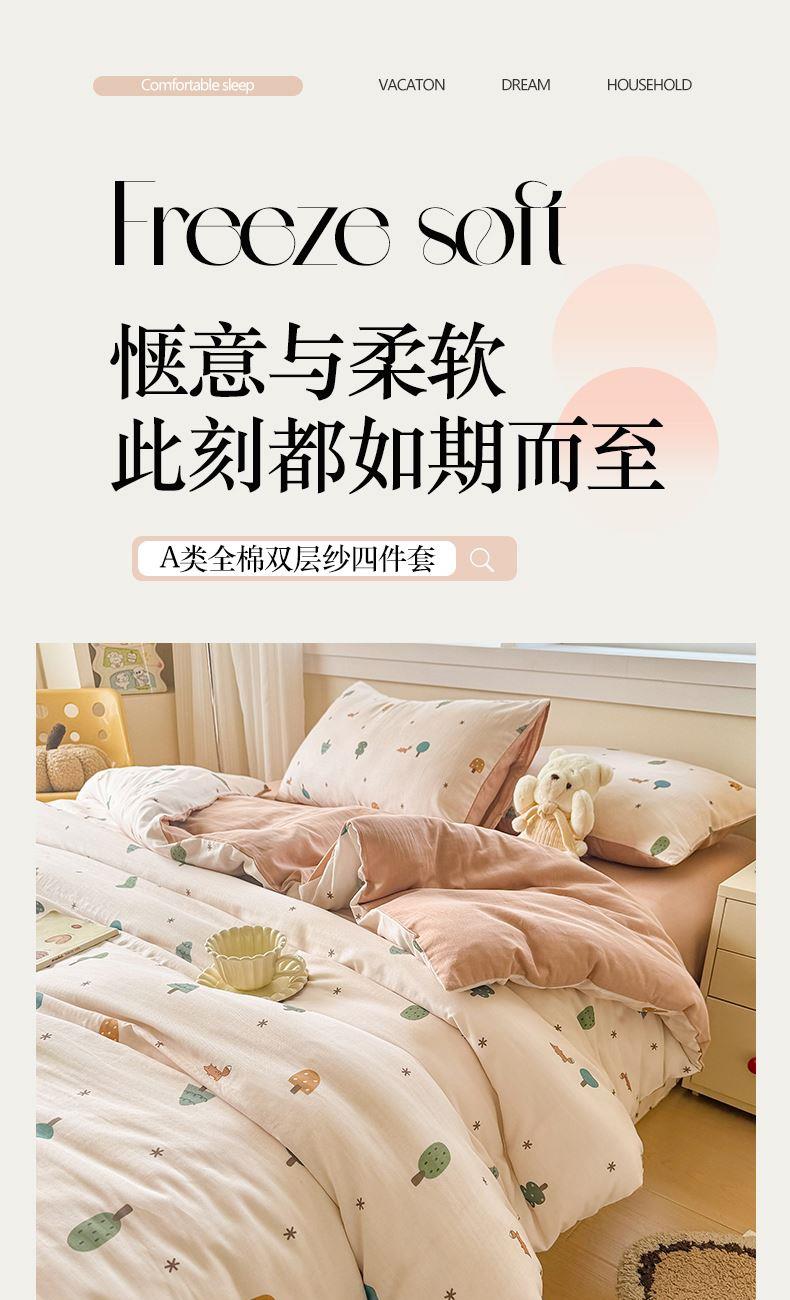 被套:200×230cm 床单:245×245cm 枕套:48×74cm 适用:1.5M-1.8M床 面料:双层纱(棉) 棉双层纱面料 邂逅高密全棉双层纱面料制作亲肤舒适兼具触觉与视觉享受,有良好的透气性、吸湿性时刻拥有春风徐徐般的柔软体验。