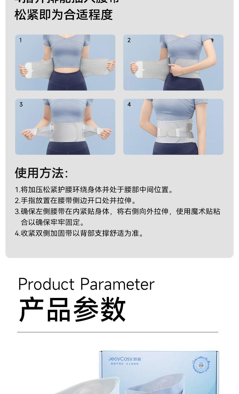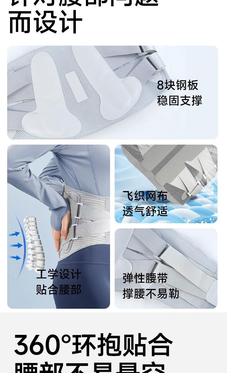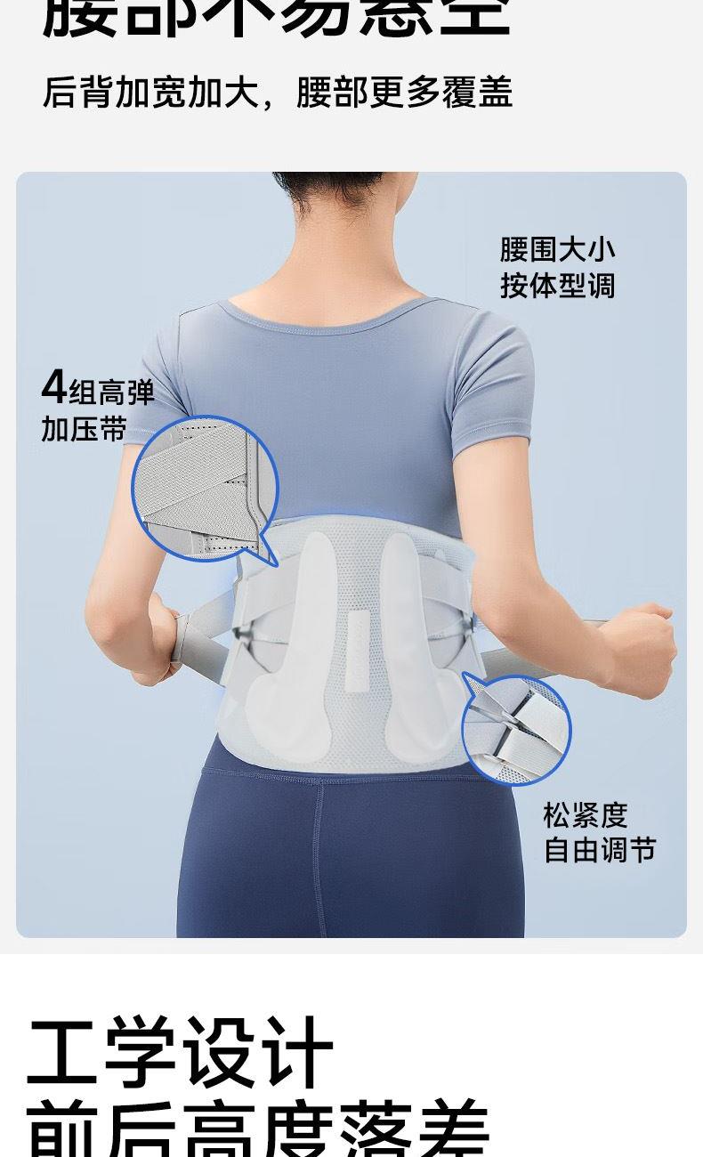 1、360°环抱贴合,腰部不易悬空,舒缓压力 2、四周自然收紧,如双手推腰,时刻舒适承托 3、工学设计,后背高于前腹,上面不顶肋骨下面不格胯骨 4、强透气网布,贴身清爽不闷汗