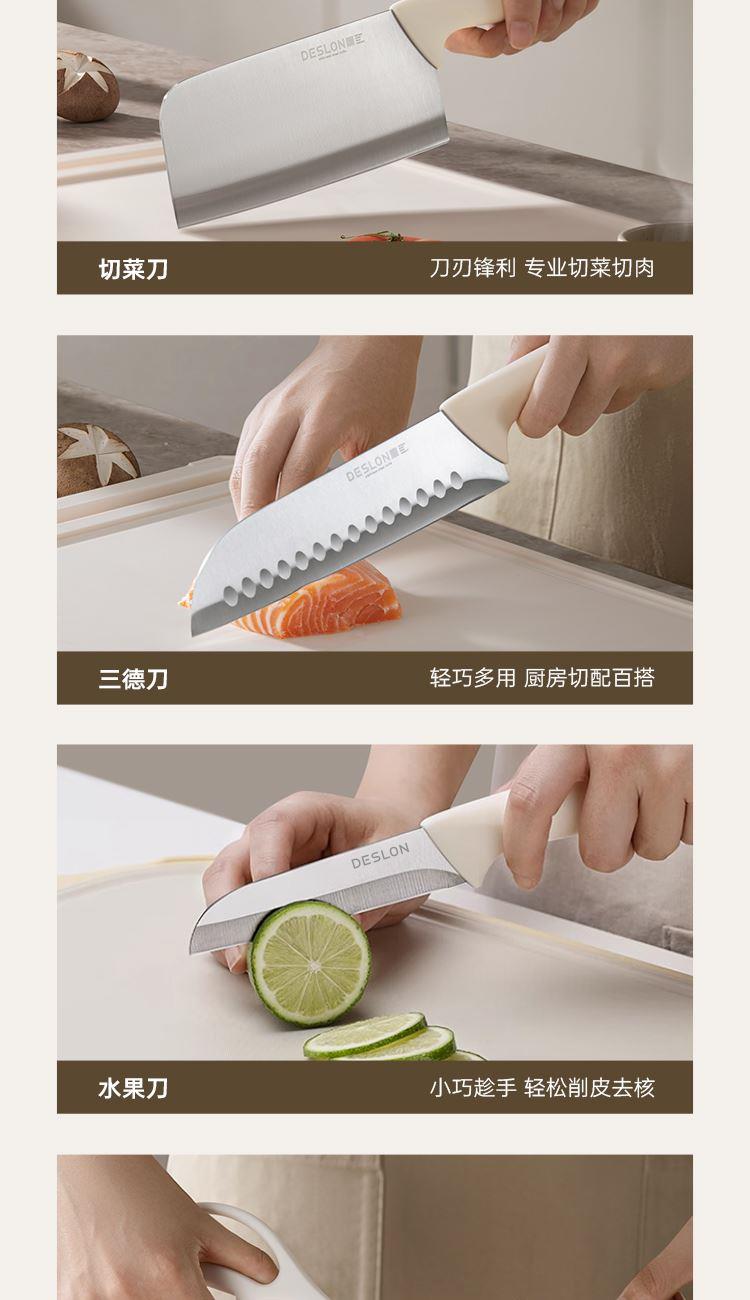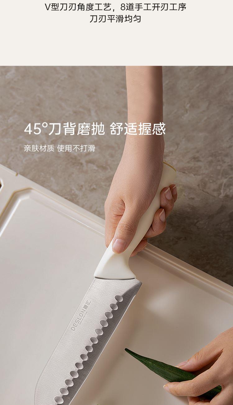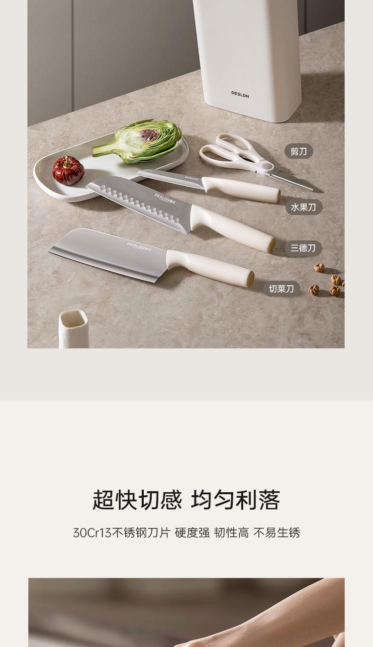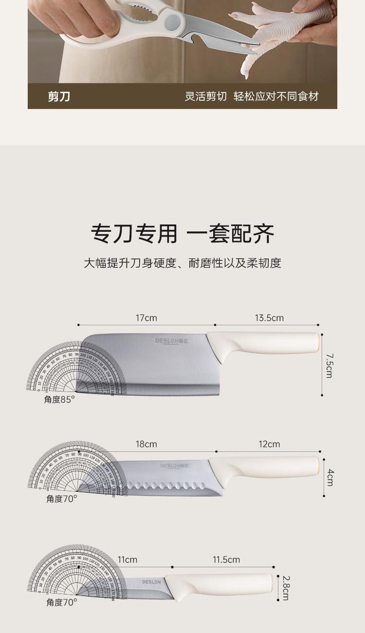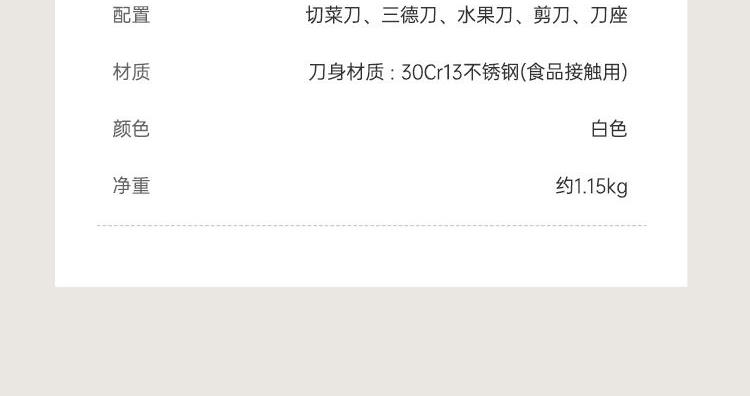 产品配置:切菜刀、三德刀、水果刀、 剪刀、刀座 刀身材质:30Cr13不锈钢(食品接触用) 包装方式:彩盒+邮购盒 1、刀具材质采用30Cr13不锈钢,硬度强、韧性高、不易生锈; 2、人性化刀柄设计,符合人体工程学原理,握感舒适; 3、经由多道淬火热处理与回火工艺,刀刃锋利; 4、45度刀背磨抛,让您使用倍感舒适; 5、搭配厨房剪刀,轻松处理多种食材; 6、可拆卸刀座,美观大方,收置刀具,节约空间,干净整齐。