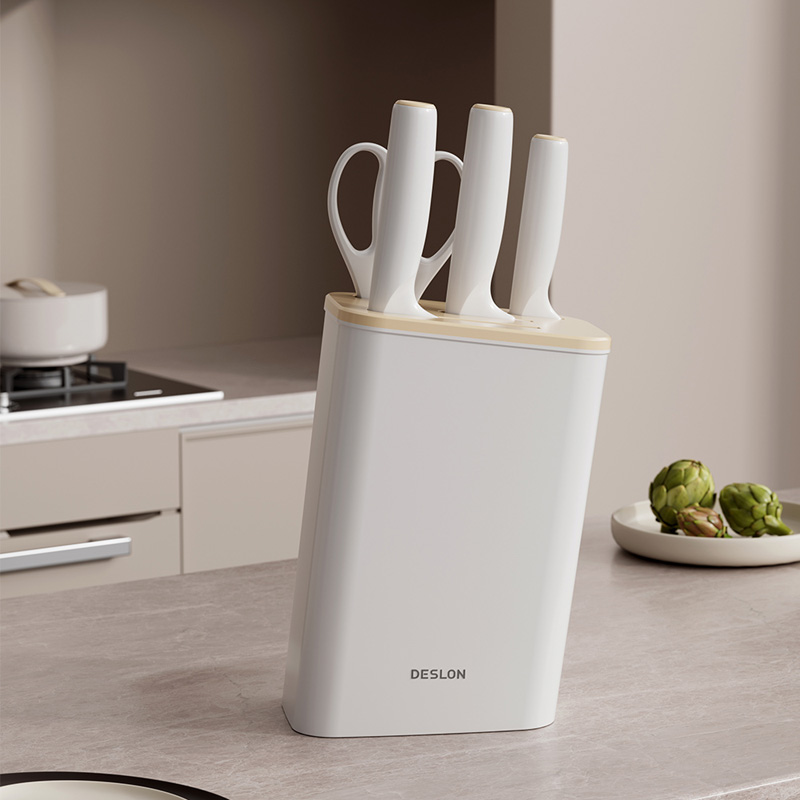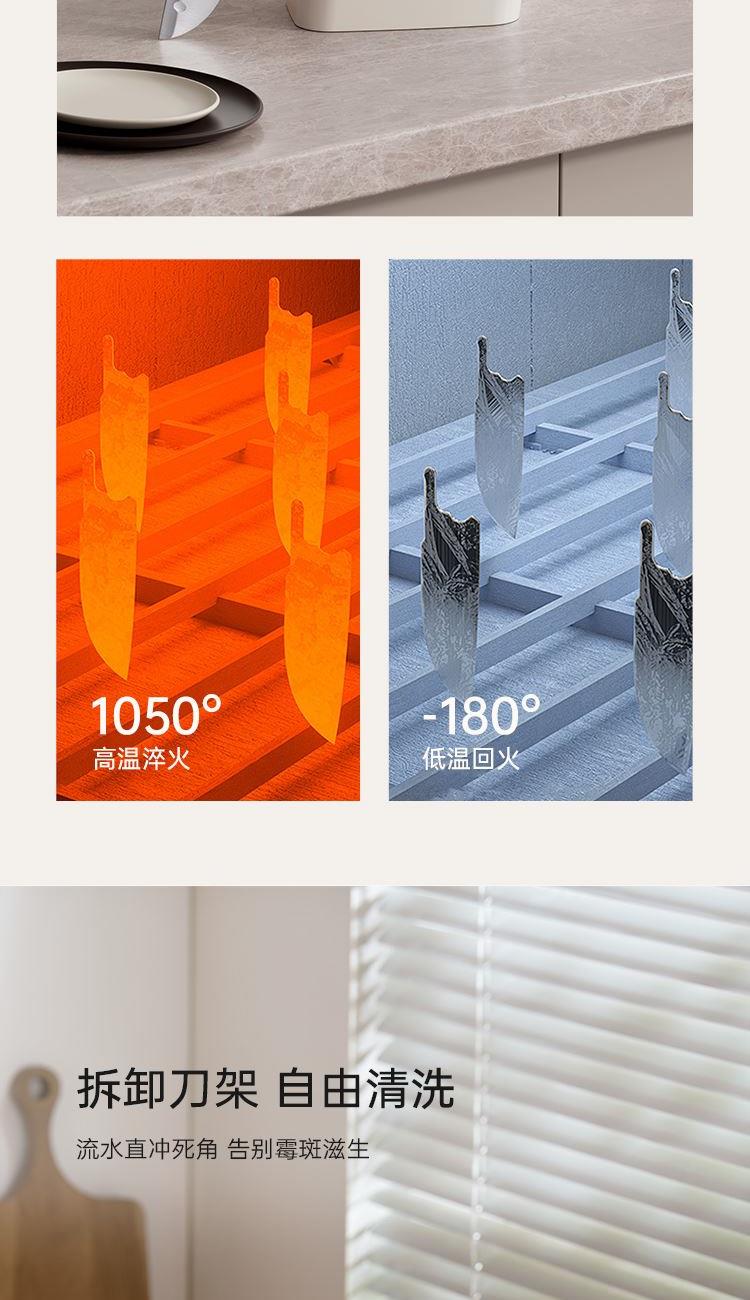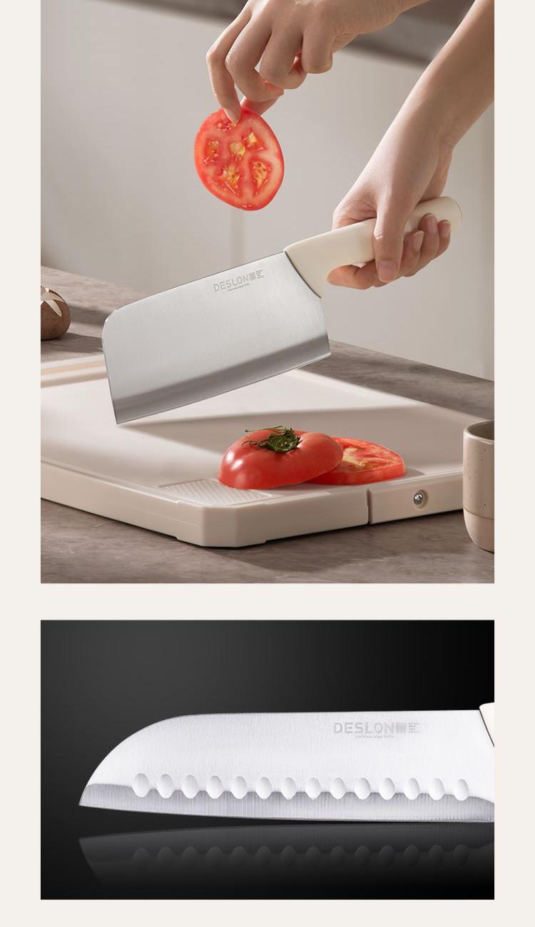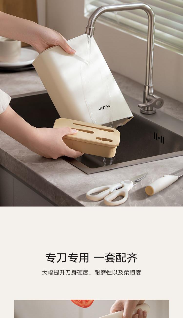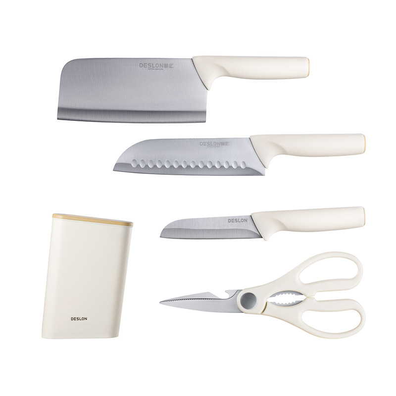 产品配置:切菜刀、三德刀、水果刀、 剪刀、刀座 刀身材质:30Cr13不锈钢(食品接触用) 包装方式:彩盒+邮购盒 1、刀具材质采用30Cr13不锈钢,硬度强、韧性高、不易生锈; 2、人性化刀柄设计,符合人体工程学原理,握感舒适; 3、经由多道淬火热处理与回火工艺,刀刃锋利; 4、45度刀背磨抛,让您使用倍感舒适; 5、搭配厨房剪刀,轻松处理多种食材; 6、可拆卸刀座,美观大方,收置刀具,节约空间,干净整齐。