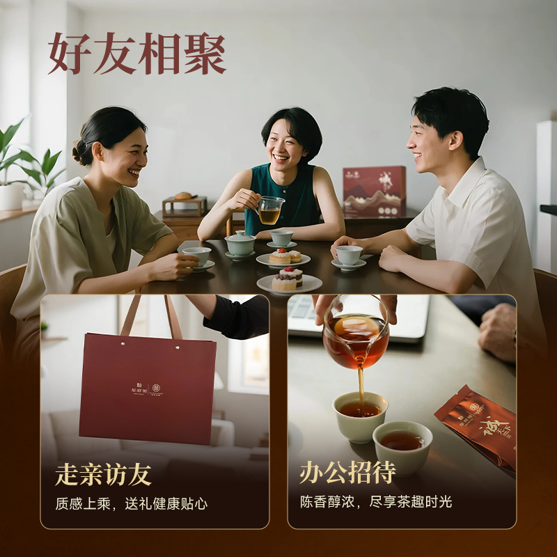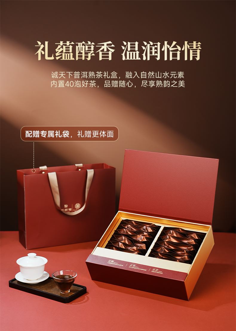 融入自然山水元素内置40泡好茶,品赠随心,尽享熟韵之美内置齐整,简约大气,配赠专属礼袋,馈赠更体面。