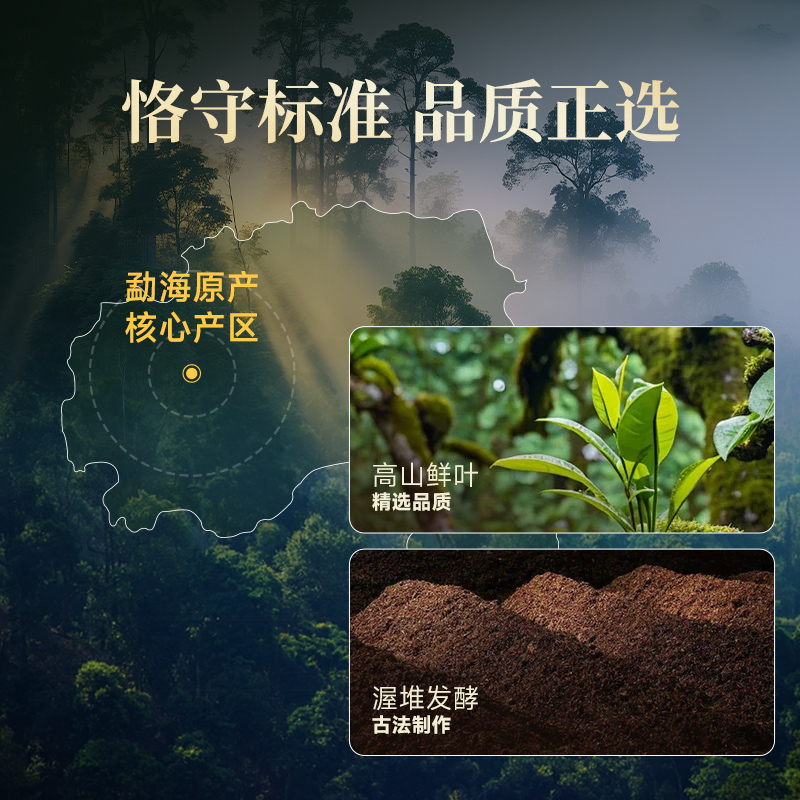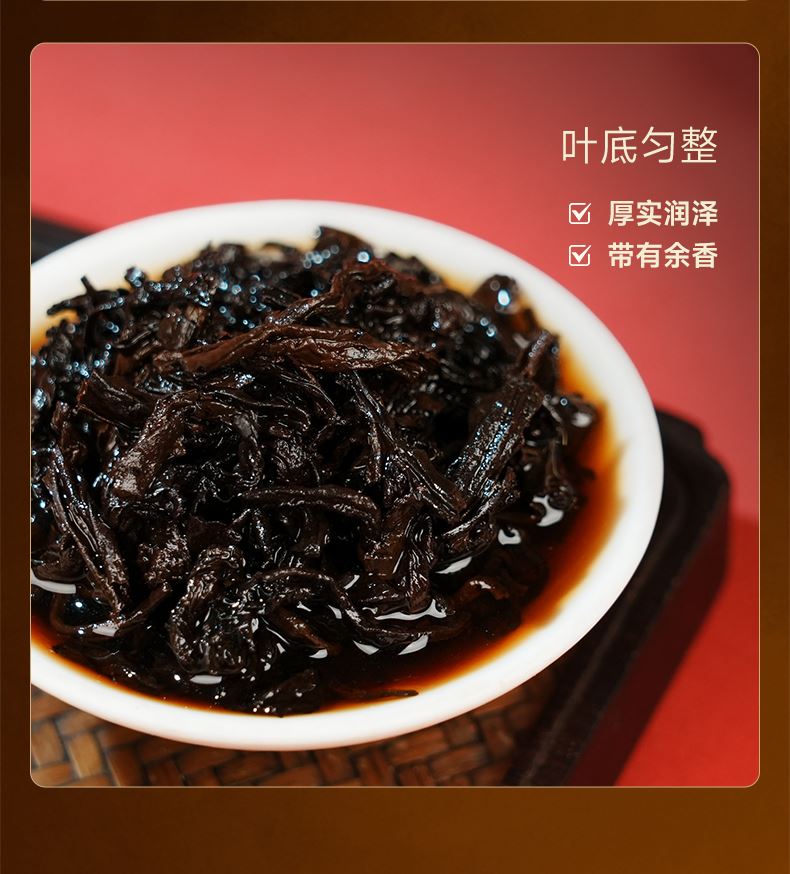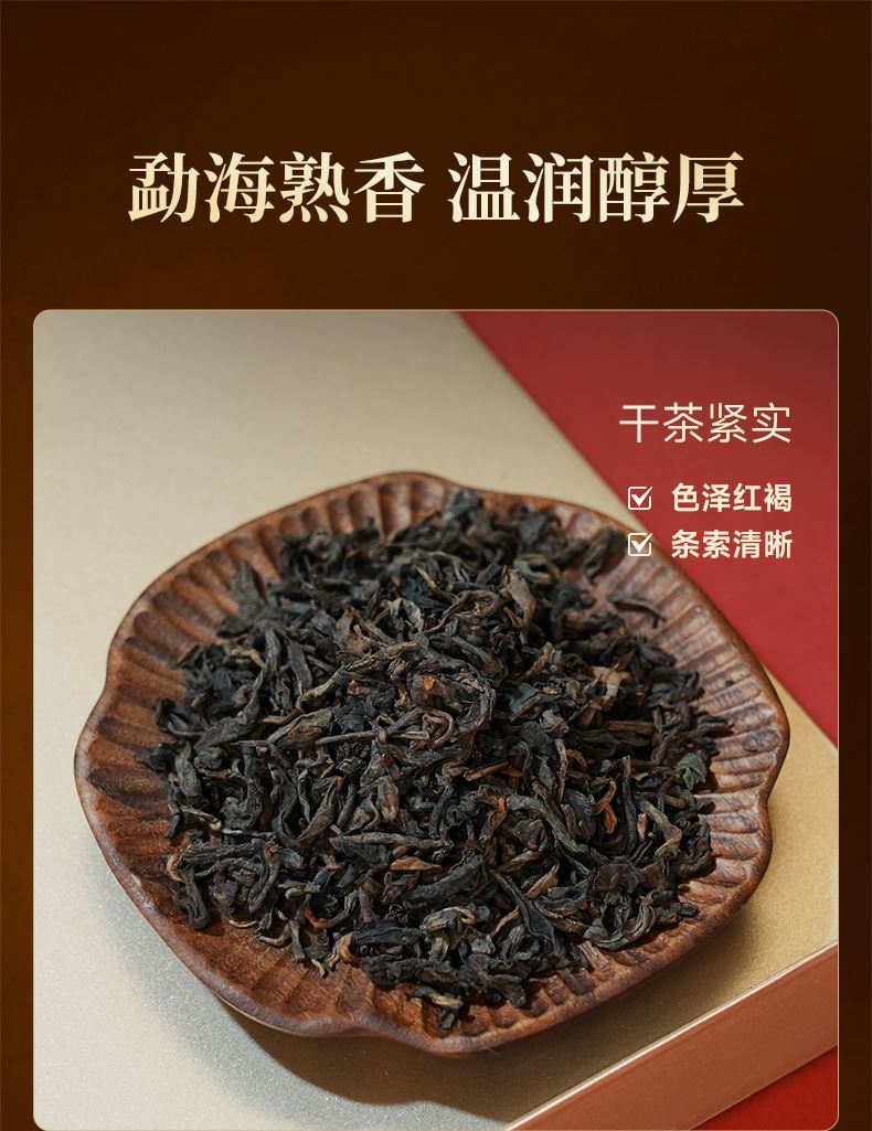 《品质特征》:勐海熟香 温润醇厚 干茶紧实 色泽红褐 条索清晰 陈香浓郁 茶汤红浓 水路细腻 叶底匀整 厚实润泽 带有余香 一泡一饮 尽享好茶 好茶足量,送礼有里有面独立小袋,品饮轻松省心。