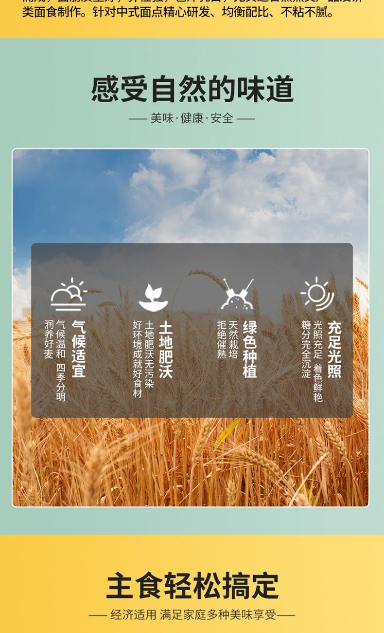 1.优质麦源,麦源把控绿色种植,土地肥沃气候适宜,阳光充足。 2.轻研细磨,麦香浓郁,好面粉用实力说话。3.多用途面粉,家庭主食轻松搞定。4 马上發财,马力全开,年富一年。