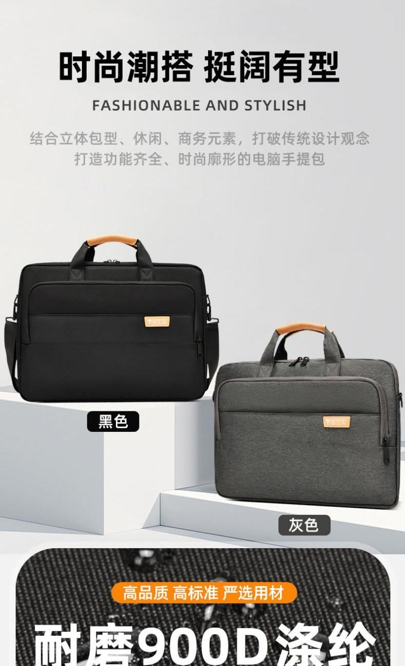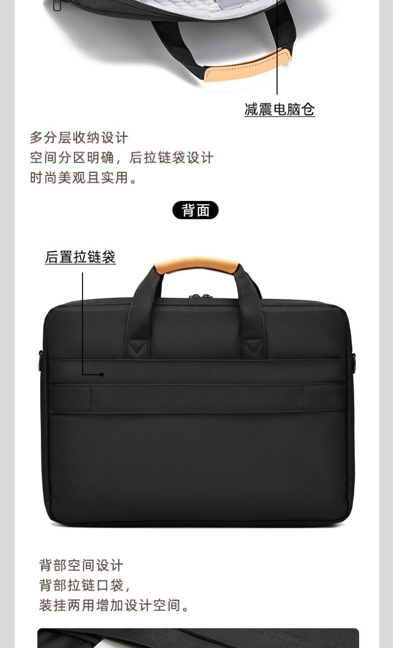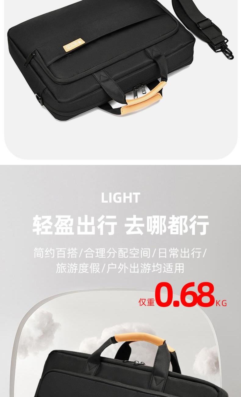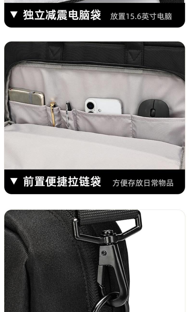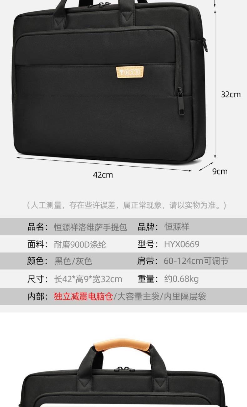 产品型号:HYX0669 产品重量:0.68kg 产品规格:42*9*32cm 产品颜色:黑色、灰色 产品卖点:采用900D涤纶,质感好,档次高; 大容量电脑公文包,内部防震抗摔独立14英寸电脑仓; 人性化拉杆织带设计,插在拉杆箱上,旅行更方便。 可拆卸单肩背背带,可提可背,双重场景切换; 前置双层收纳袋,可收纳日常零碎物品。