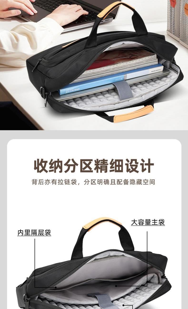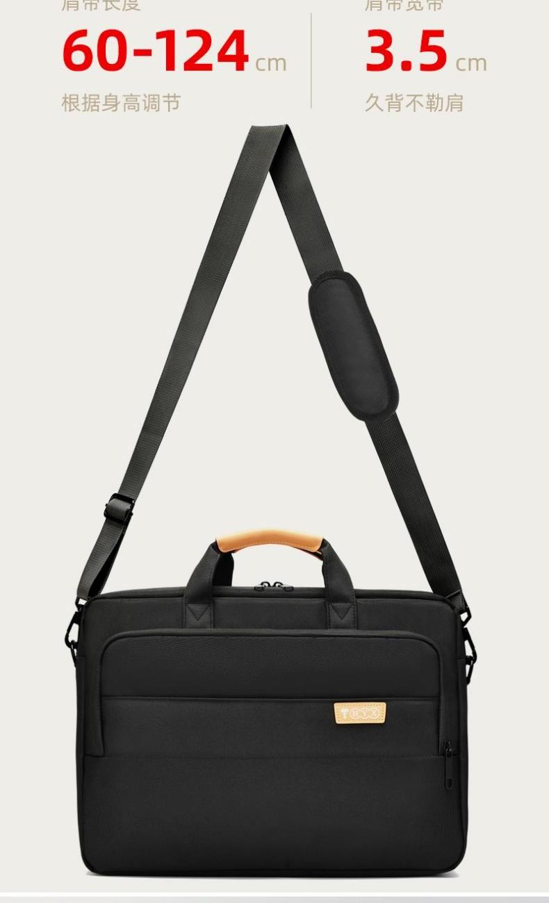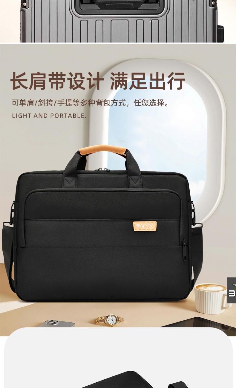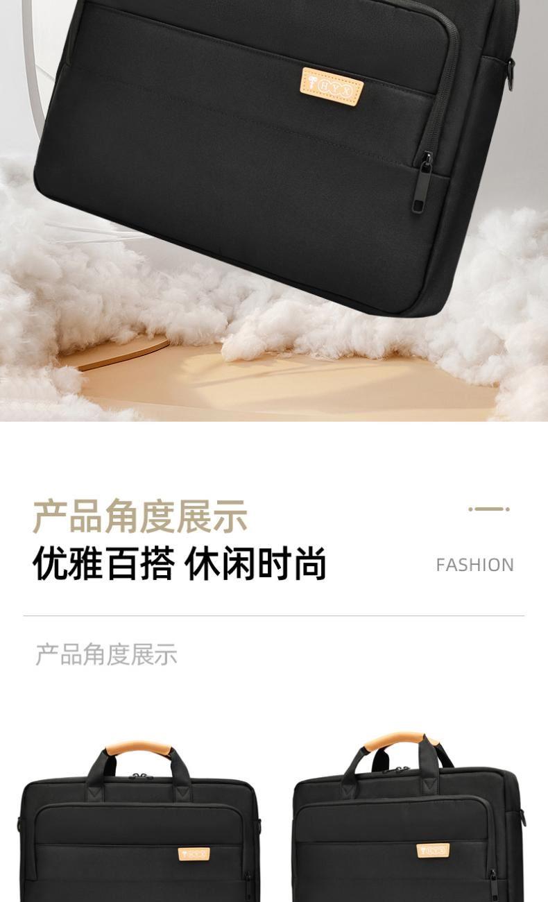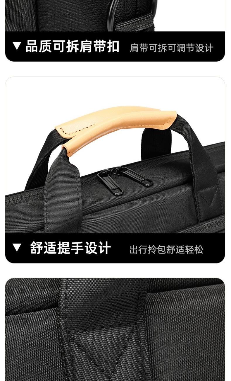 产品型号:HYX0669 产品重量:0.68kg 产品规格:42*9*32cm 产品颜色:黑色、灰色 产品卖点:采用900D涤纶,质感好,档次高; 大容量电脑公文包,内部防震抗摔独立14英寸电脑仓; 人性化拉杆织带设计,插在拉杆箱上,旅行更方便。 可拆卸单肩背背带,可提可背,双重场景切换; 前置双层收纳袋,可收纳日常零碎物品。