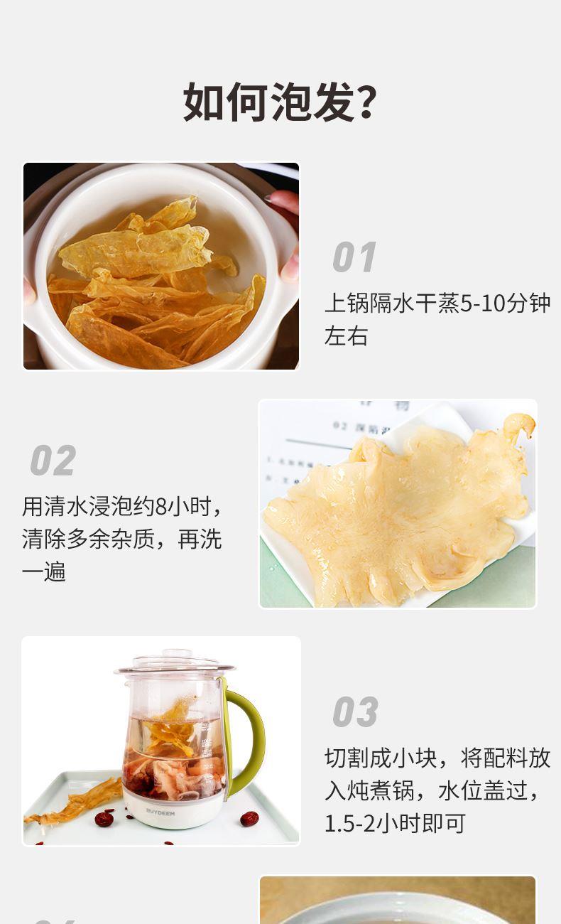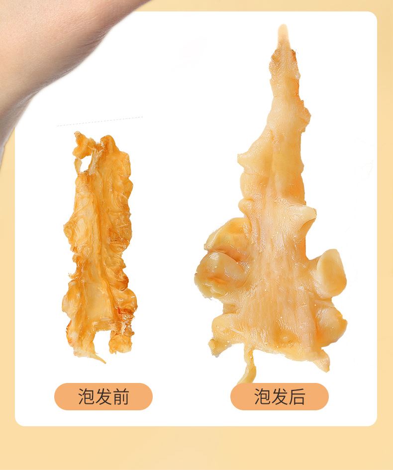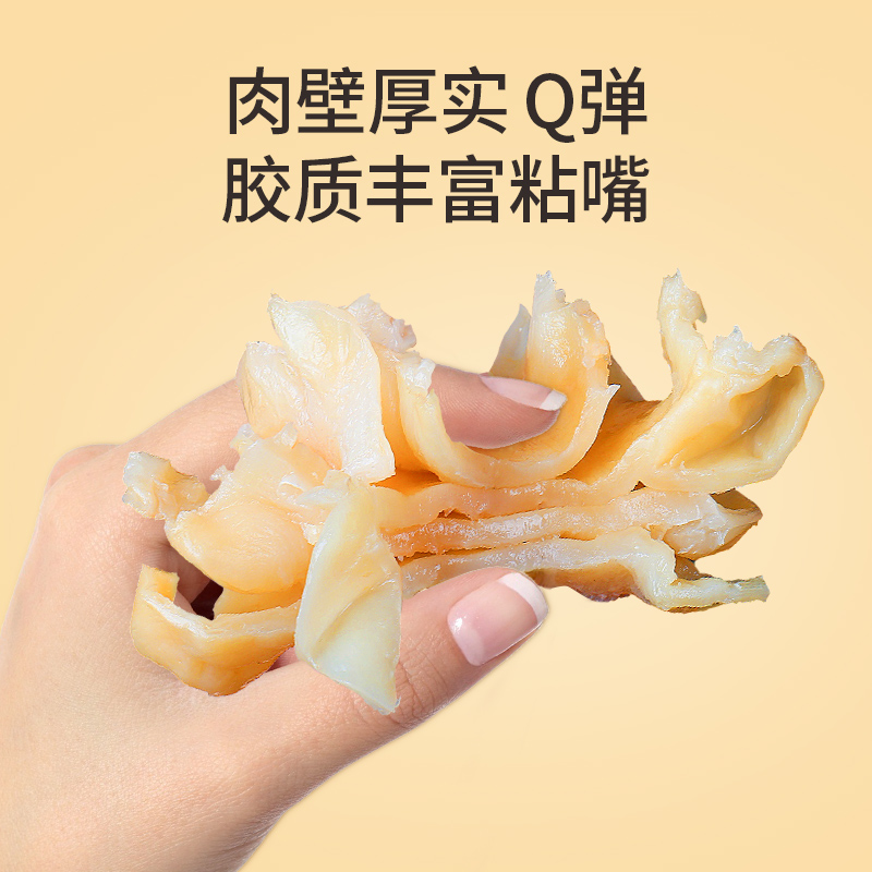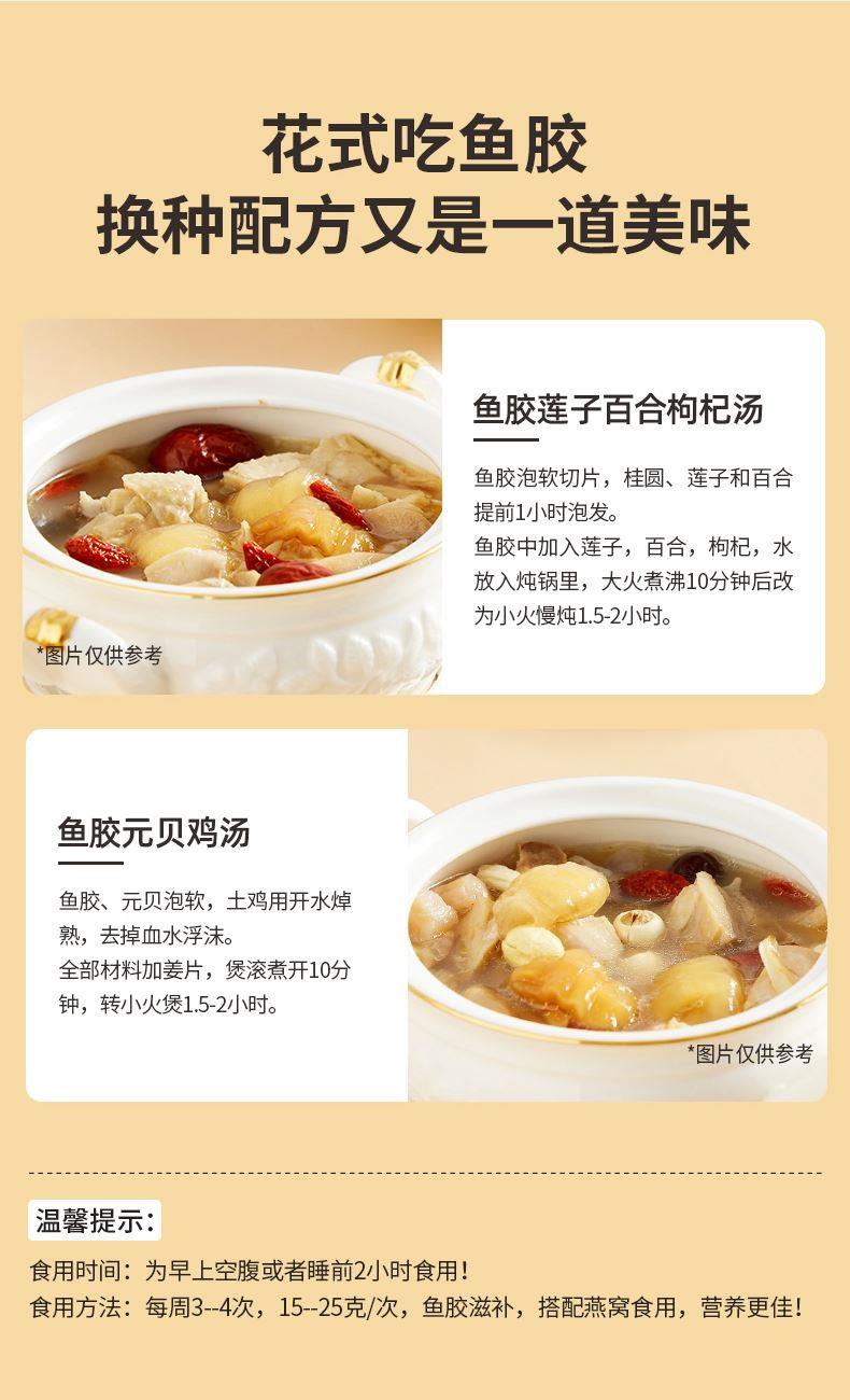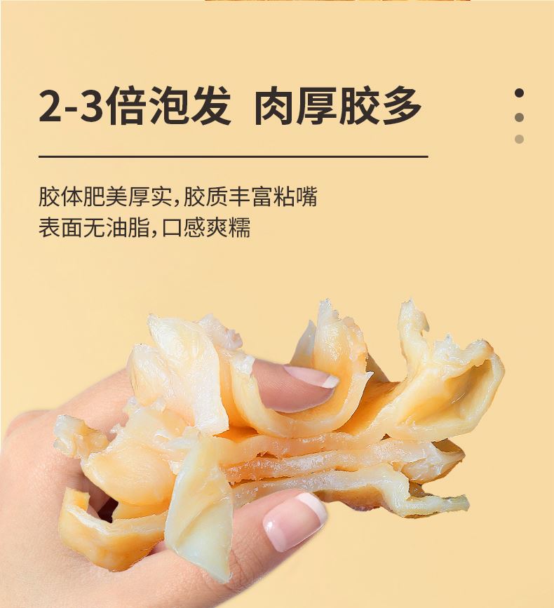 蔡府7A鳕鱼胶150g 规格:150g 包装尺寸:30*23*7.5cm 极圈冰岛鳕鱼胶,深海无污染水域出产 15年鱼龄大鱼,活鱼取胶;精选公肚,个大肉厚,泡发率2-3倍; 陈年好胶,表面干爽,无油脂无血丝,胶体肥美厚实; 天然金黄色,无漂白、无熏硫、无添加,色泽晶莹,呈半透明; 体态完整,个头匀称,胶身通透,纹理清晰; 丰富胶原蛋白,肉质细腻,口感糯滑; 适合全家滋补选择,或轻奢送礼需求。