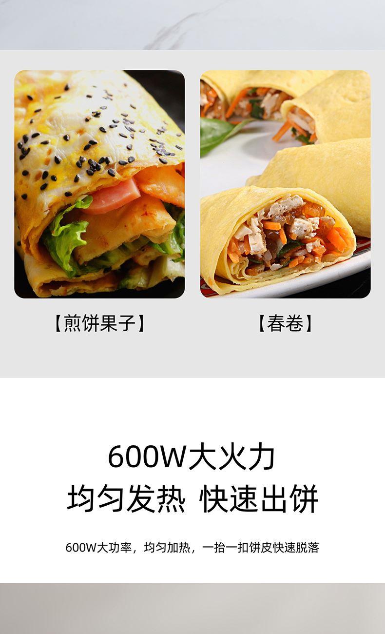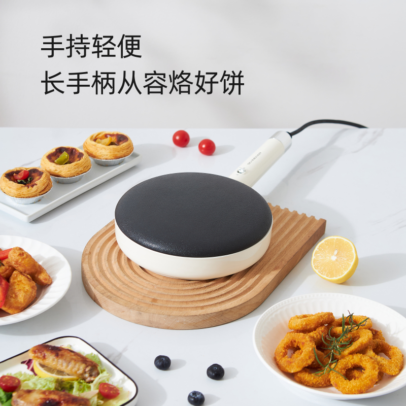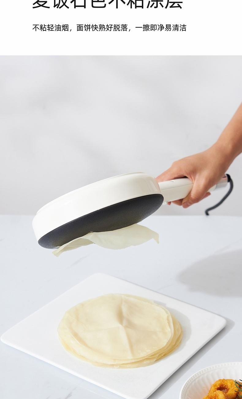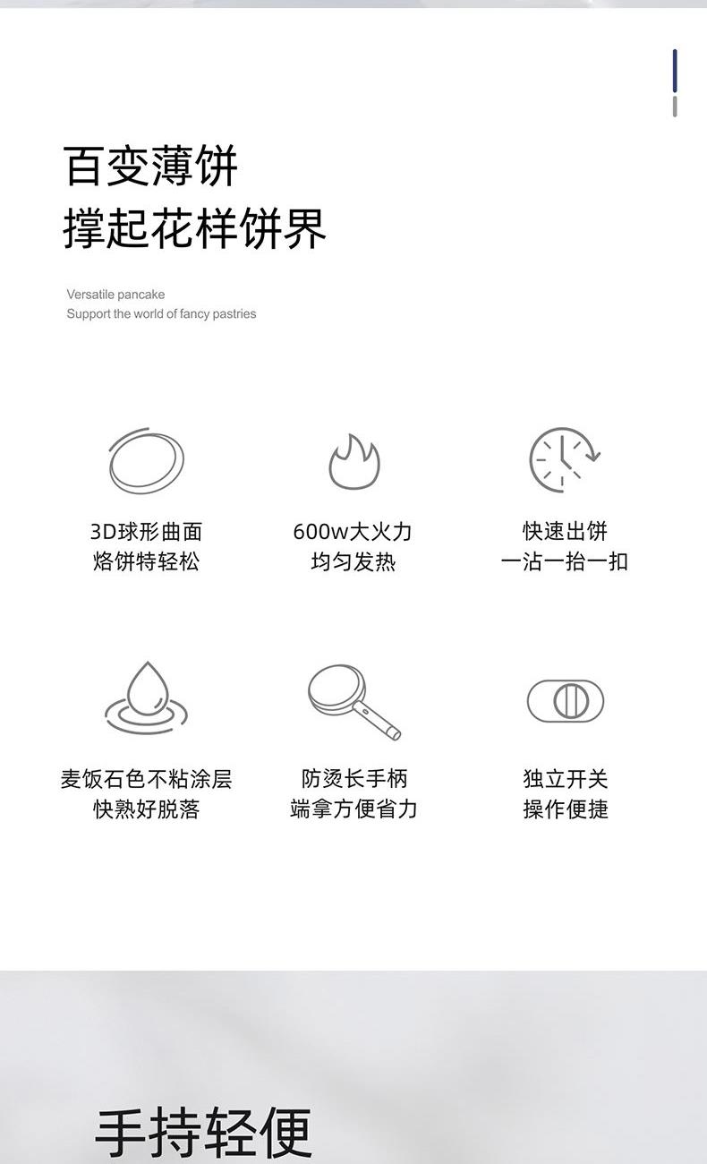 产品颜色:月光白 产品材质:麦饭石色不粘图层 额定电压:220V~ 额定频率:50Hz 额定功率:600W 额定容量:640mL 单台净重:0.82kg 单台毛重:1.10kg 产品尺寸:200*380*60mm 内箱尺寸:440*88*234mm 外箱尺寸:440*88*234mm 产品清单:主机*1/电源线*1/说明书*1 3D球形曲面,烙饼特轻松 一沾一抬一扣,简单3步15S快速出饼 麦饭石色不粘图层,面饼快熟好脱落 防烫加长手柄设计,端拿方便省力 600w大火力均匀发热
