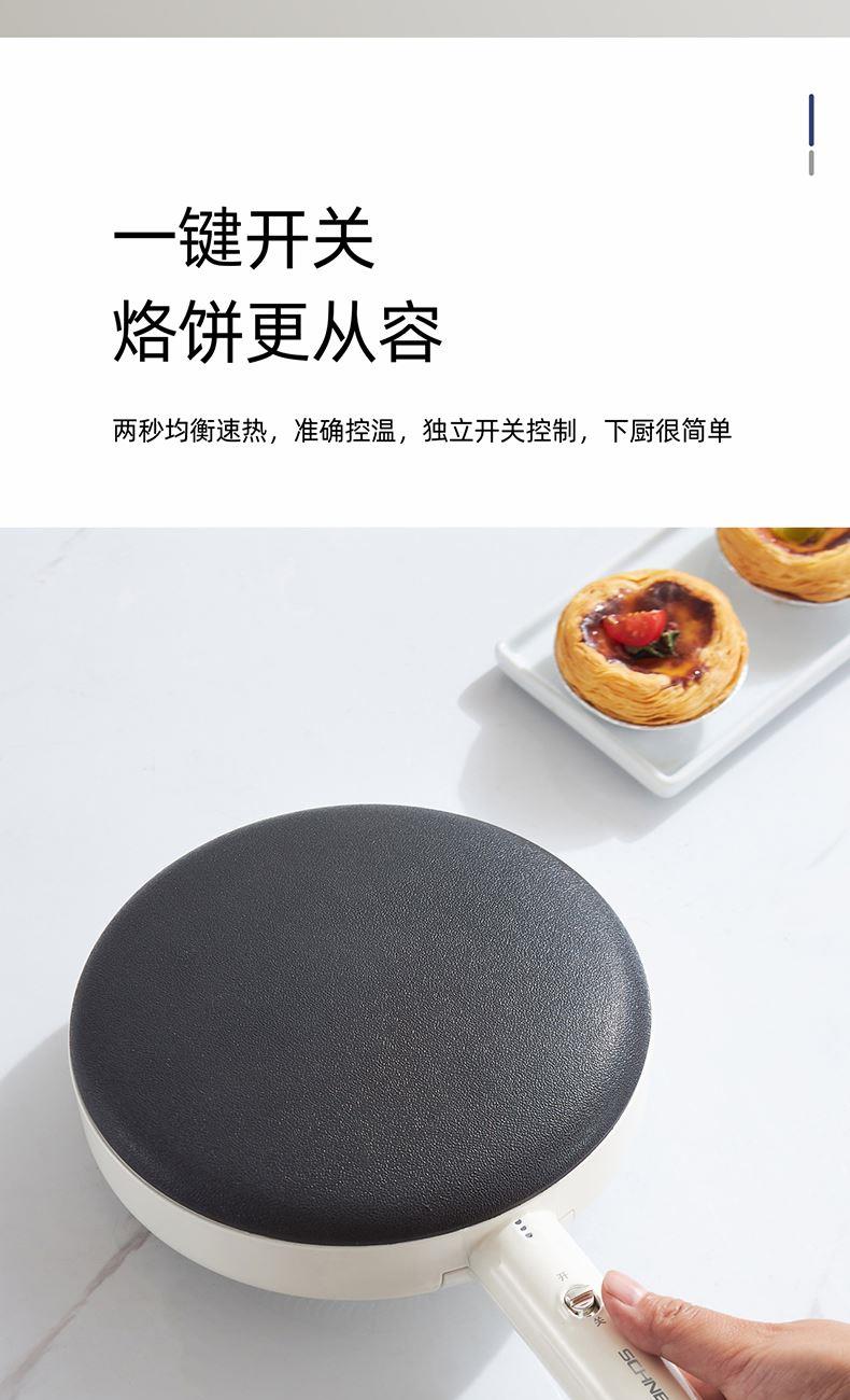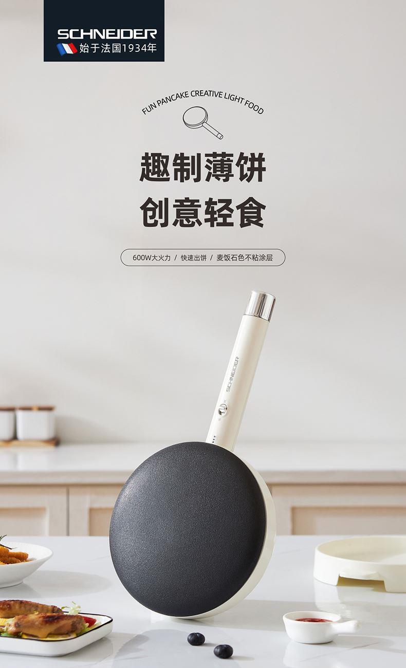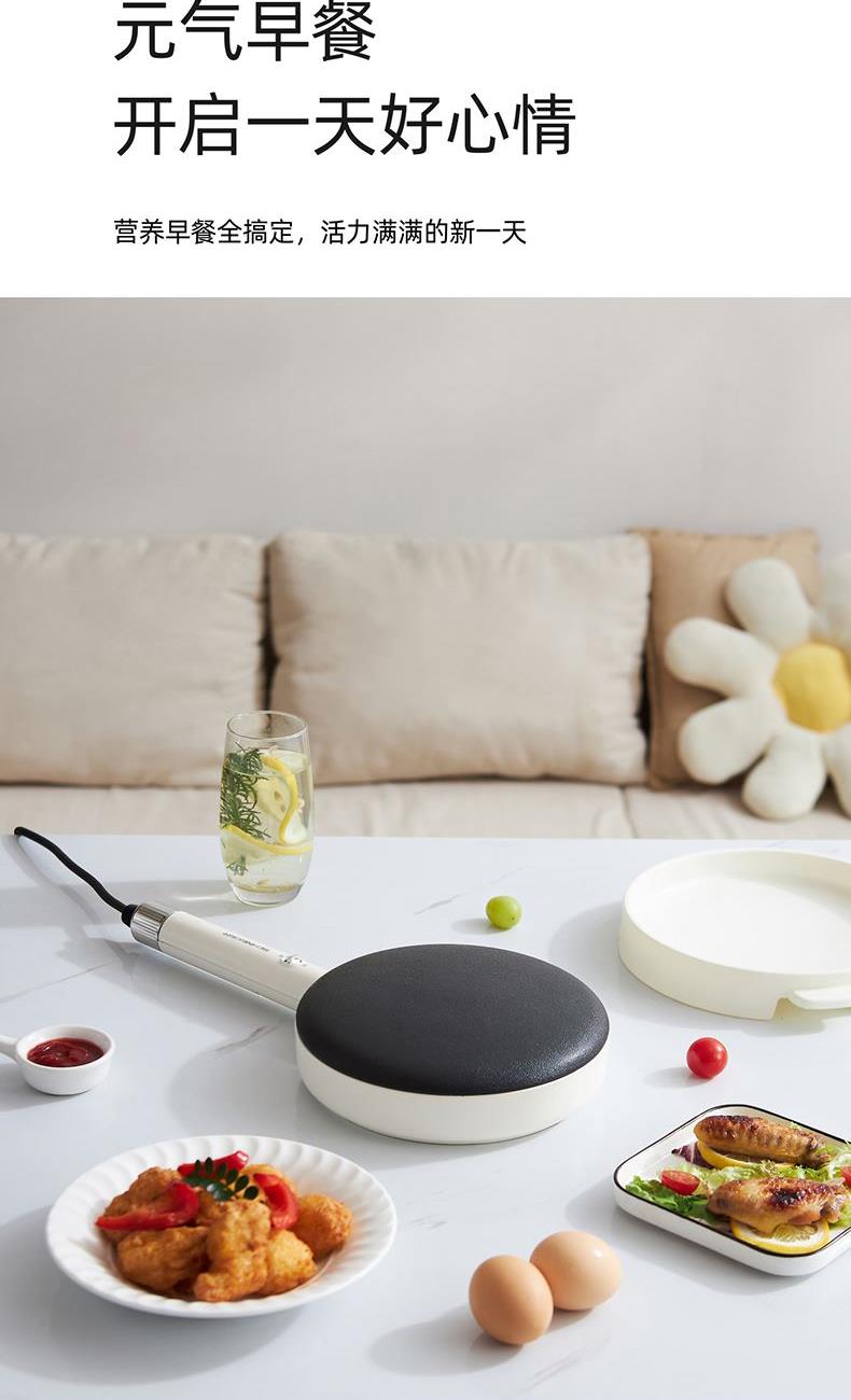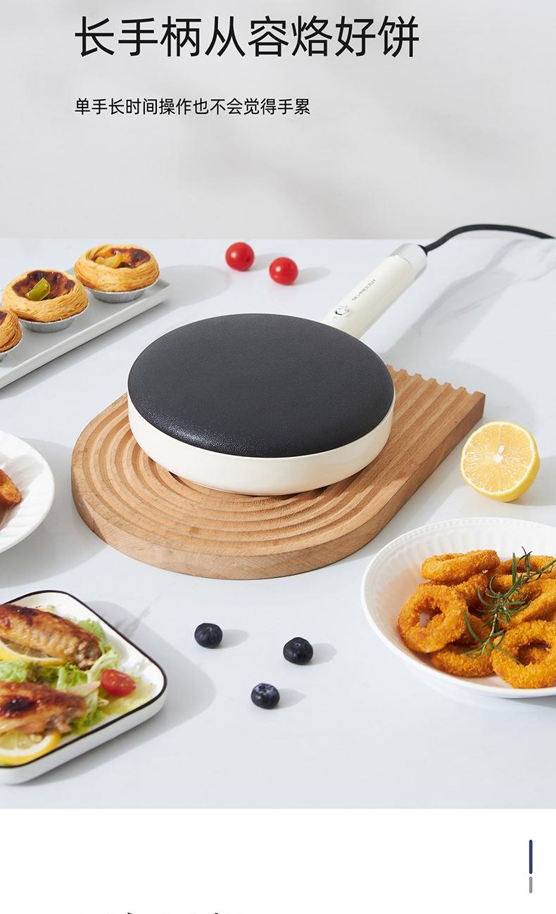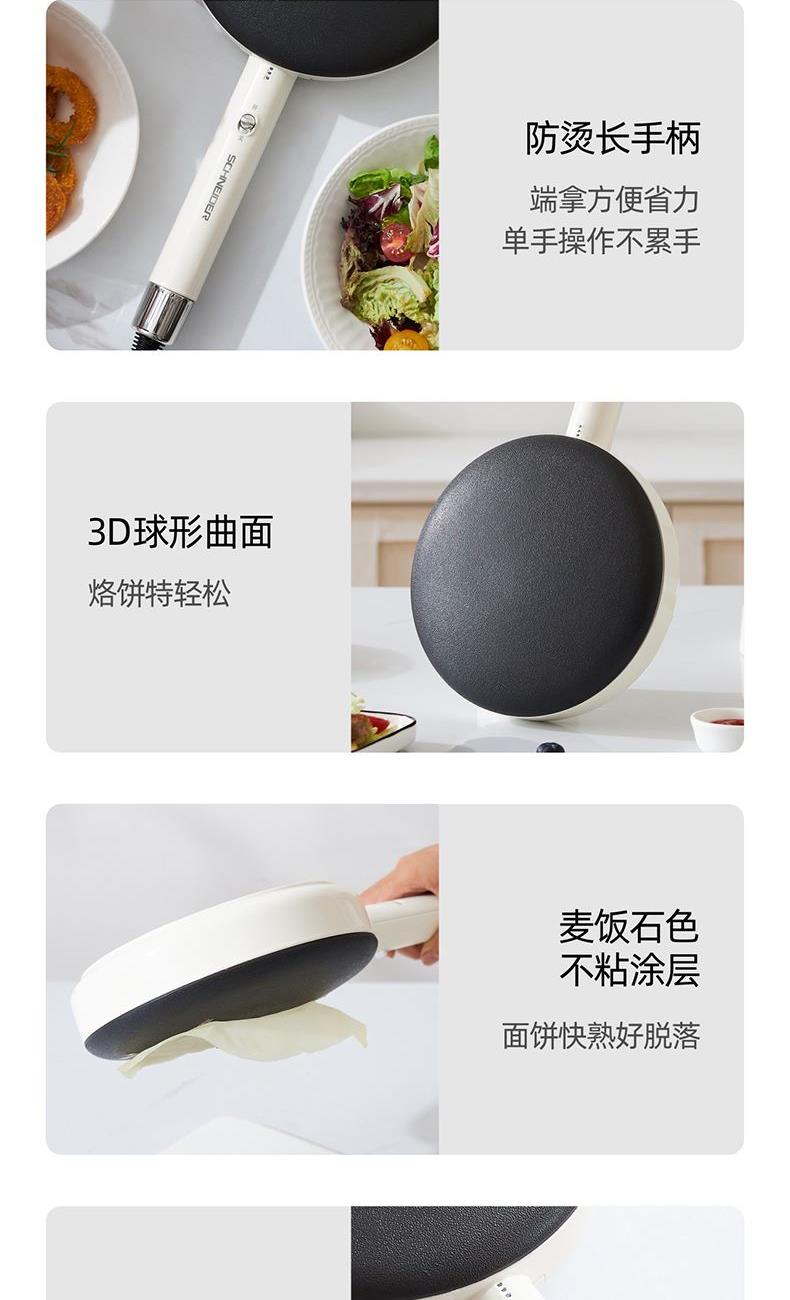 产品颜色:月光白 产品材质:麦饭石色不粘图层 额定电压:220V~ 额定频率:50Hz 额定功率:600W 额定容量:640mL 单台净重:0.82kg 单台毛重:1.10kg 产品尺寸:200*380*60mm 内箱尺寸:440*88*234mm 外箱尺寸:440*88*234mm 产品清单:主机*1/电源线*1/说明书*1 3D球形曲面,烙饼特轻松 一沾一抬一扣,简单3步15S快速出饼 麦饭石色不粘图层,面饼快熟好脱落 防烫加长手柄设计,端拿方便省力 600w大火力均匀发热