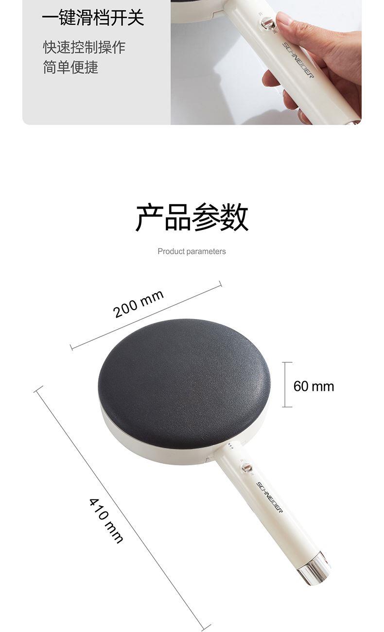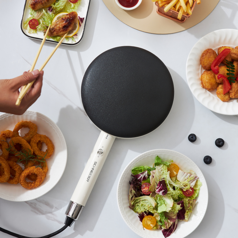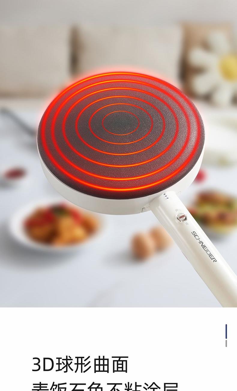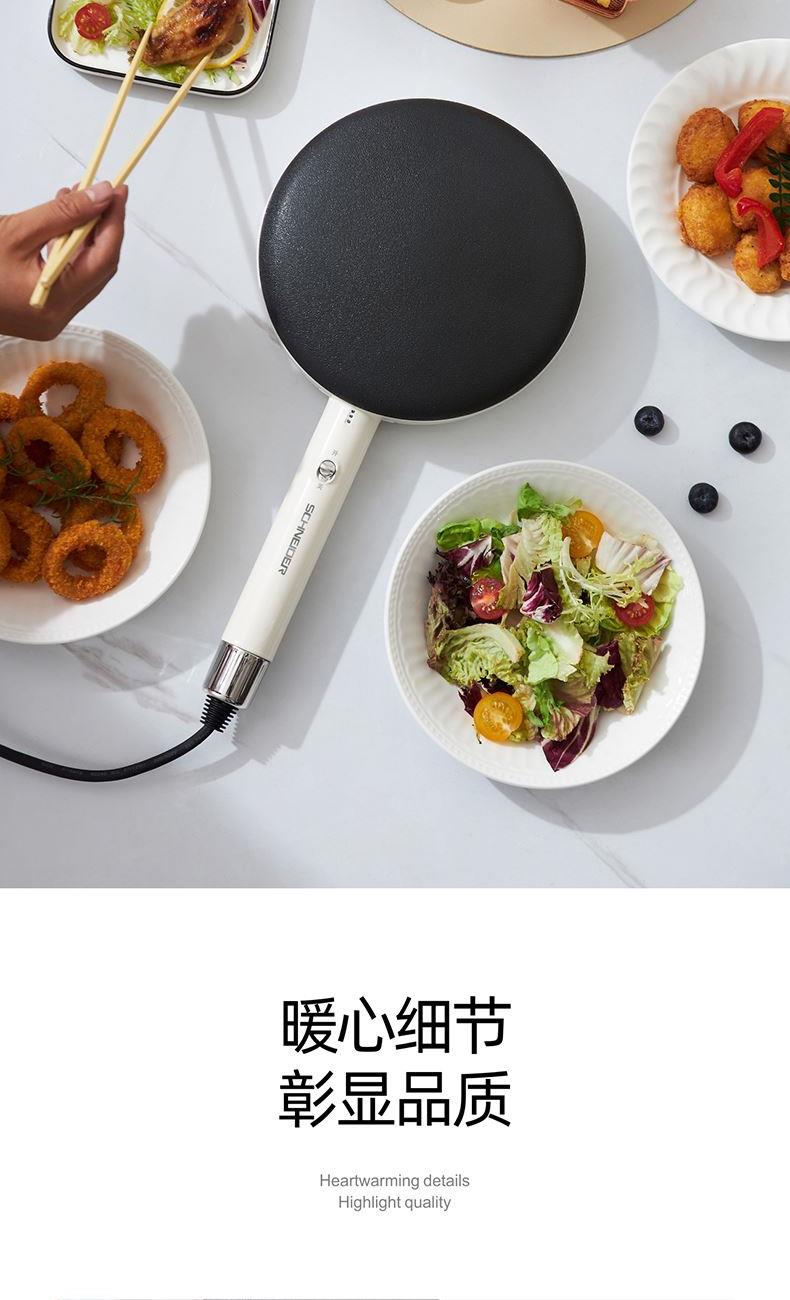 产品颜色:月光白 产品材质:麦饭石色不粘图层 额定电压:220V~ 额定频率:50Hz 额定功率:600W 额定容量:640mL 单台净重:0.82kg 单台毛重:1.10kg 产品尺寸:200*380*60mm 内箱尺寸:440*88*234mm 外箱尺寸:440*88*234mm 产品清单:主机*1/电源线*1/说明书*1 3D球形曲面,烙饼特轻松 一沾一抬一扣,简单3步15S快速出饼 麦饭石色不粘图层,面饼快熟好脱落 防烫加长手柄设计,端拿方便省力 600w大火力均匀发热