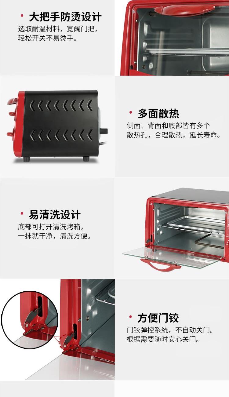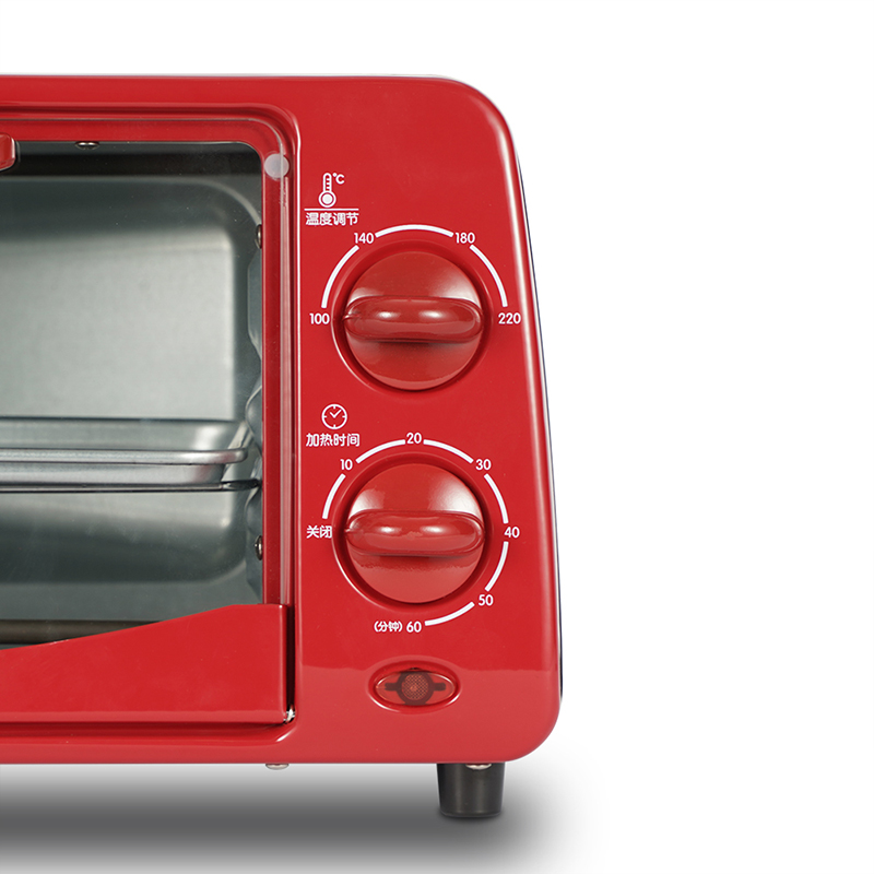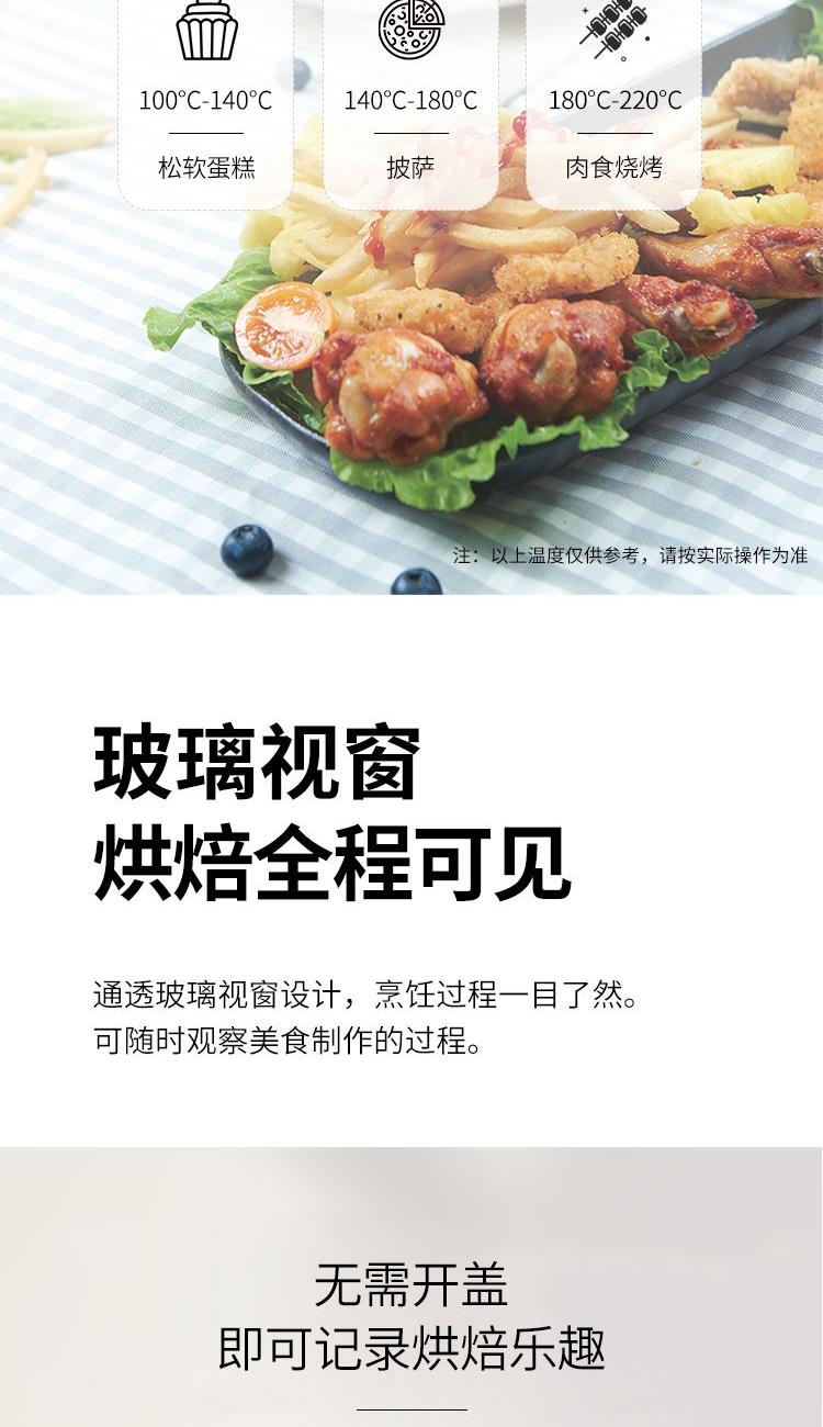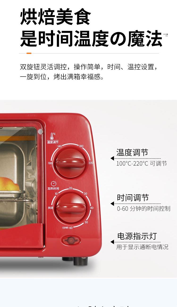 "1、内腔、烤盘均采用健康材质; 2、背面多个散热孔,快速散热; 3、60min定时,220℃控温; 4、玻璃视窗,可视烹饪,可拆洗屑盘; 5、功率800W,容量10L。"