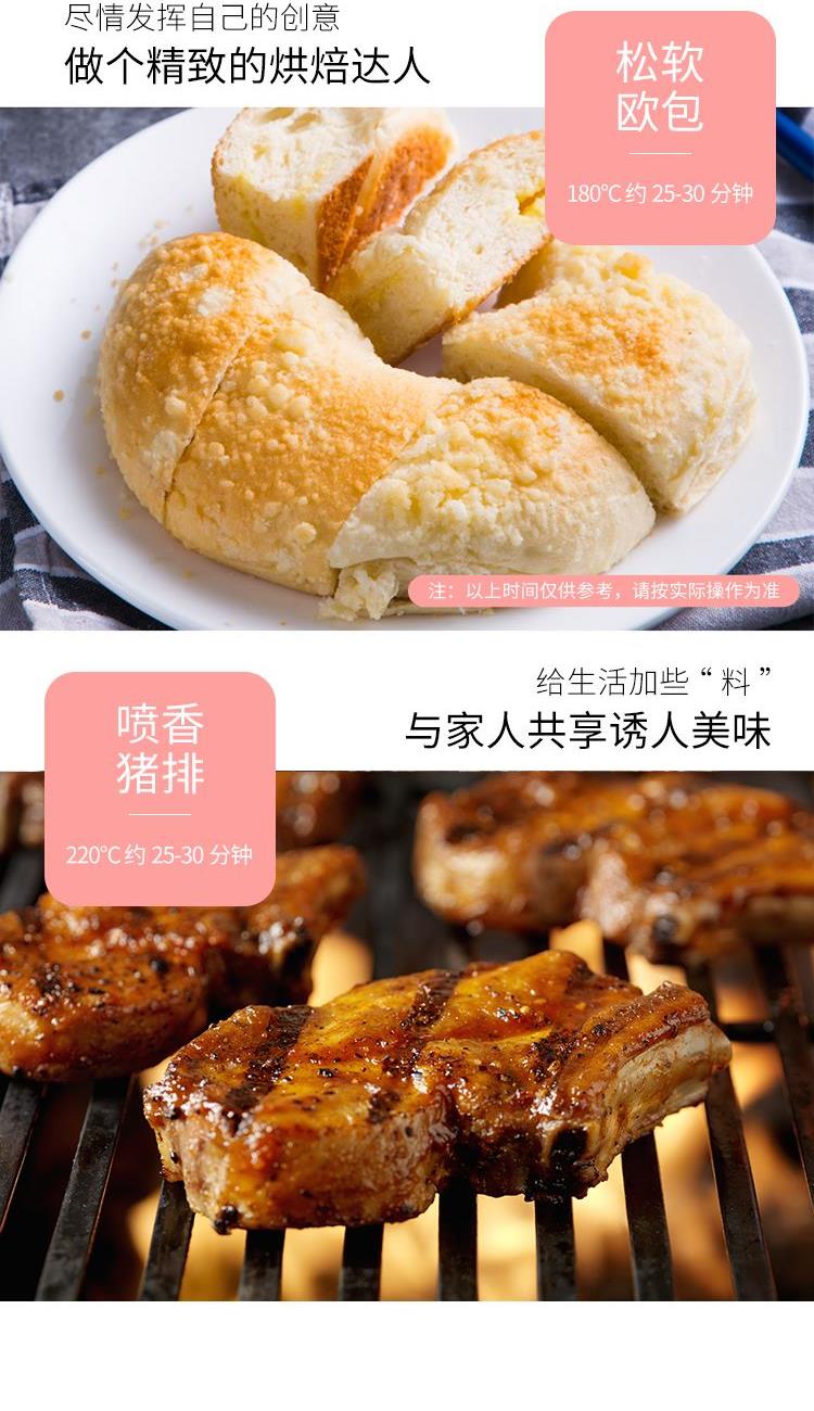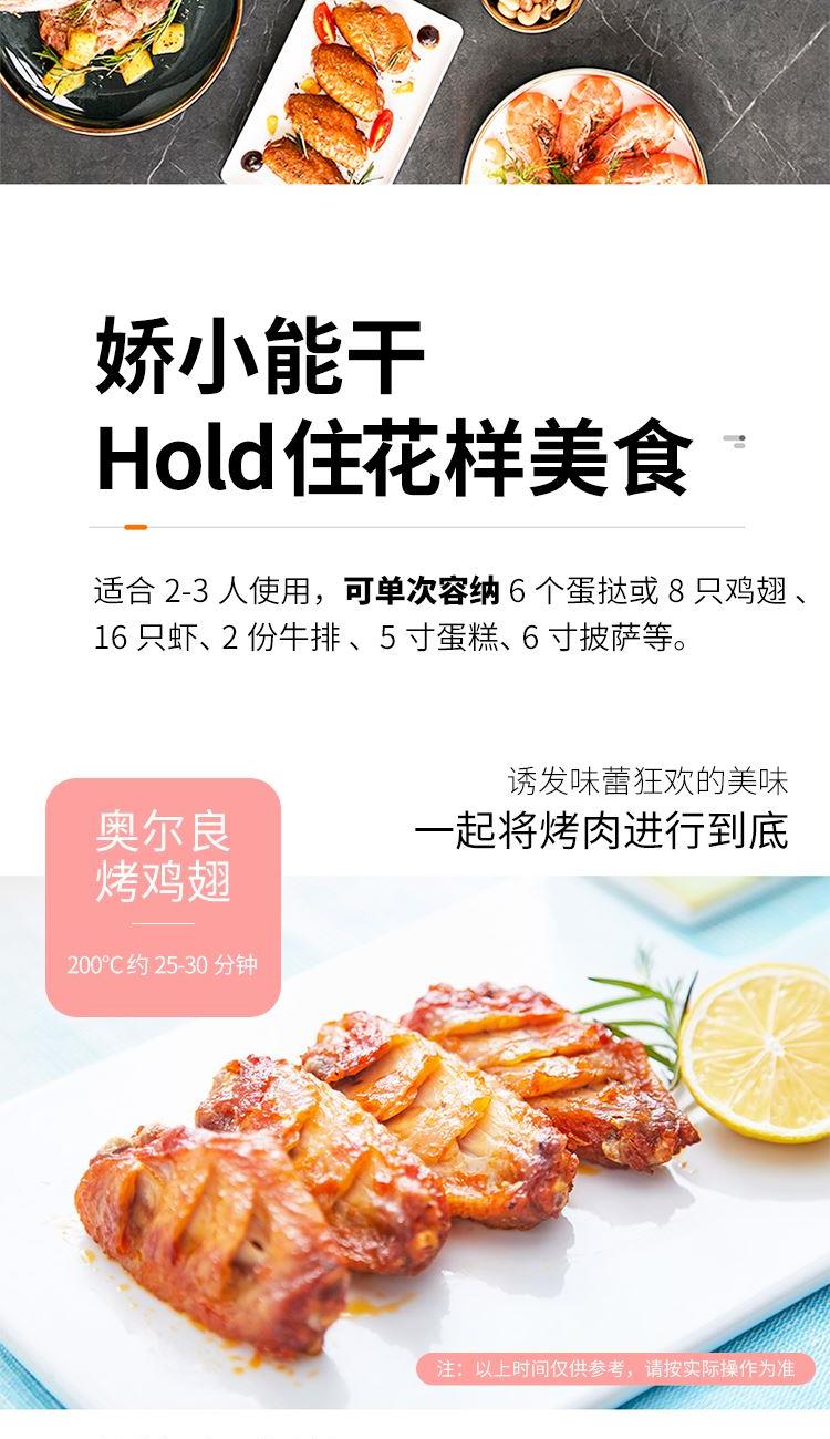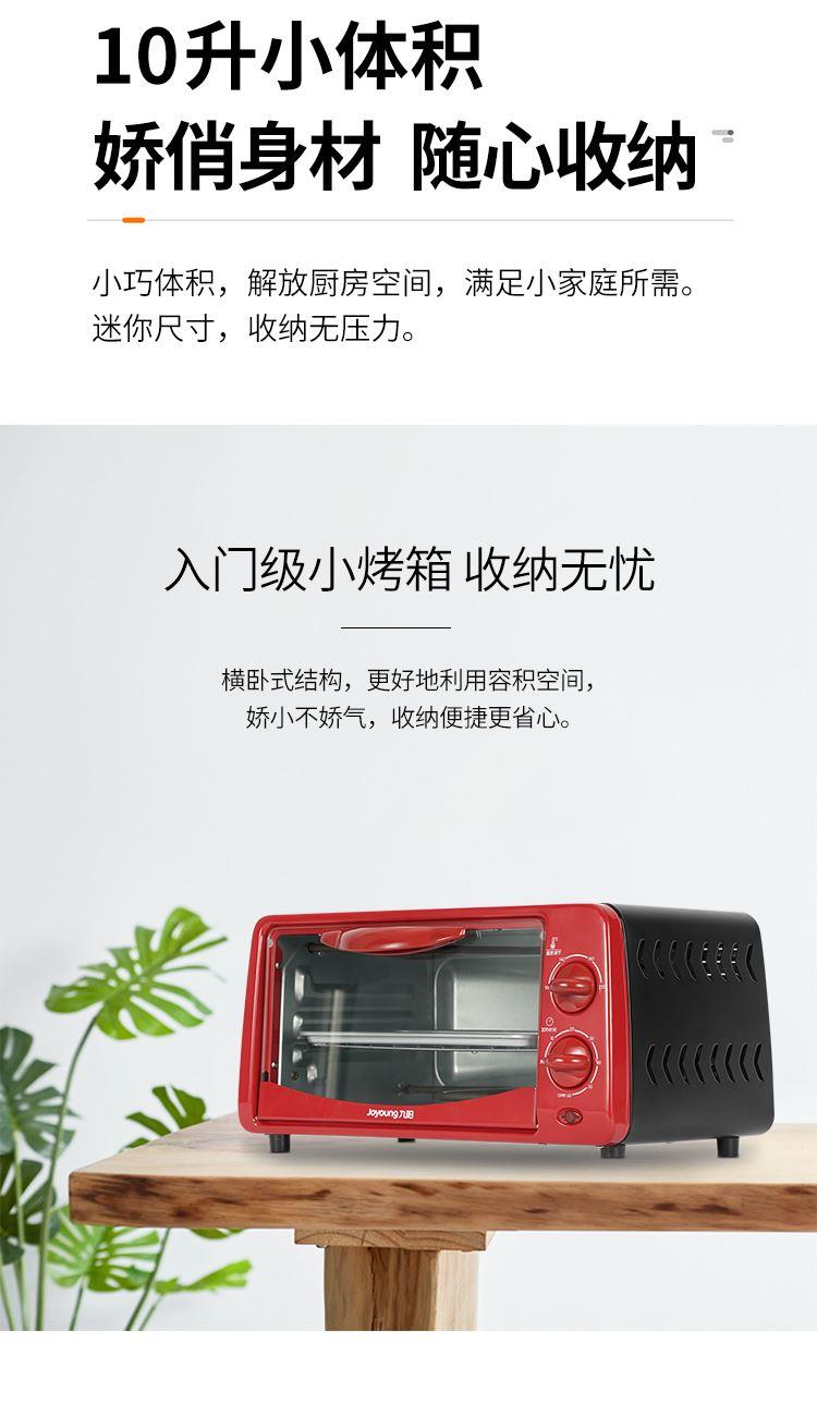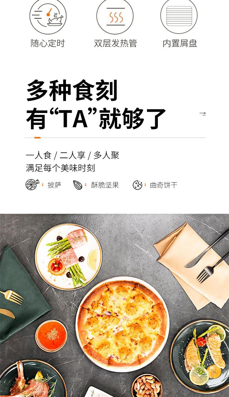 "1、内腔、烤盘均采用健康材质; 2、背面多个散热孔,快速散热; 3、60min定时,220℃控温; 4、玻璃视窗,可视烹饪,可拆洗屑盘; 5、功率800W,容量10L。"