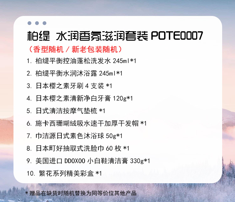 配置:(香型随机/新老包装随机) 1.柏缇平衡控油蓬松洗发水245ml*1 2.柏缇平衡水润沐浴露245ml*1 3.日本樱之素牙刷4支装*1 4.日本樱之素清新净白牙膏120g*1 5.日式清洁按摩气垫梳*1 6.施卡西珊瑚绒吸水速干加厚干发帽*1 7.巾洁源日式素色沐浴球50g*1 8.日本町好抽取式洗脸巾60枚*1 9.美国进口DDOXOO小白鞋清洁膏330g*1 10.繁花系列精美彩盒*1