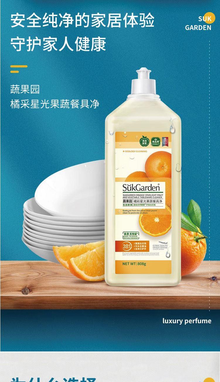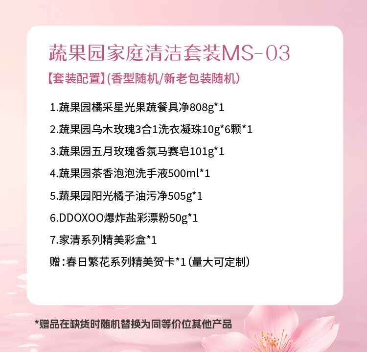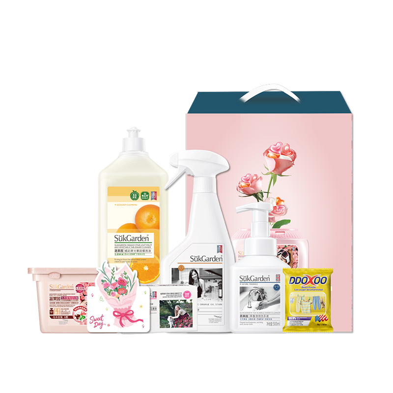 【套装配置】(香型随机/新老包装随机) 1.蔬果园橘采星光果蔬餐具净808g*1 2.蔬果园乌木玫瑰3合1洗衣凝珠10g*6颗*1 3.蔬果园五月玫瑰香氛马赛皂101g*1 4.蔬果园茶香泡泡洗手液500ml*1 5.蔬果园阳光橘子油污净505g*1 6.DDOXOO爆炸盐彩漂粉50g*1 7.家清系列精美彩盒*1 赠:春日繁花系列精美贺卡*1(量大可定制)