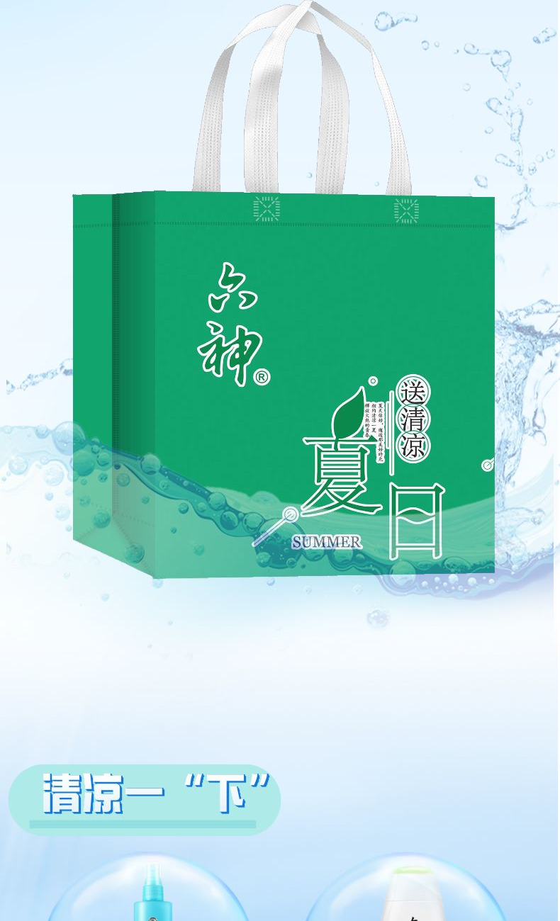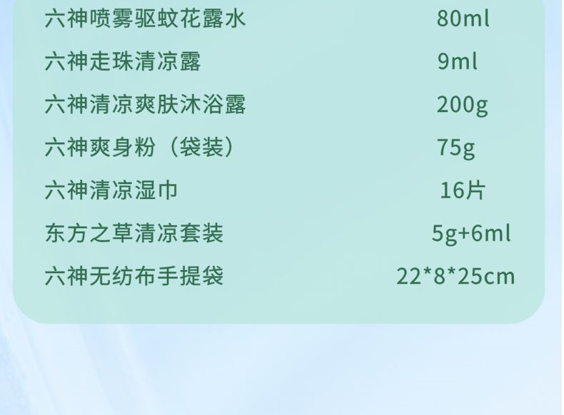 套装配置: 六神喷雾驱蚊花露水80ml 六神走珠清凉露9ml 六神清凉爽肤沐浴露200g 六神爽身粉(袋装)75g 六神清凉湿巾16片 东方之草清凉套装5g+6ml 六神无纺布手提袋22*8*25cm 礼盒重量:641g 礼盒尺寸: 22*8*25cm