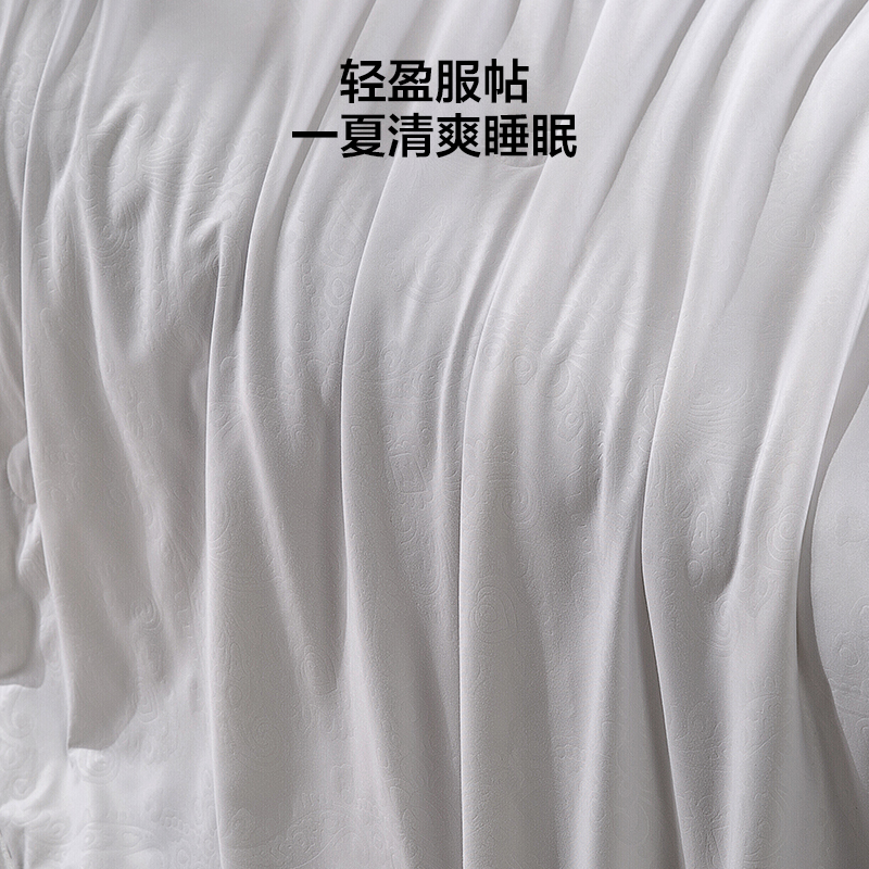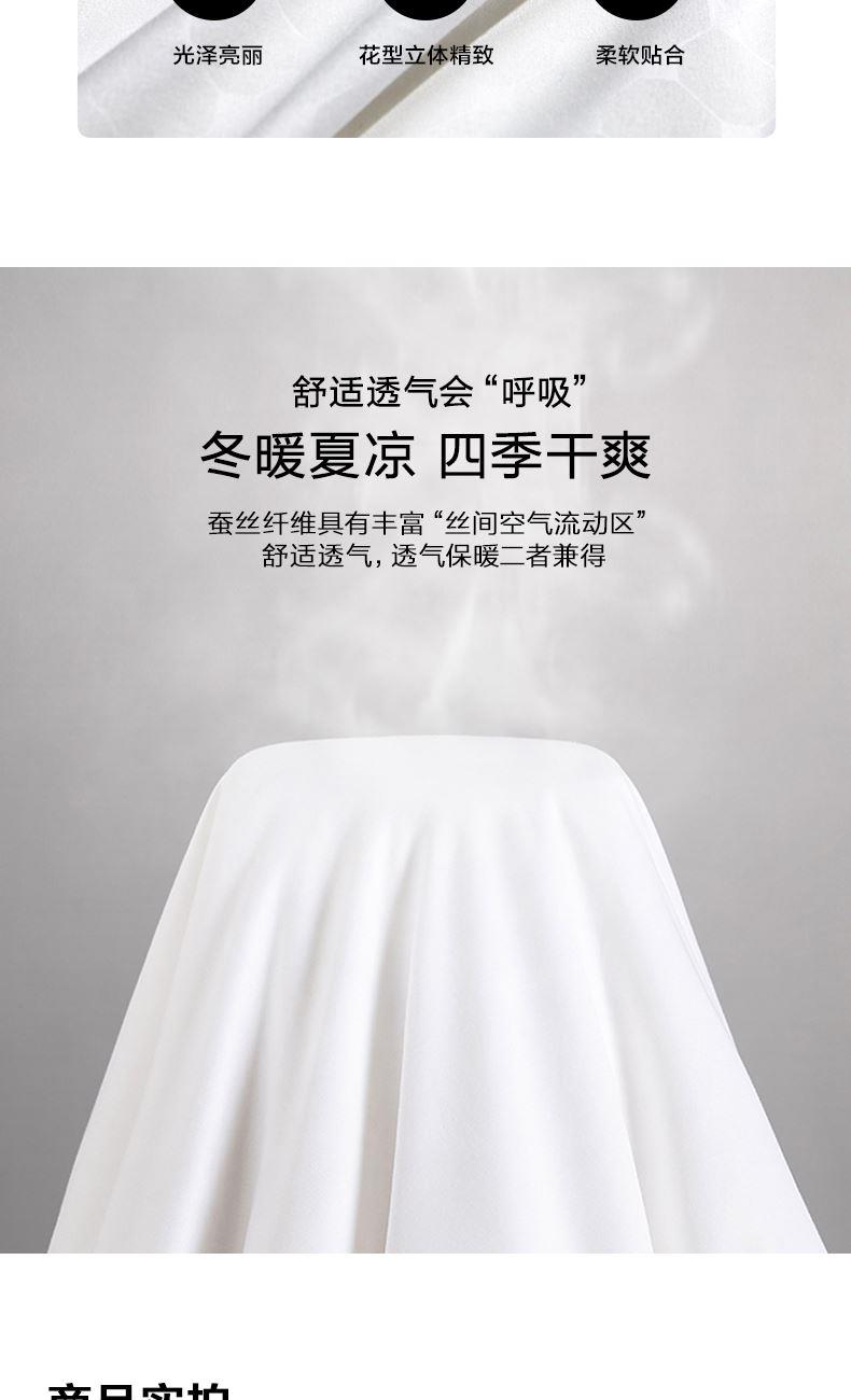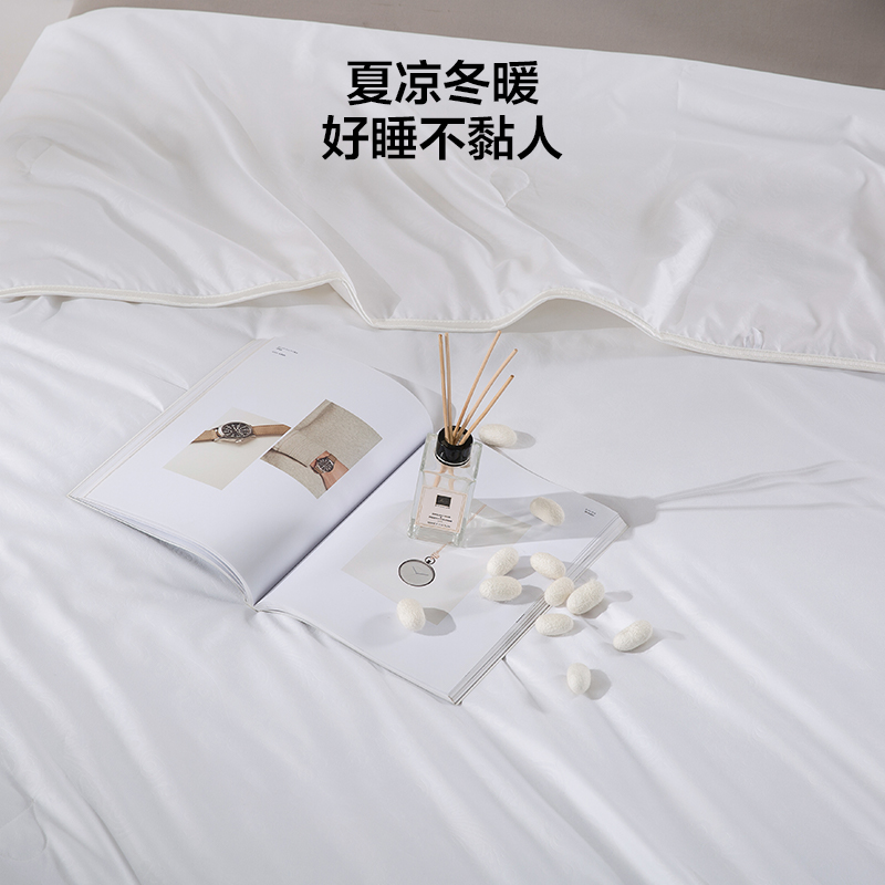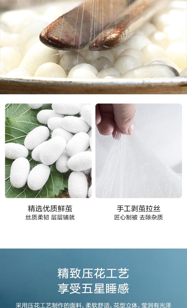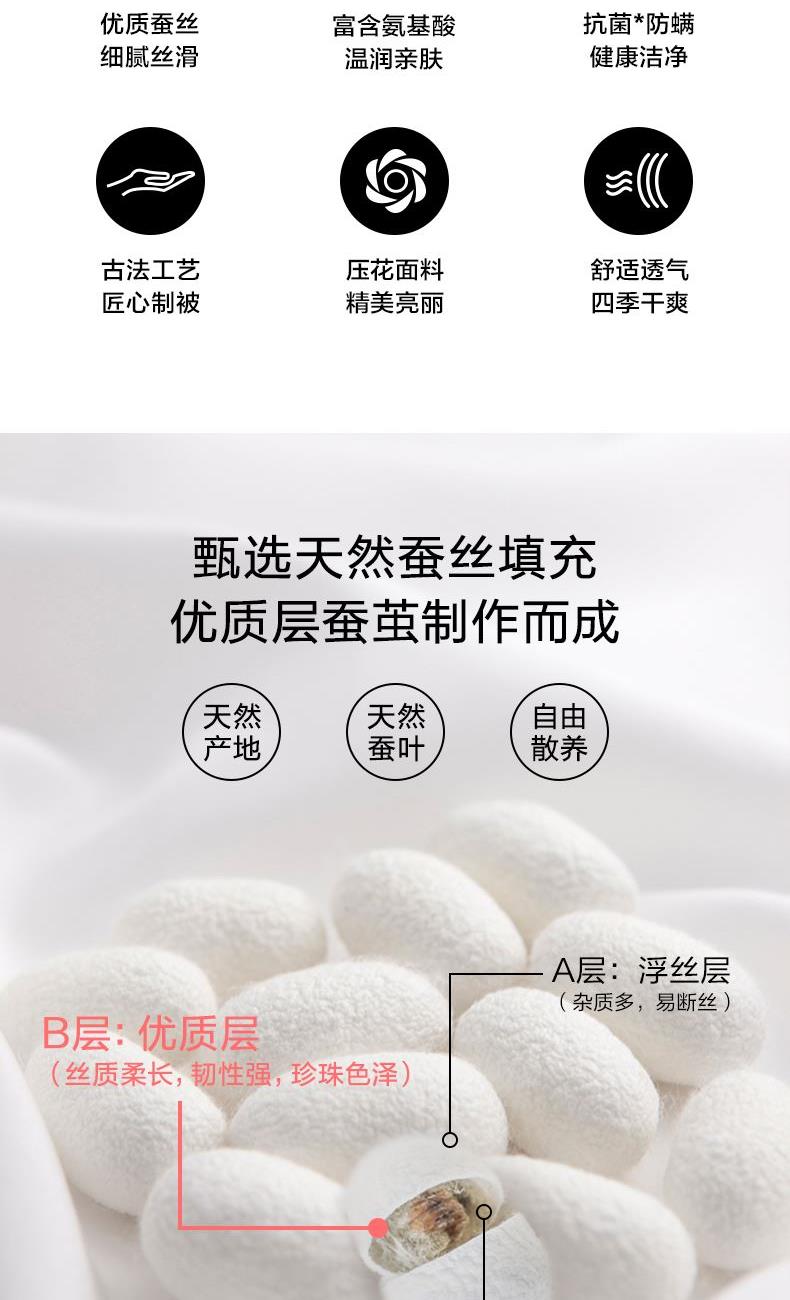 面料材质:聚酯纤维 规格尺寸:200*230cm 填充材质:柞蚕丝(中长丝棉) 填充克重:400g 产品包装:礼盒 1:*防螨面料舒适睡眠无忧虑,给你安心好眠,防止螨虫入侵,呵护肌肤健康。 2:甄选天然蚕丝填充优质层蚕茧制作而成,蚕丝为天然的蛋白纤维,其中蚕丝丝素蛋白含有多种氨基酸和微量元素,对肌肤有高亲和力,时刻享受轻柔呵护 3:精致压花工艺享受五星睡感,采用压花工艺制作的面料,柔软舒适,花型立体,莹润有光泽