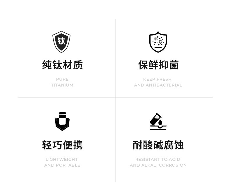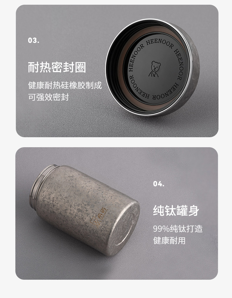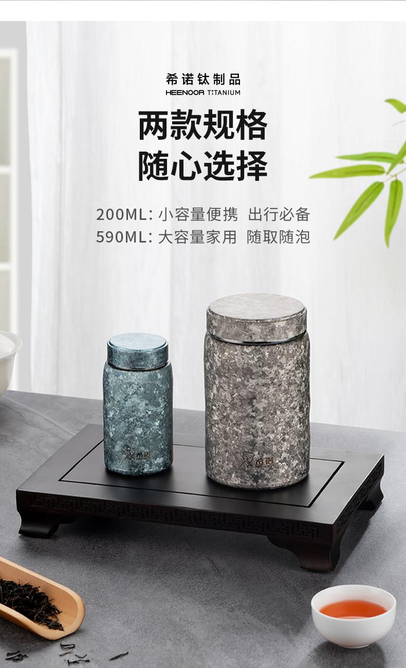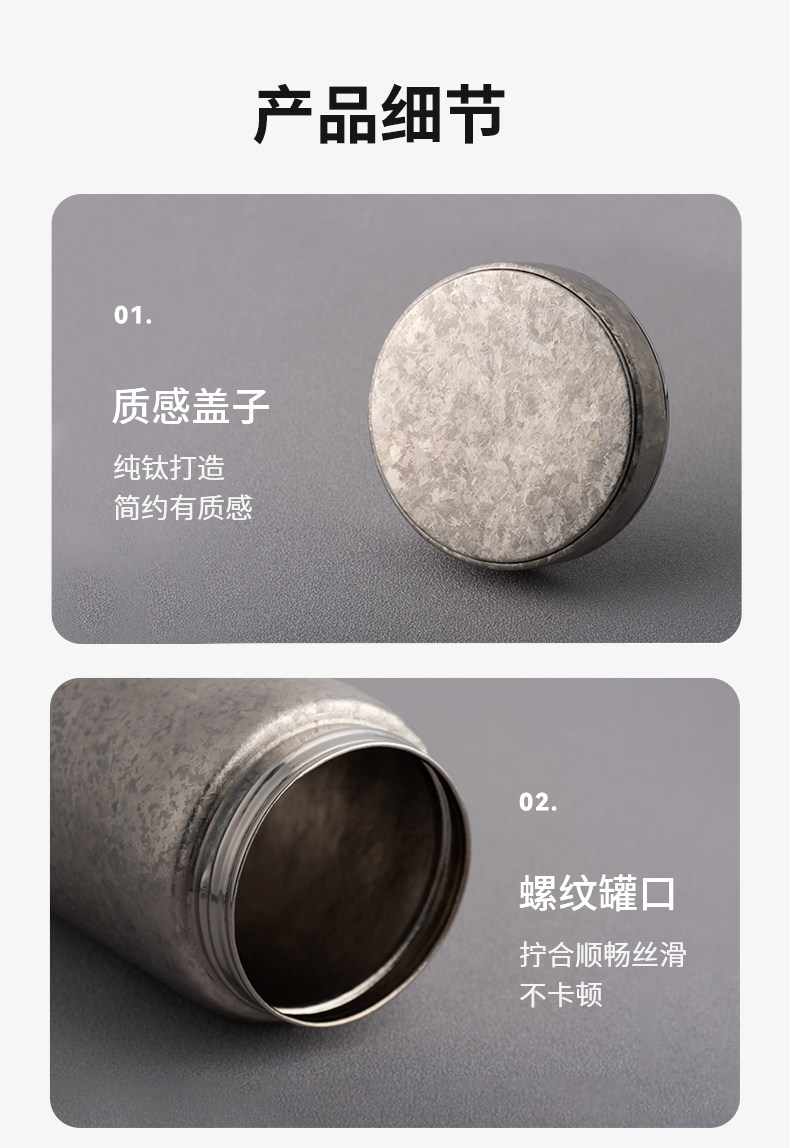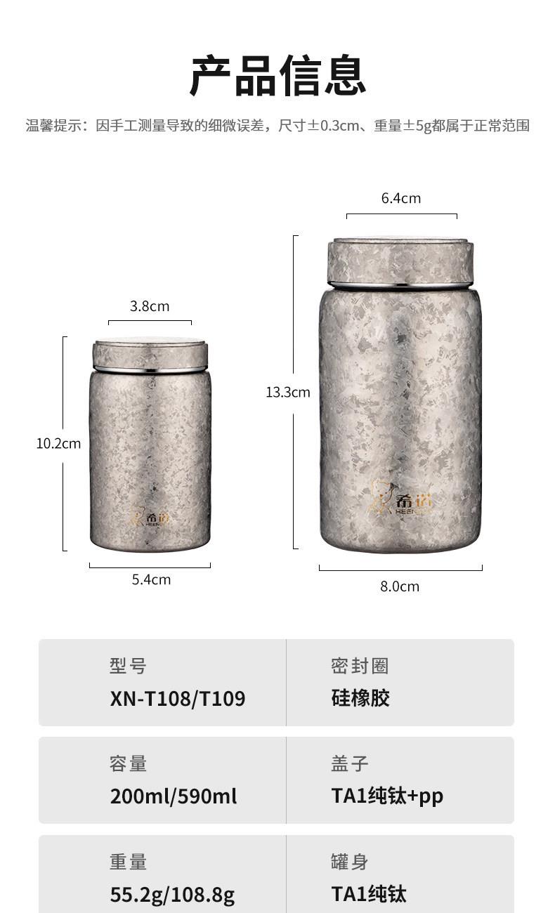 材质:钛 颜色:银月白/远天蓝/烟墨灰 附加组件:无附件组件 密封圈:硅橡胶 容量:200ml/590ml 外箱尺寸:62*49*24 cm 毛净重:8.5/2.1 钛金属打造,健康安全 保温保冷,耐高低温 耐酸碱腐蚀 无喷漆,不易掉色