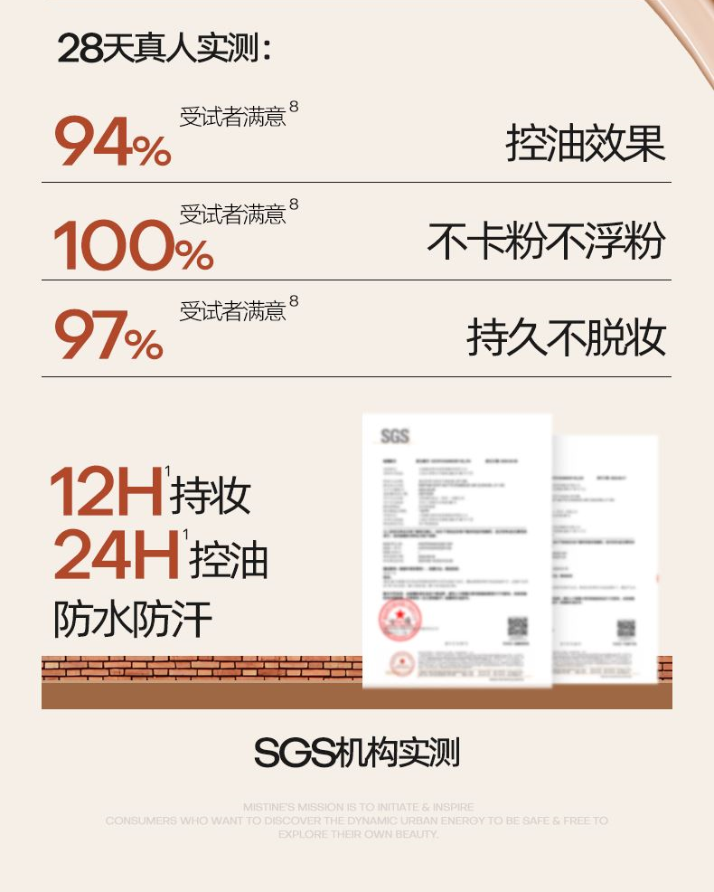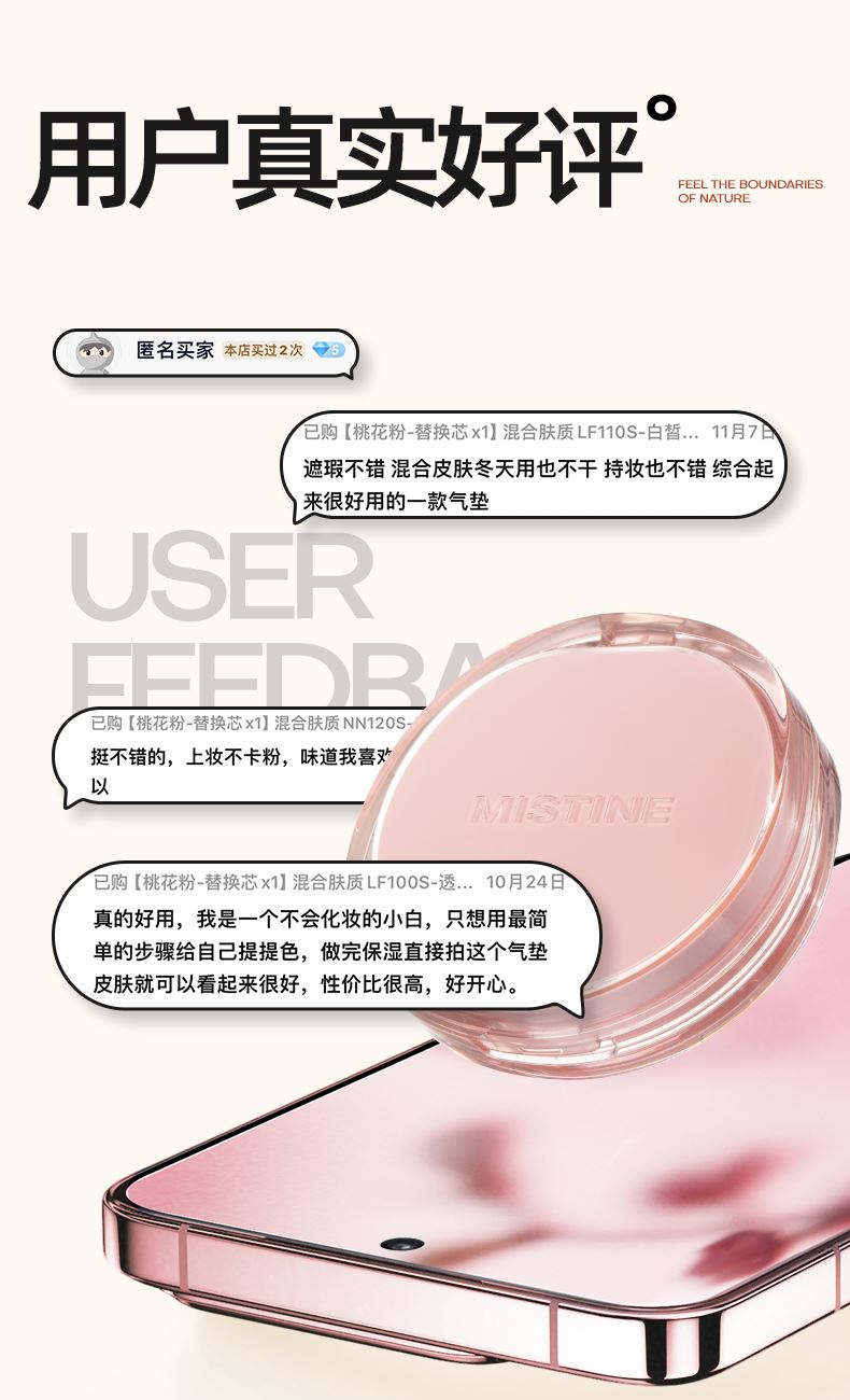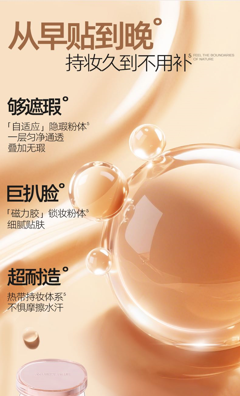 1.奶润 两万目网纱科技处理工艺,超柔软触感 料体与精华同时被细细过滤后筛出,上妆好像上面霜 2.细腻 40MM直径内大约有25000个微小孔径 出料更细密,铺开底妆好像会呼吸 3.遮瑕 2.29mm/s出料速度,出料更细更多 多倍遮瑕,柔焦平整肌肤,瑕疵看不见 创新加入“抛光珠”粉体* 薄薄一层,给肌肤做一次抛光SPA p 在粉底液使用前中后,不断自动化研磨,冲散集聚粉体,使得粉质 细腻丝滑易延展; p 同时粉体表面进行“抛光工艺处理”,粉体自带通透感,上脸给肌 肤做一次抛光SPA,上妆无遮盖粉感,只见通透光感