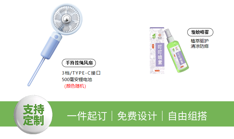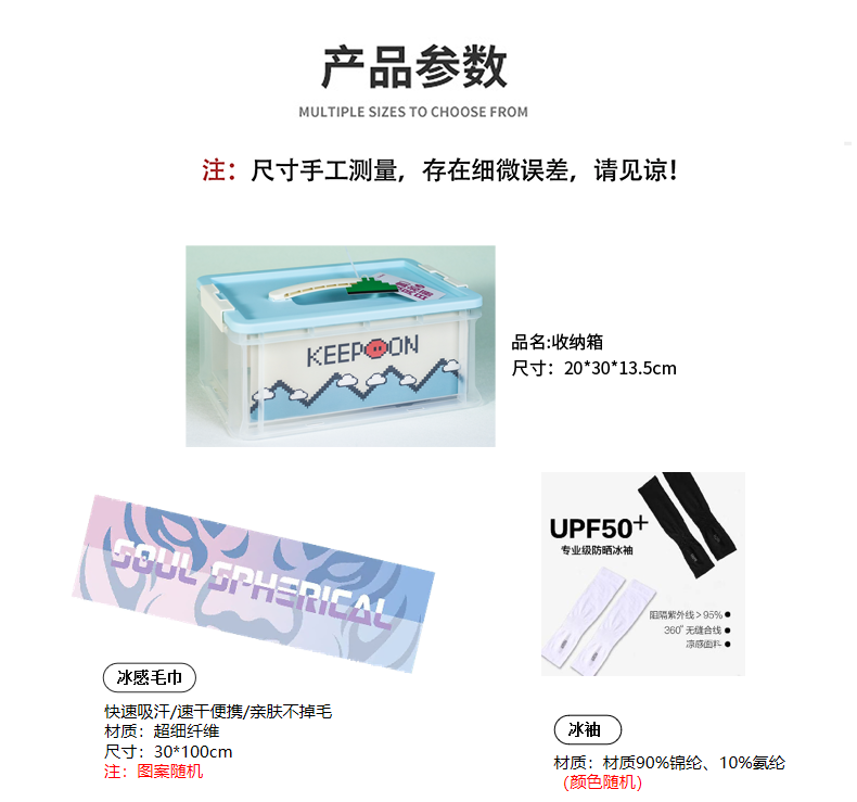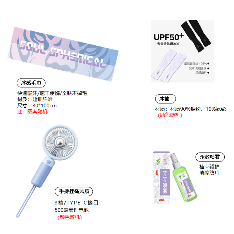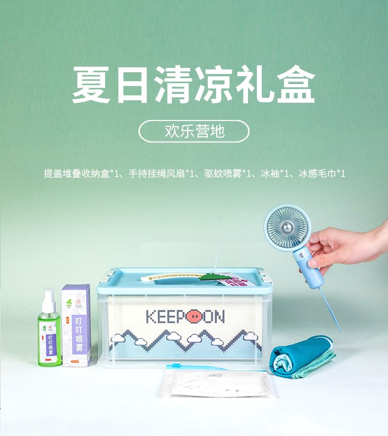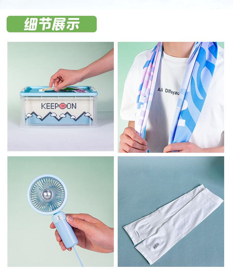 礼盒参数: 收纳盒尺寸:20*30*13.5cm 套装重量:800g/套 外箱尺寸:62*62*48cm 详细介绍: 1.冰感毛巾 快速吸汗/速干便携/亲肤不掉毛 材质:超细纤维 尺寸:30*100cm(图案随机) 2.冰袖 材质:材质90%锦纶、10%氨纶(颜色随机) 3.手持挂绳风扇 3档/TYPE-C接口 500毫安锂电池(颜色随机) 4.驱蚊喷雾 植萃驱护 清凉防痱