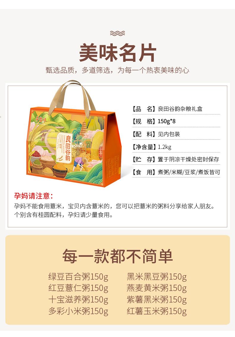 产品配置: 精选红米200g 精选燕麦米200g 精选高粱米200g 精选玉米糁200g 精选麦仁米200g 精选东北大米200g 净含量:1.2Kg 礼盒尺寸:34*11*28cm 一盒汇聚八款好粥,红豆薏仁祛湿,多彩小米养人,早餐晚餐随心选,轻松享受健康好滋味。