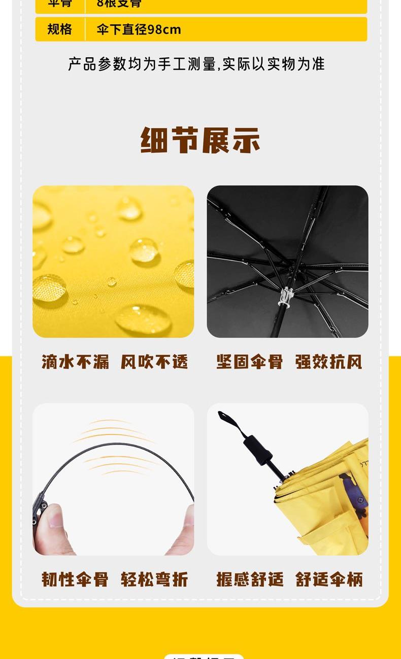 材 质:扇骨钢架,伞布黑胶布 规格尺寸:打开直径:980mm 折叠后高度:265mm 产品毛重:19KG 1.小巧便携,一键开合,轻松收纳于背包或手提包中, 2.不占空间,为你提供便利 3.精致的设计,优雅的色彩,让你在人群中脱颖而出,成为焦点 4.晴雨伞,晴雨随行,优雅守护每一刻 5.防晒功能强大,有效阻挡紫外线侵害,保护你的肌肤免受伤害 6.无论是户外旅行,还是日常通勤,它都是你不可或缺的防晒神器。