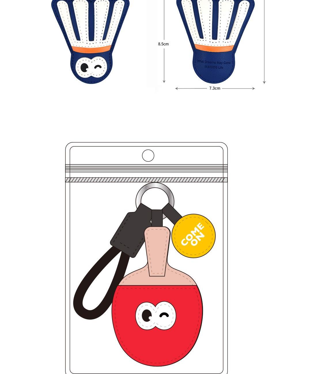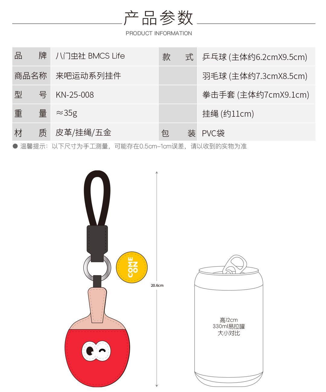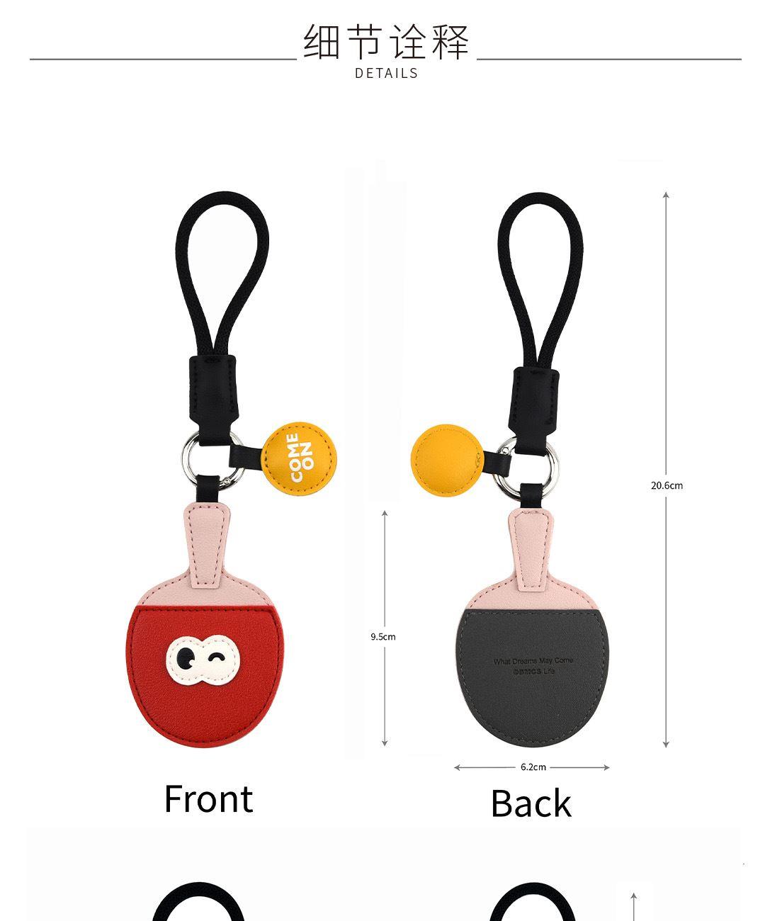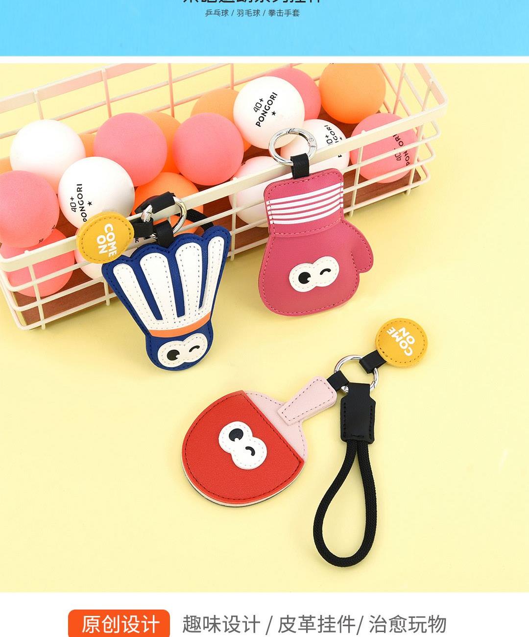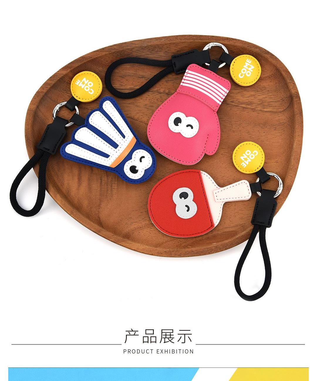 羽毛球(约19.5cmX7.3cm) 乒乓球(约20.2cmX6.2cm) 拳击手套(约20.5cmX7cm) 大小大概是一只掌心大小 产品可多功能使用 如做包挂挂件/钥匙扣/车挂件 选料选用PU皮材质,耐磨耐用不易变形 内里填棉线,柔软有弹性 做工上精致的缝合走线,牢固不脱线 挂件边缘皮革手工多边打磨,不毛糙,经久耐用