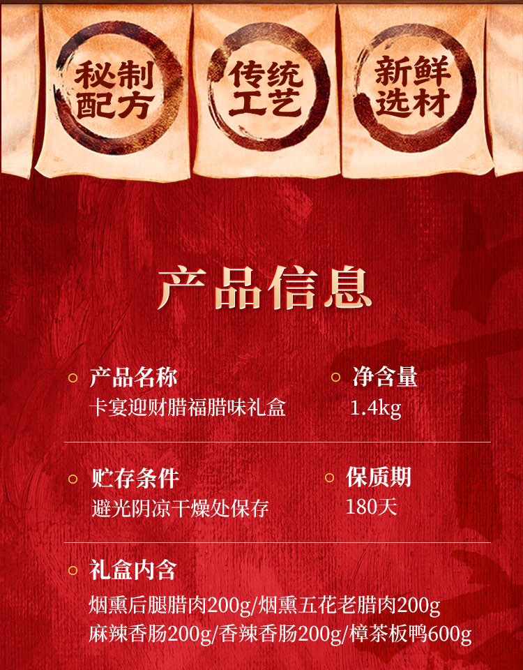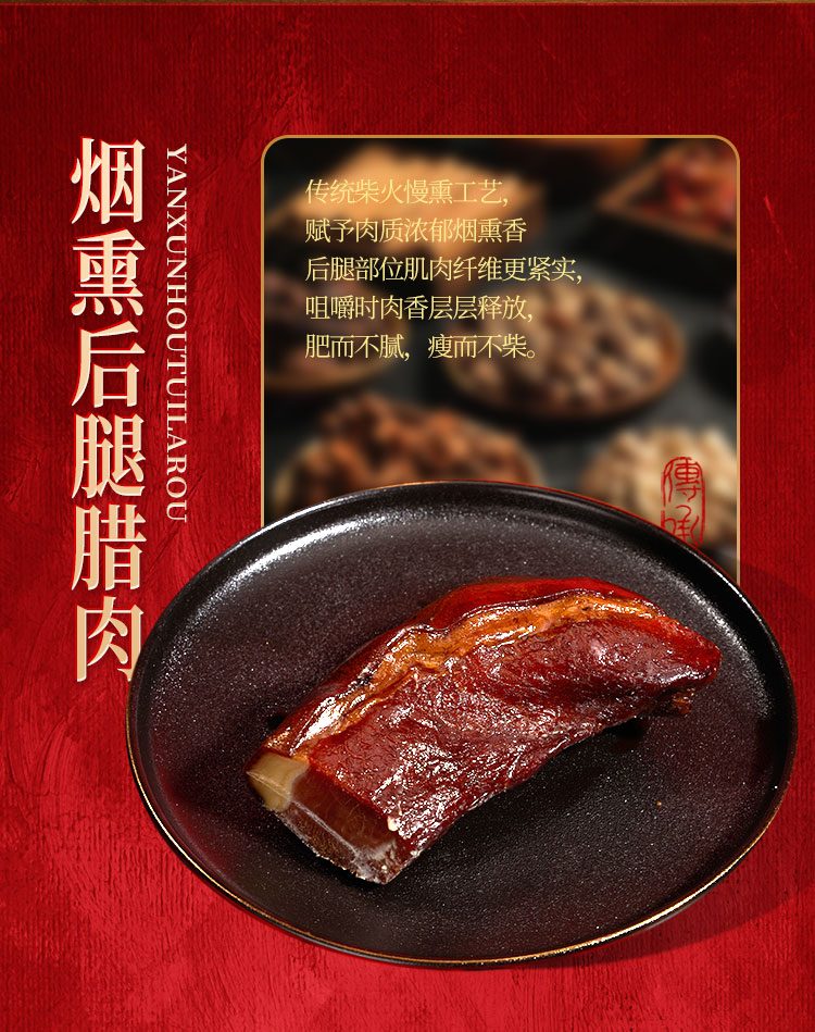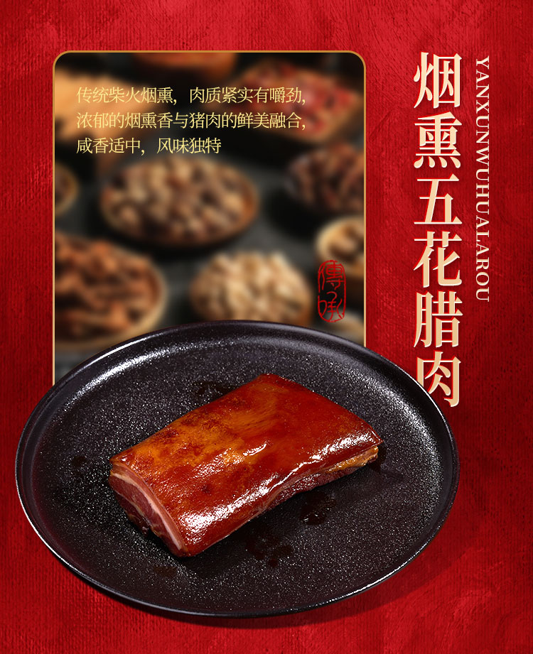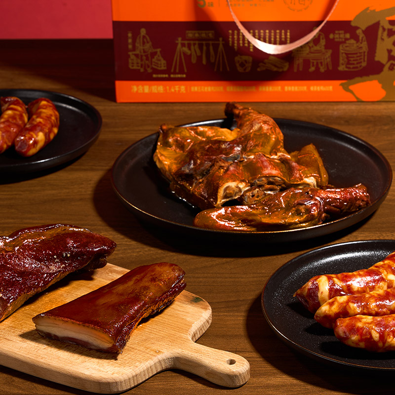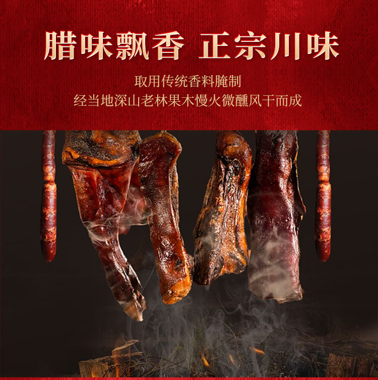 烟熏后腿腊肉200g 烟熏五花老腊肉200g 麻辣香肠200g 香辣香肠200g 樟茶板鸭600g