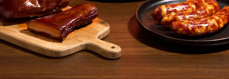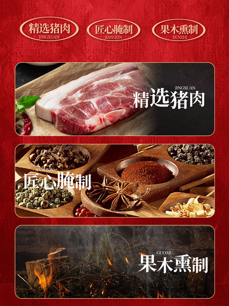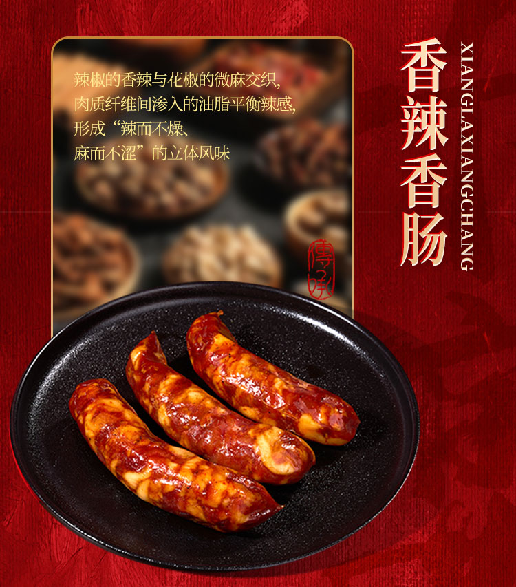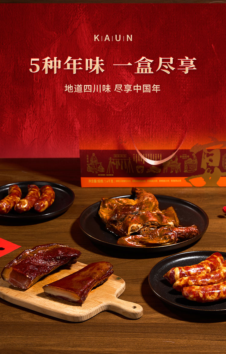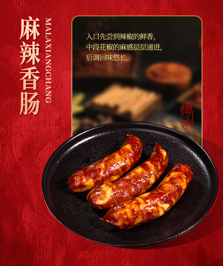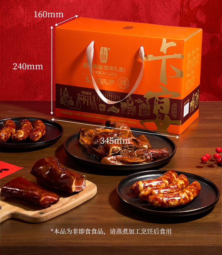 烟熏后腿腊肉200g 烟熏五花老腊肉200g 麻辣香肠200g 香辣香肠200g 樟茶板鸭600g
