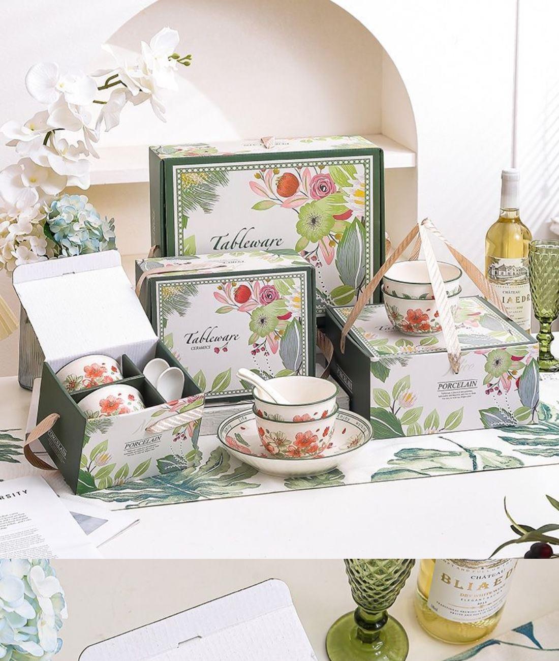 礼盒尺寸:11.8*23.8*19.2cm 外箱尺寸:50*40*62CM 21kg 材 质:新骨瓷 产品特点: 表面透明釉质保护层,可直接与食物接触。不含铅镉元素,安心享受美食滋味! 餐具整理厚实防烫,久经耐用,釉面光滑,清洗方便! 餐具包装美观大方,贴心手提设计,送礼大气又档次