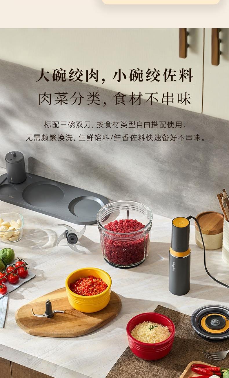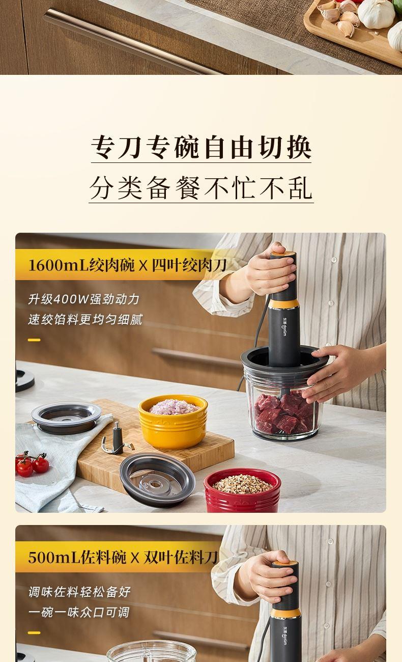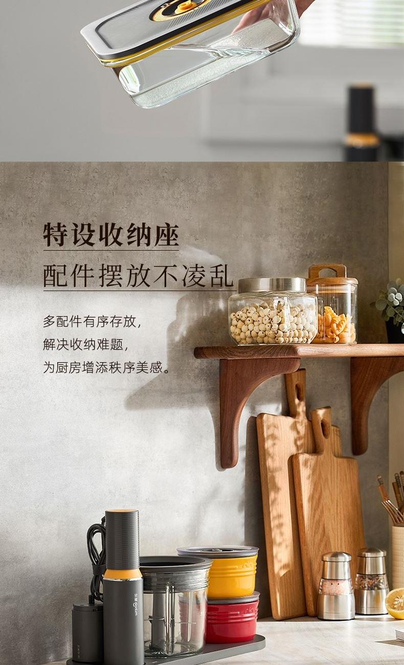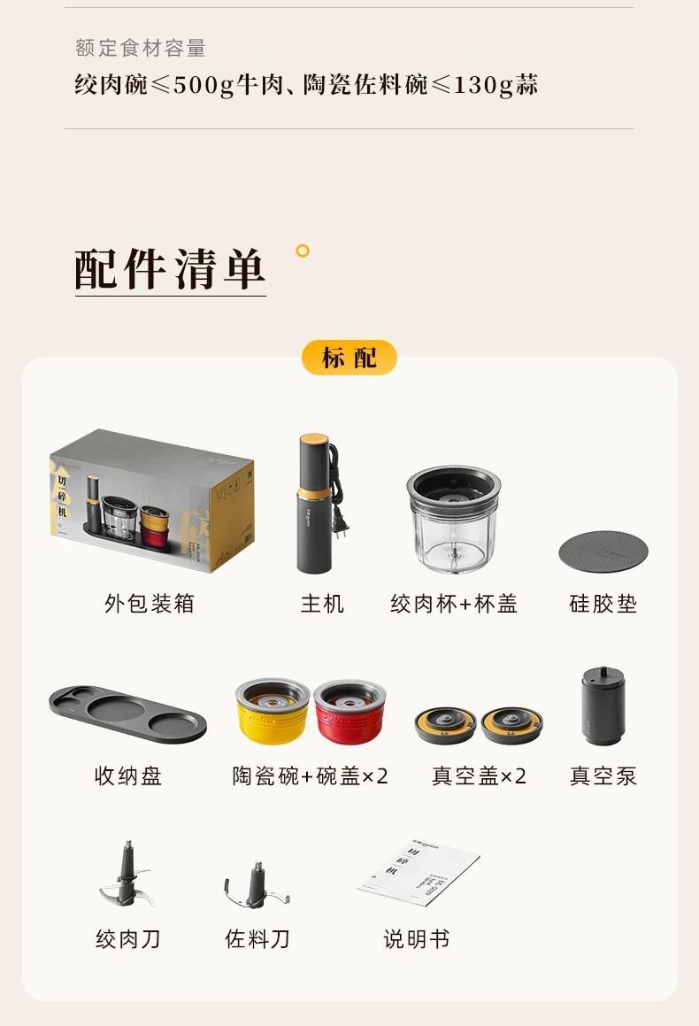 容 量 : 1.6L(大碗)、0.5L*2(小碗)、1480ML真空玻璃保鲜盒 功 率 : 400W 毛 重 : 4.08kg 真 空 吸 力: 50-60KPa 产 品 尺 寸: 384*160*230mm 包 装 尺 寸: 448*204*218mm 1.三碗双刀分类备料保鲜一步到位 2.一键抽真空精 确保鲜,计时存储更清晰 3.一机满足全家肉馅、辅食、真空保鲜 4.特设收纳座,配件摆放不凌乱 5.配置1480ML玻璃真空保鲜盒
