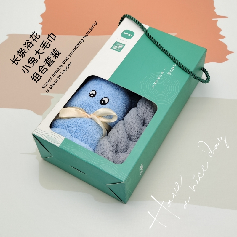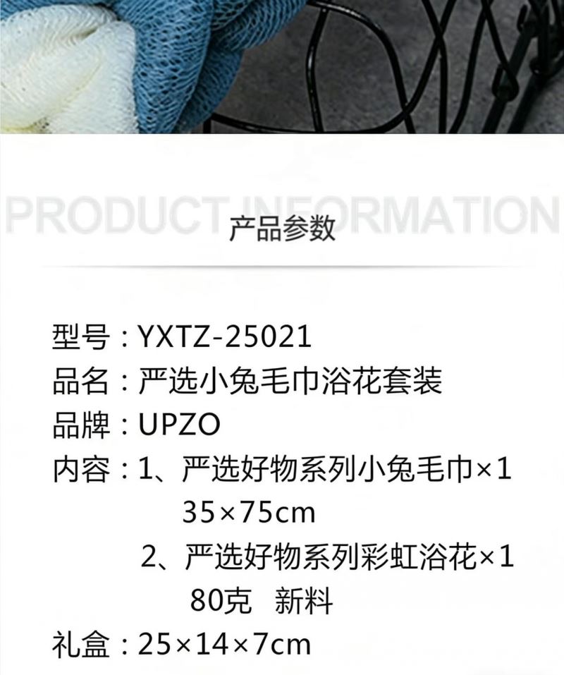 型号: YXTZ-25021 产品内容: 1、严选好物系列小兔毛巾×1 35*75CM 平方克重300克 精致包边工艺 2、严选好物系列彩虹浴花×1 80克 新料 外盒:25×14×7cm 卫浴小套装