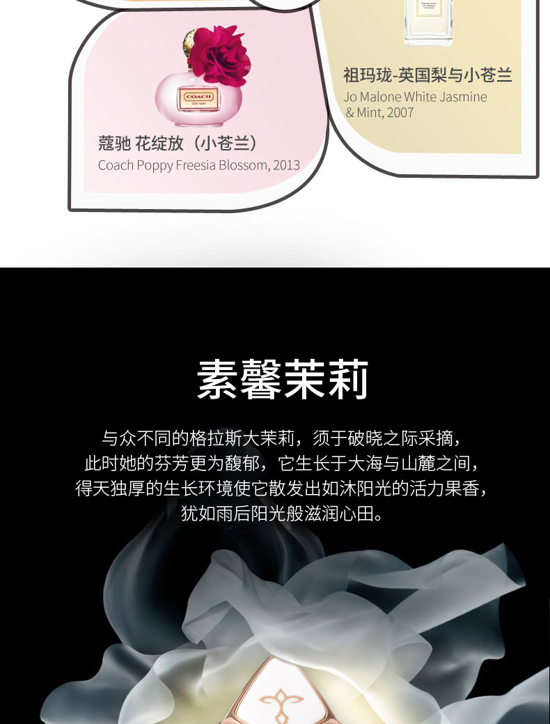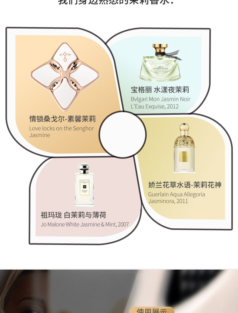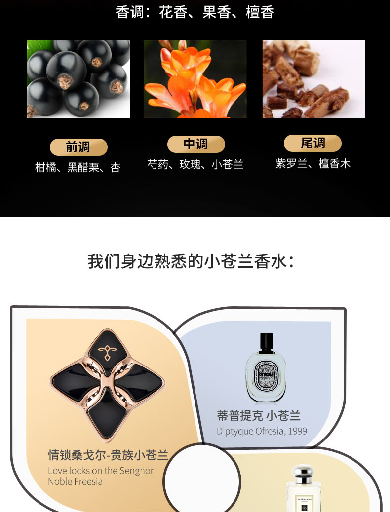 设计灵感 情锁桑戈尔设计灵感源自法国的桑戈尔行人桥,这是法国浪漫的爱情锁桥之一。相传相爱的恋人只要在这里结一把刻有双方姓名的同心锁,就能心心相犀,相爱到老。世界各地的情侣来到这里,为了见证自己的爱情,都会挂上属于他们的锁,祈祷爱情终将圆满。 设计师为了追随这种浪漫的风潮,以心灵相交的锁扣设计来再现爱情的浪漫、自由,表达情侣们祈祷爱情圆满的心愿 黑色:贵族小苍兰+2不同香型香片; 白色:素馨茉莉+2个不同香型香片 香片替换装、手袋