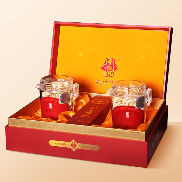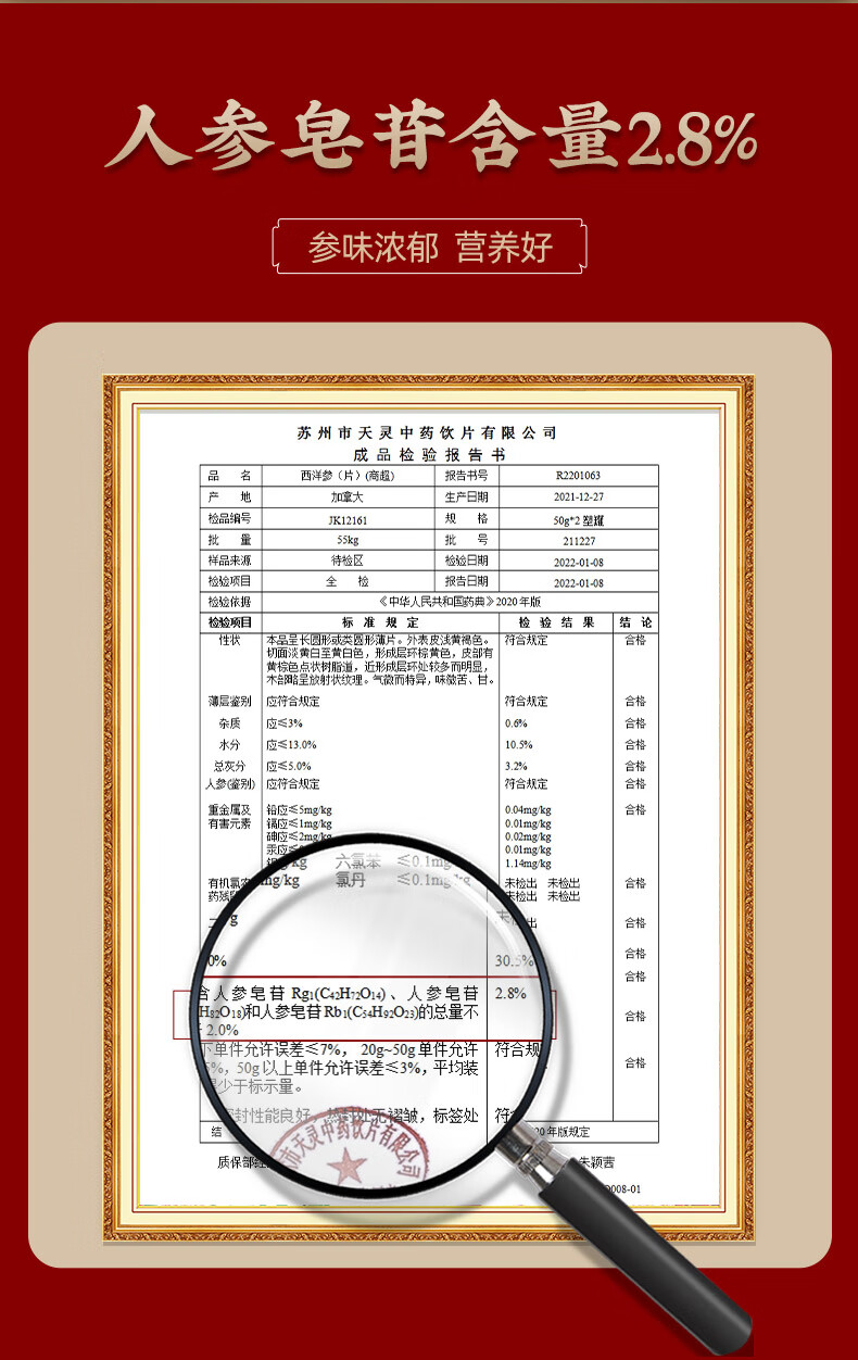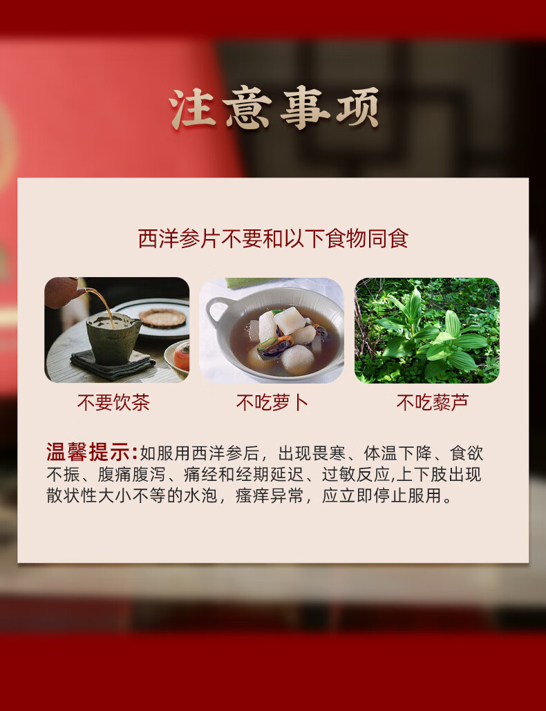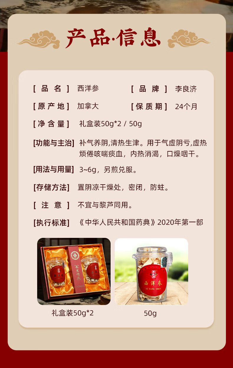 产品:李良济西洋参片100克礼盒 规格:西洋参刨片50克*2瓶 用法与用量:开水冲泡,每日建议食用量3-6克 贮藏方法:置阴凉干燥处,密封,防蛀 加拿大进口西洋参,包装精美 足龄老参,片薄均匀