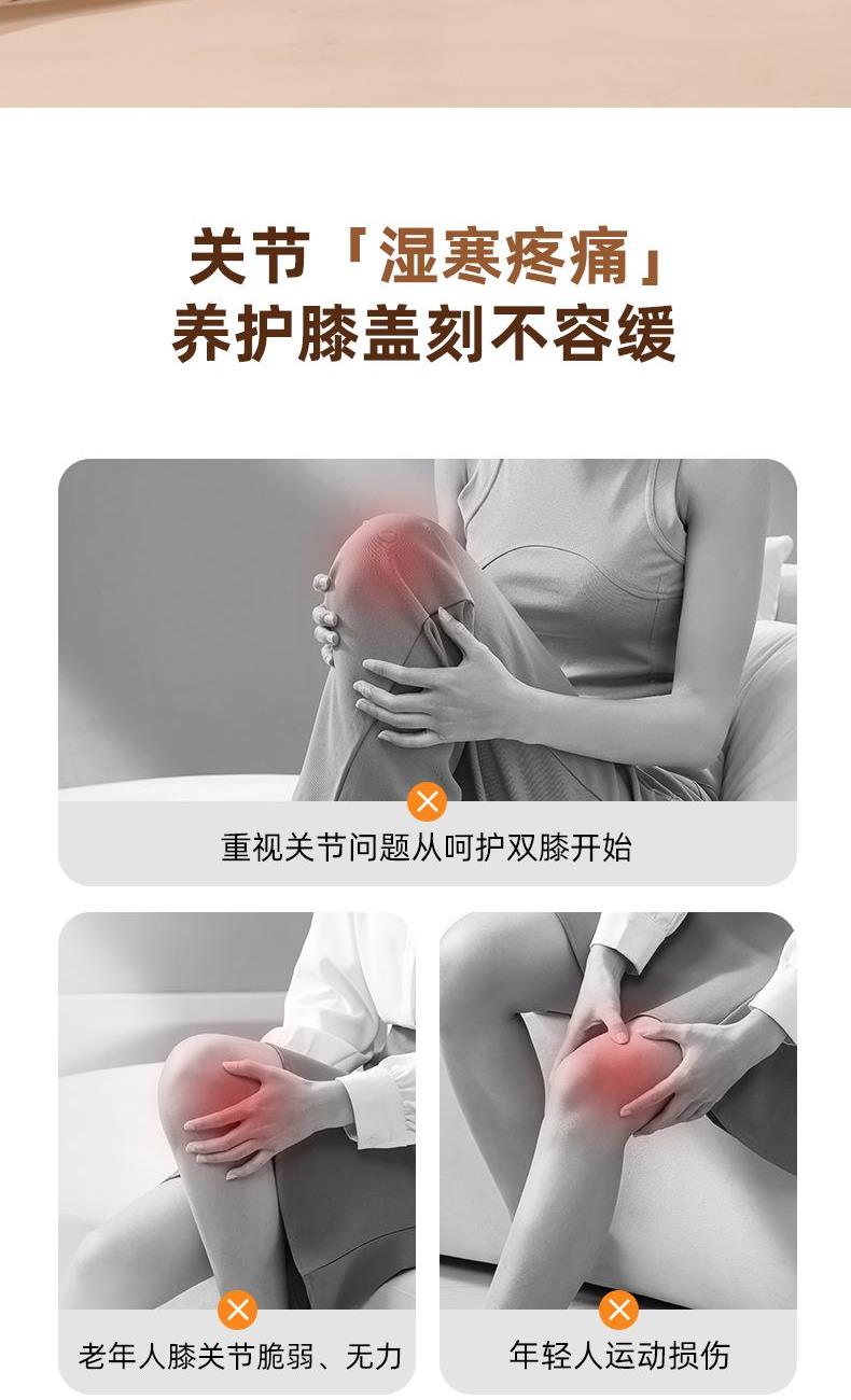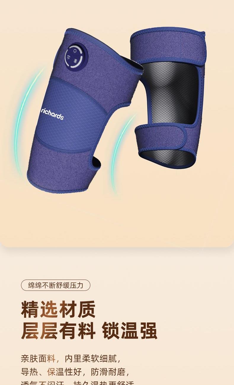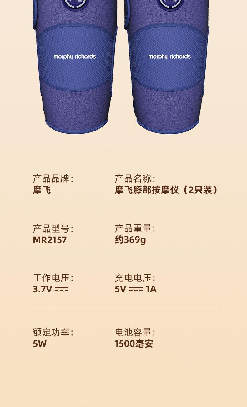 型号 MR2157 69码 '6975660321571 产地 浙江温州 净重 368.5g 毛重 630g 包装尺寸 30X21.5X7.5cm(彩盒) 大箱尺寸 50X45X32.5cm 续航: 约4个循环(默认工作时间20min) 充电时间:约80min 充电电压:5V1A 额定功率:5w 工作电压:3.7V 充电接口:Type-C 电池容量:1500毫安 执行标准:GB4706.1-2005/GB4706.10-2008 配件:主机*2,延长带*2,艾草包*2,充电线 卖点: 立体包裹关节,贴合舒适 3档温感,配合艾草包,大面积热敷,温暖老寒腿 3种震动按摩,三档力度调节 亲肤面料,柔和透气,久戴舒适 增加延长带,可肩、肘、膝多部位按摩 2只装,简易操作左右同步按摩 穿戴舒适升级,全包裹、贴合、轻便 品质值得信赖,用的放心舒心,送的安心有面