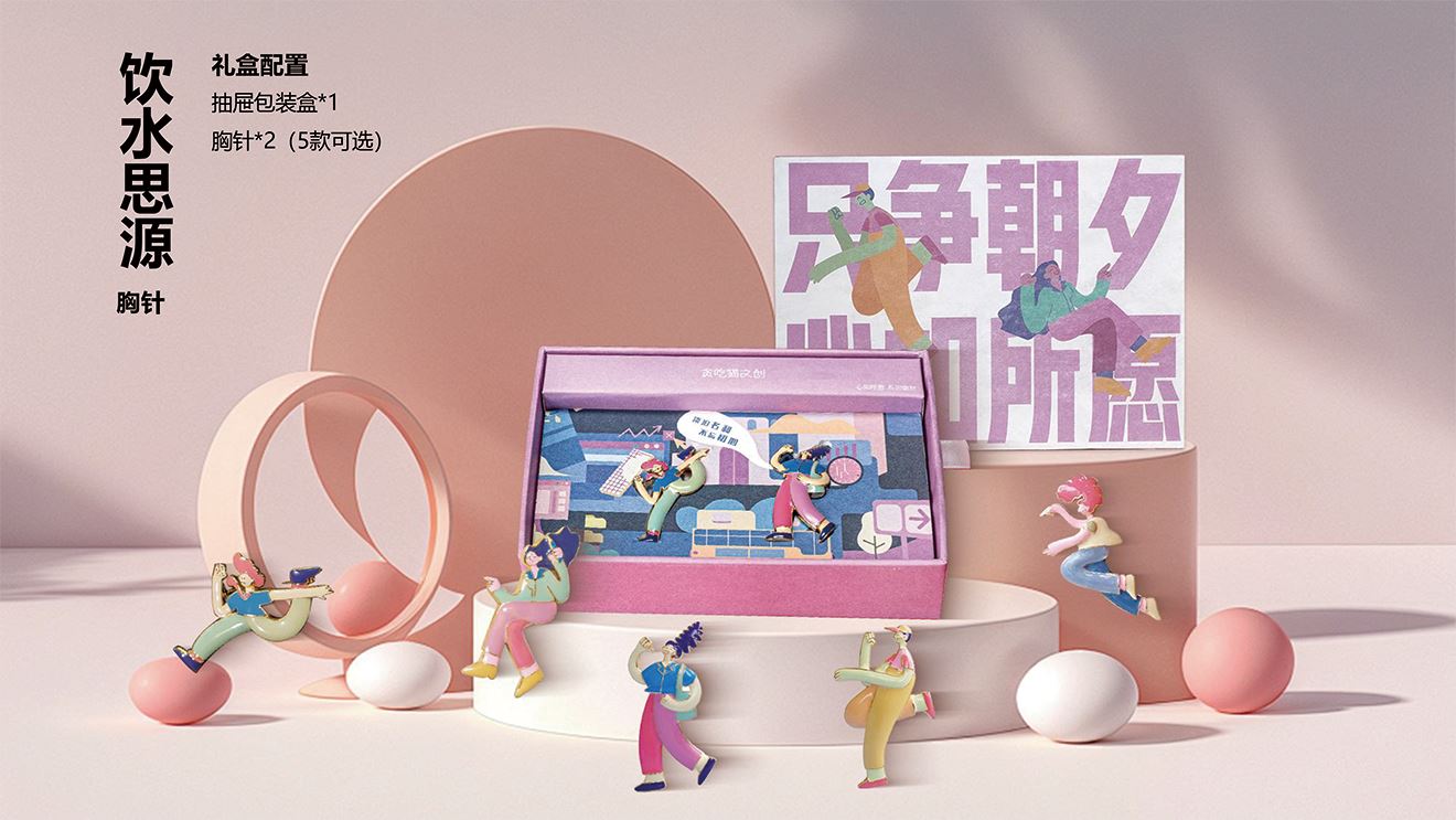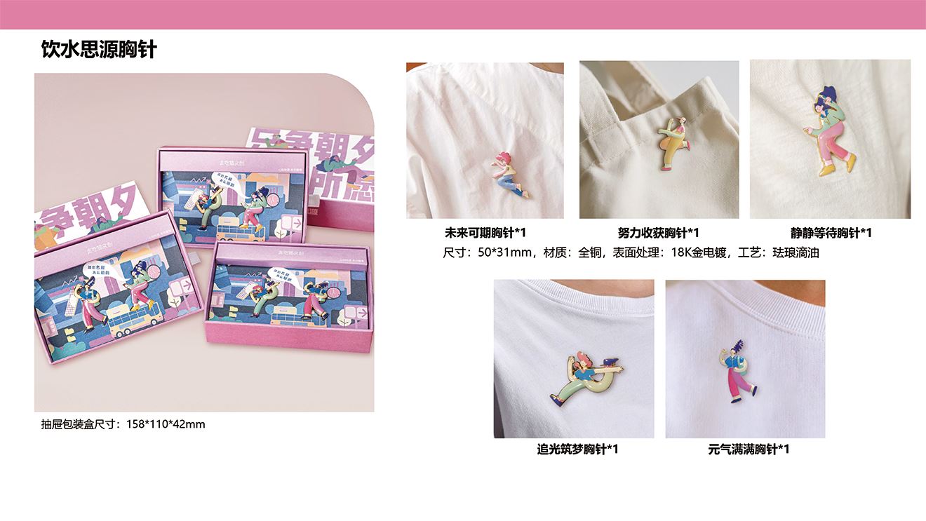 抽屉包装盒*1 胸针*2(未来可期胸针、努力收获胸针、静静等待胸针、追光筑梦胸针、追光筑梦胸针5款可选) 尺寸:50*31mm,材质:全铜,表面处理:18K金电镀,工艺:珐琅滴油 抽屉包装盒尺寸:158*110*42mm