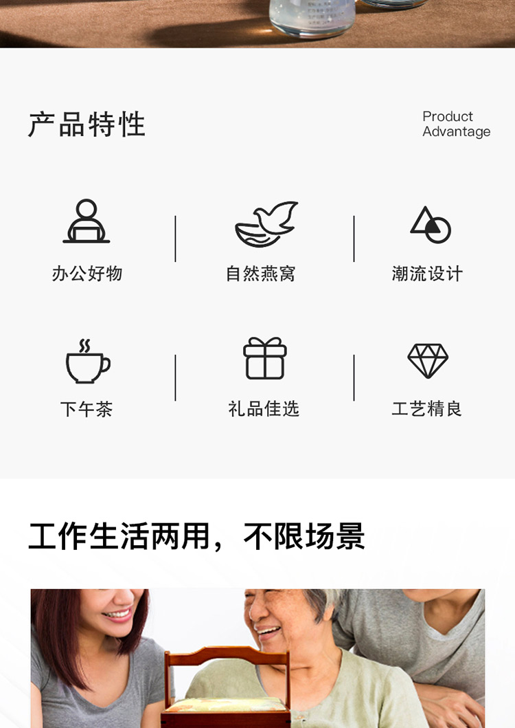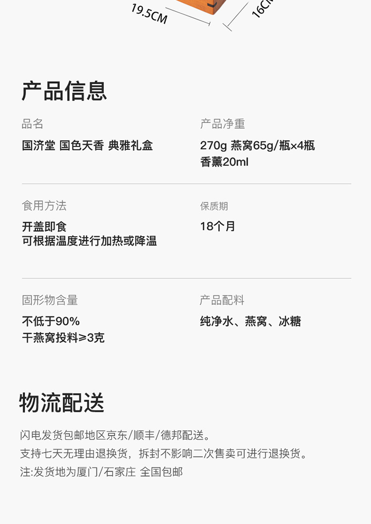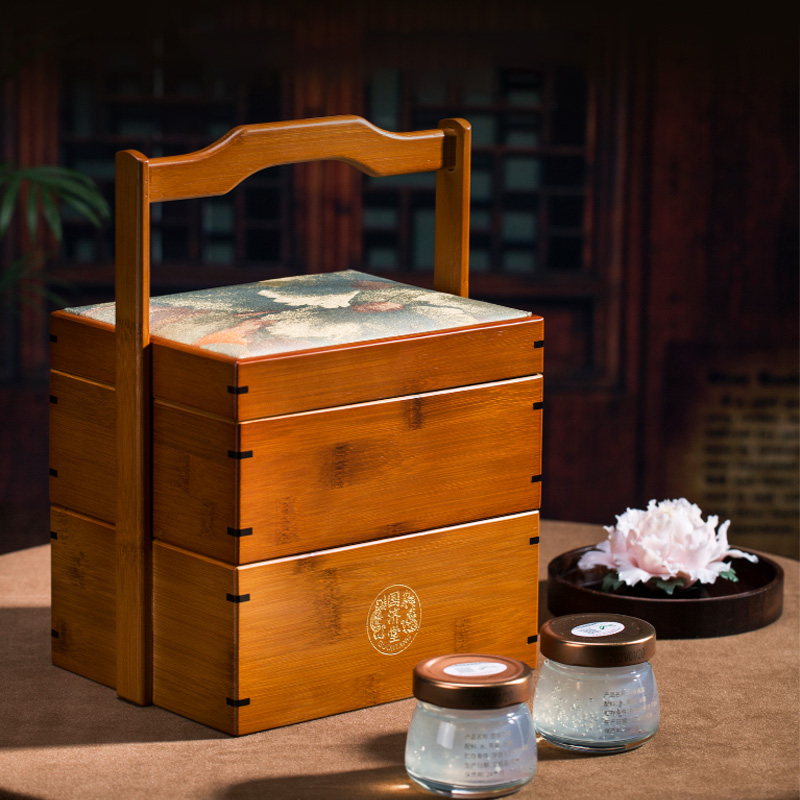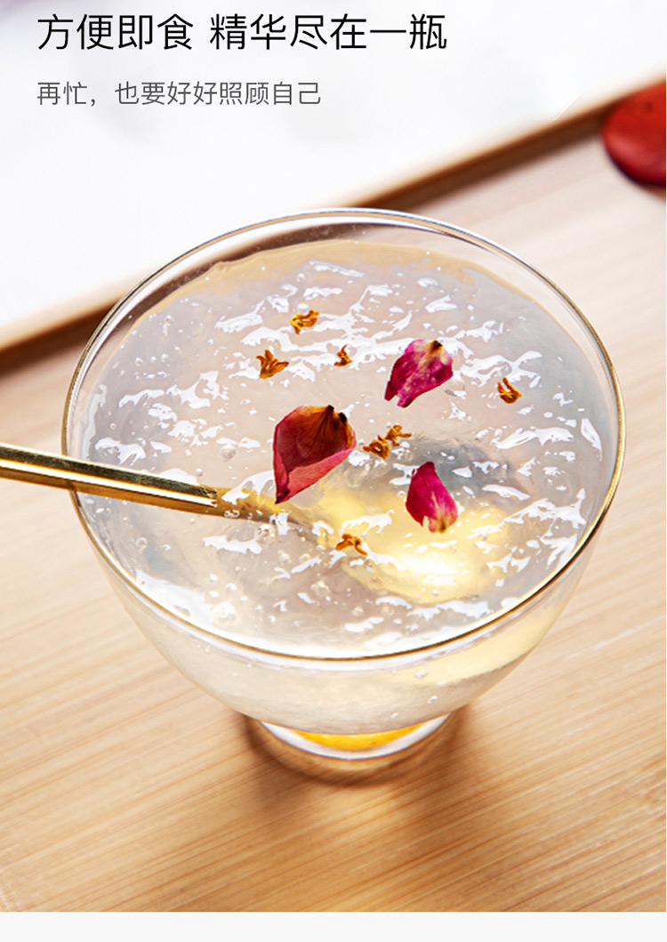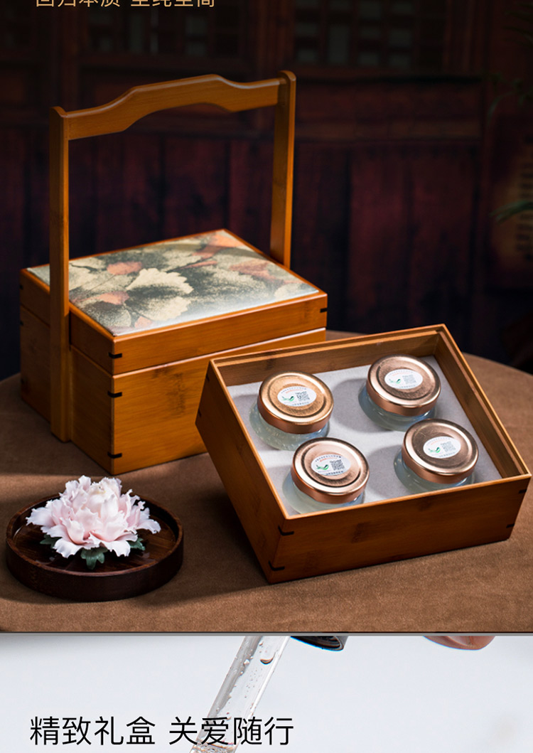 规格: 高浓度燕窝65g*4瓶干燕窝含量≥3克; 手工陶瓷牡丹花*1香薰*1 配料:纯净水、燕窝、冰糖 食用方法:开盖即食,建议晨起空腹和睡前半小时各饮一瓶 产品特点: 燕窝纯手工挑毛,99%洁净标准, 唾液酸含量每瓶不低于248mg 生产过程全程纯净水,SGS国际认证, 燕窝含量极高;竹木外盒一物多用 礼盒大气,女士喜爱。内含陶瓷牡丹花、香薰各一种
