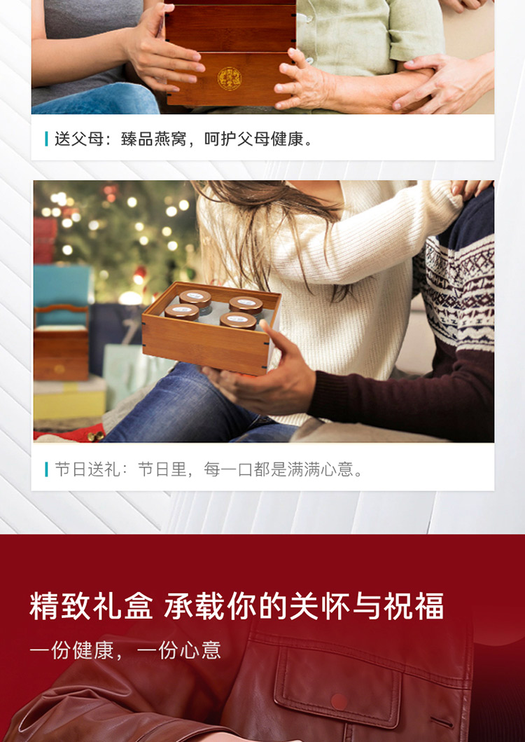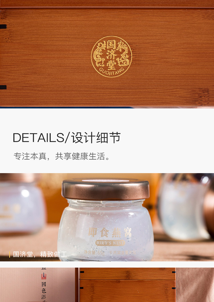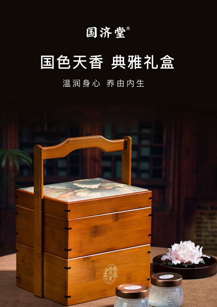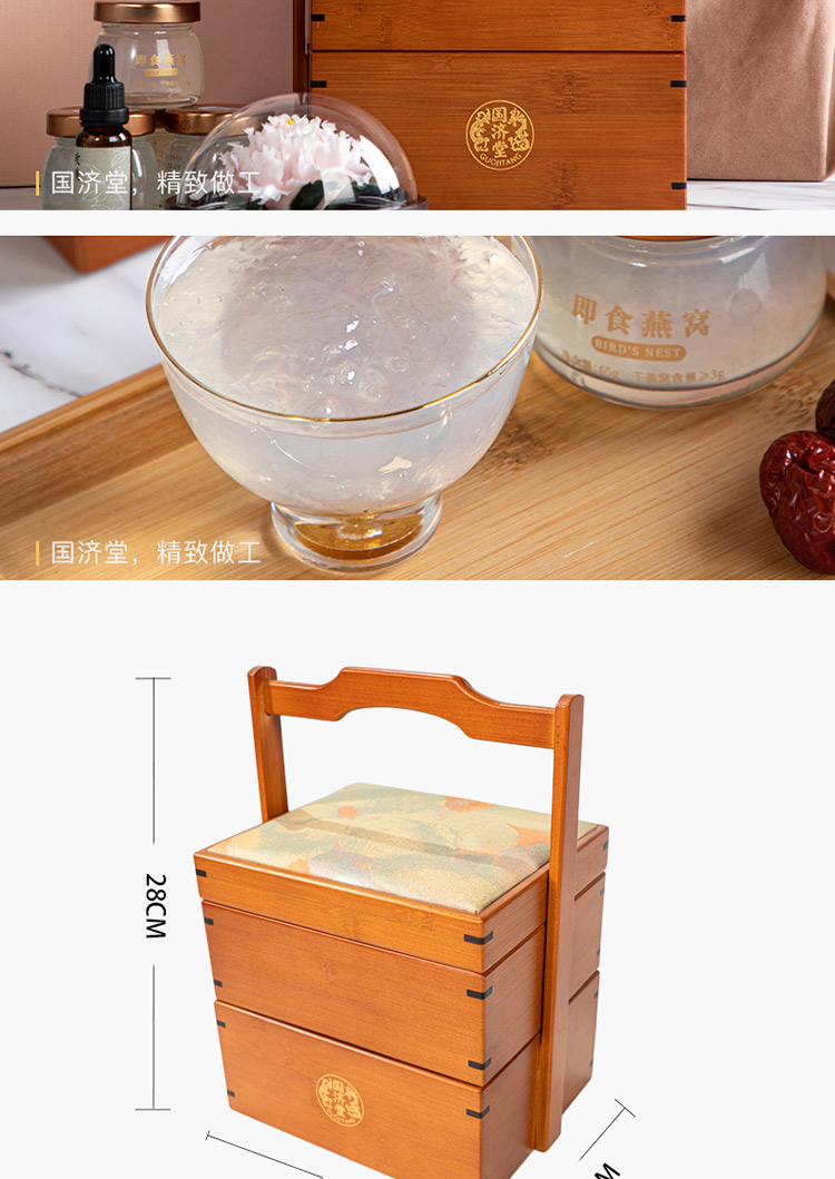 规格: 高浓度燕窝65g*4瓶干燕窝含量≥3克; 手工陶瓷牡丹花*1香薰*1 配料:纯净水、燕窝、冰糖 食用方法:开盖即食,建议晨起空腹和睡前半小时各饮一瓶 产品特点: 燕窝纯手工挑毛,99%洁净标准, 唾液酸含量每瓶不低于248mg 生产过程全程纯净水,SGS国际认证, 燕窝含量极高;竹木外盒一物多用 礼盒大气,女士喜爱。内含陶瓷牡丹花、香薰各一种